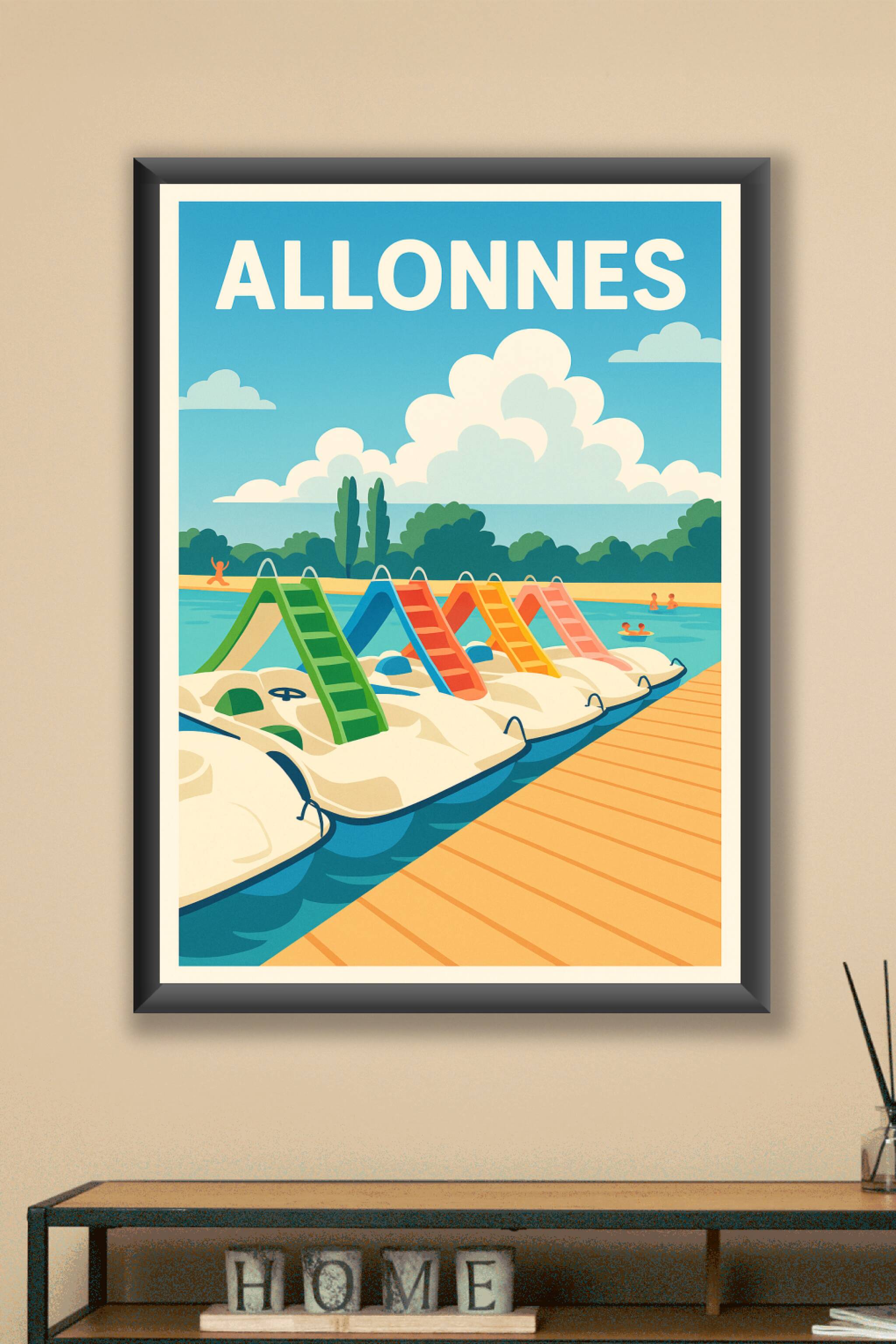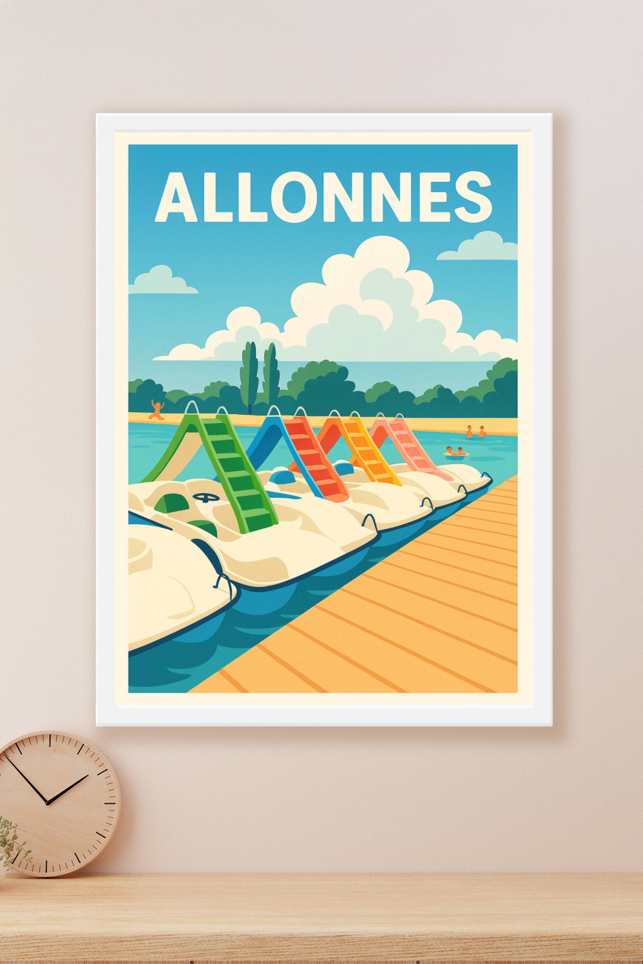 Découvrez la fraîcheur et la convivialité d'Allonnes avec cette affiche colorée illustrant une scène estivale pleine de bonne humeur au bord d'un l...