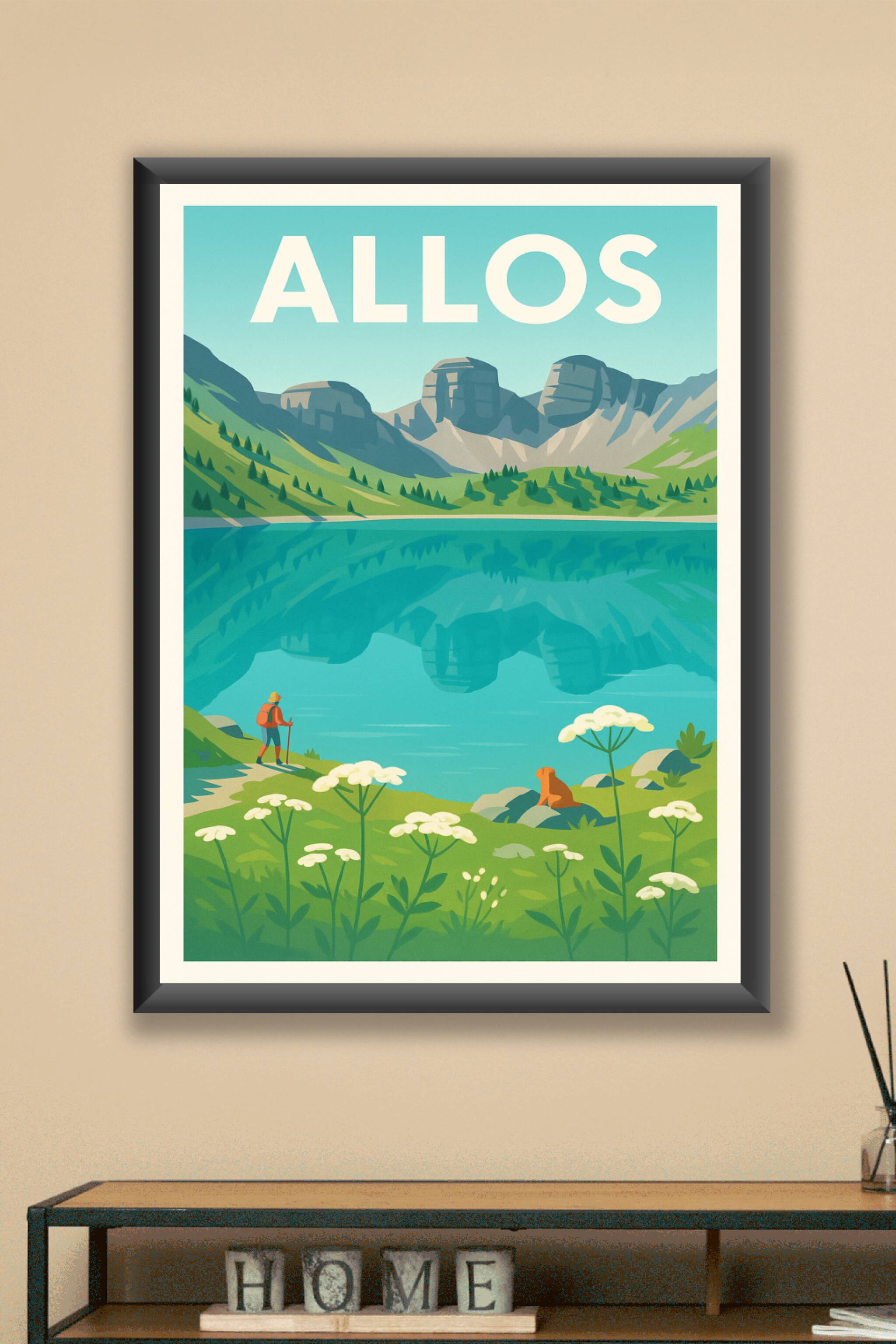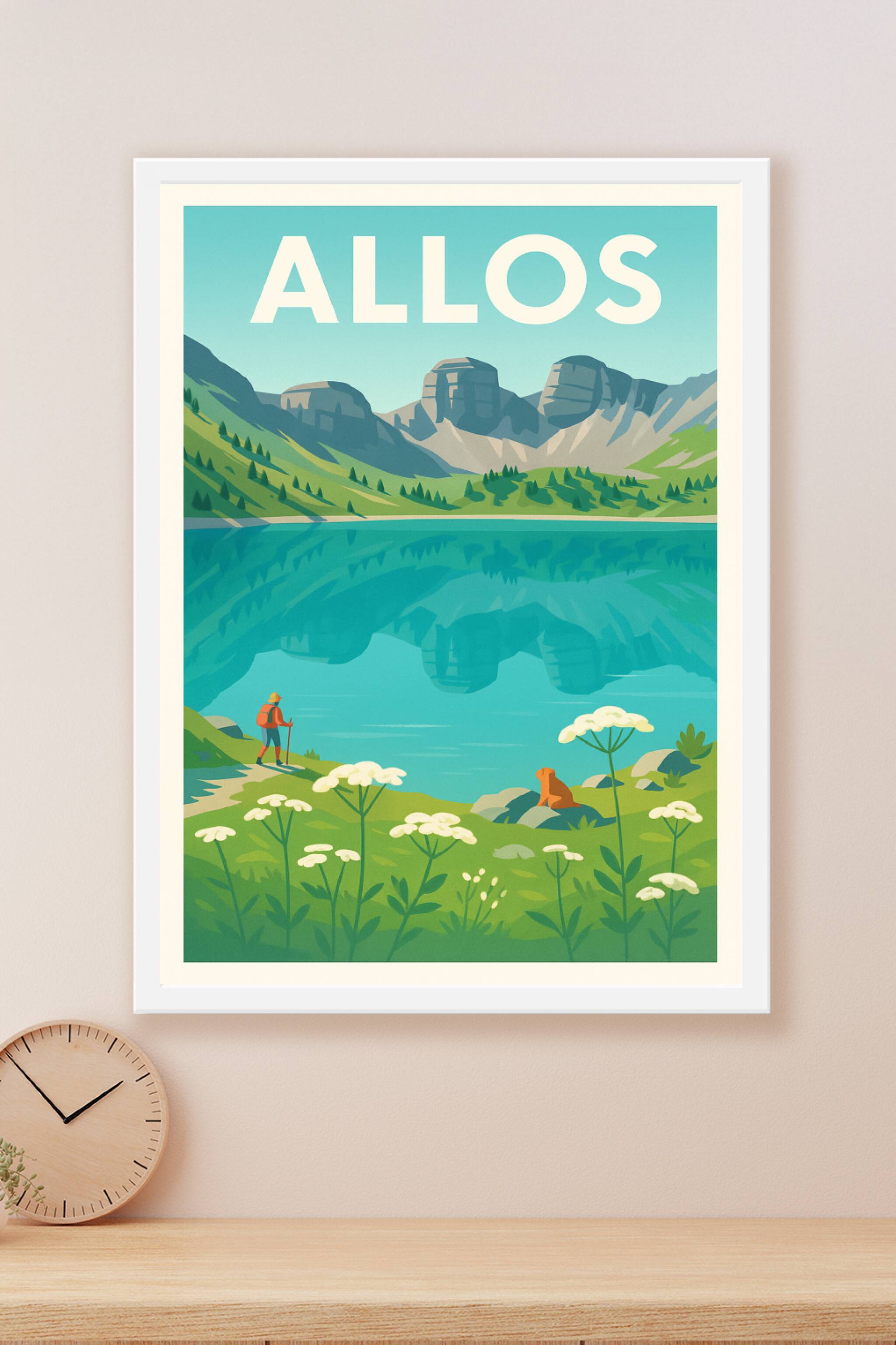 Découvrez la sérénité des paysages d'Allos avec cette affiche au style vintage mettant en scène un randonneur et son chien face au lac turquoise en...