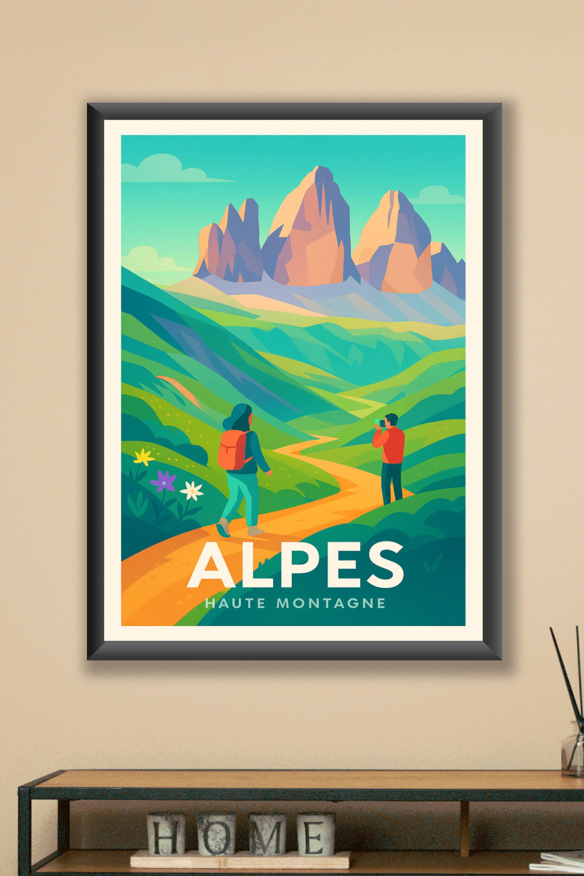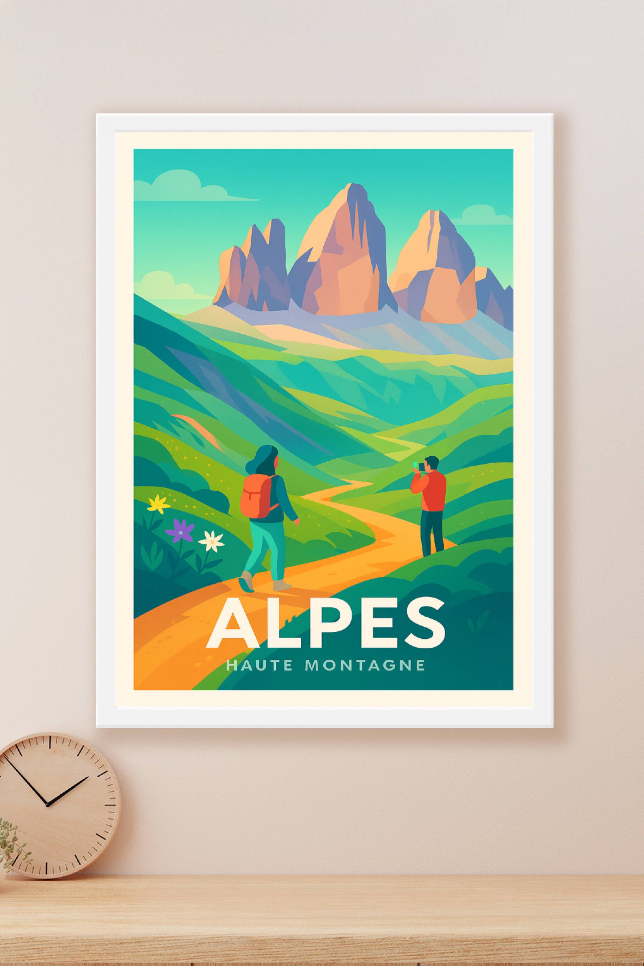 Découvrez la beauté majestueuse des Alpes avec cette affiche illustrée au style coloré et moderne. Ce poster met en scène une randonnée paisible da...