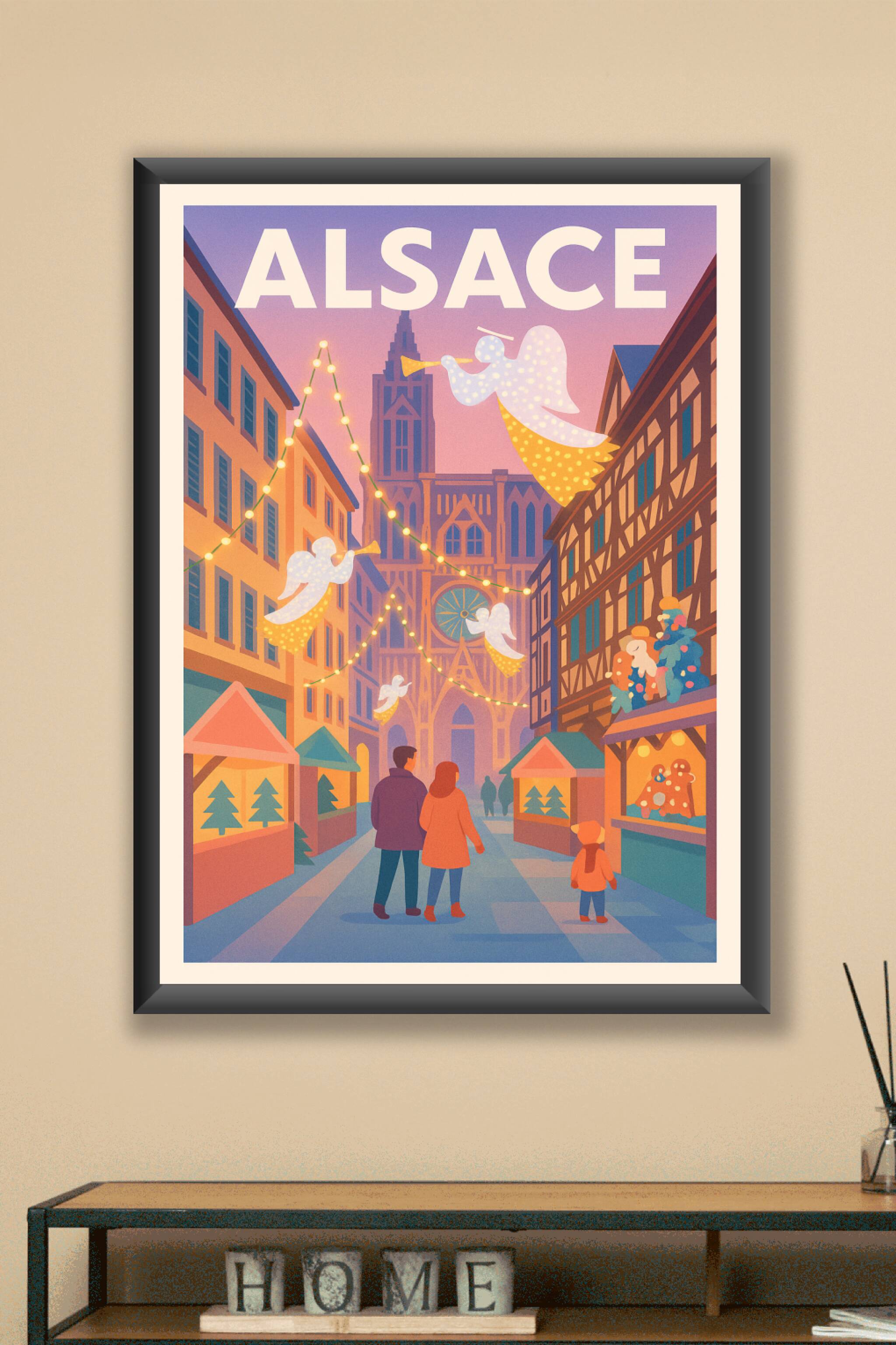 Découvrez la féerie des marchés de Noël alsaciens à travers cette affiche illustrée qui capture l'ambiance chaleureuse et festive de la région. Les ruelles décorées, les anges lumineux et la majestueuse cathédrale au crépuscule vous transportent dans un univers enchanteur. Ce poster est imprimé en tirage "Fine Art" sur papier 305g coton, garantissant une qualité d'impression exceptionnelle et des couleurs éclatantes. Disponible en formats A1 à A4, avec ou sans cadre, cette affiche apportera une touche d'élégance et de tradition à votre décoration intérieure. Parfait pour sublimer votre chez-vous ou offrir un souvenir raffiné de l'Alsace.