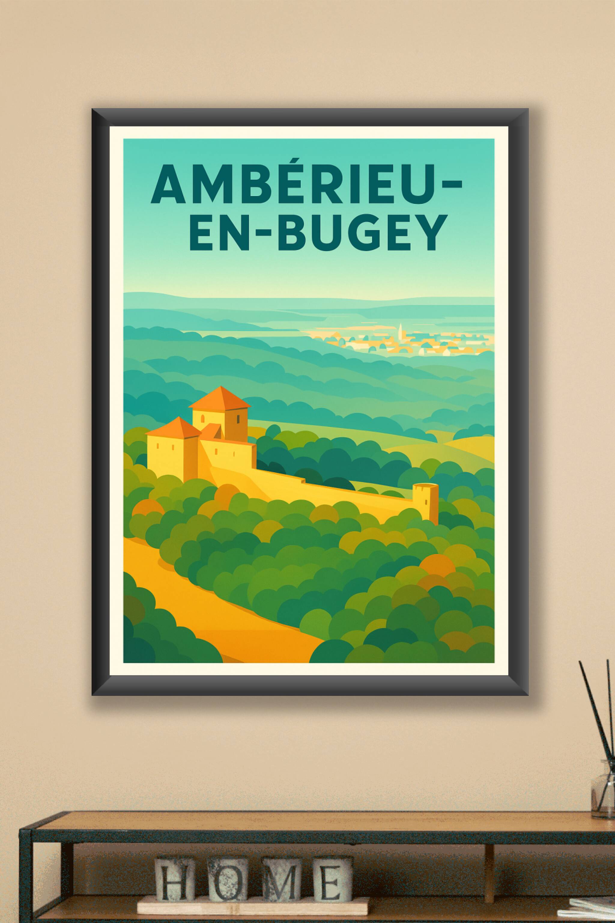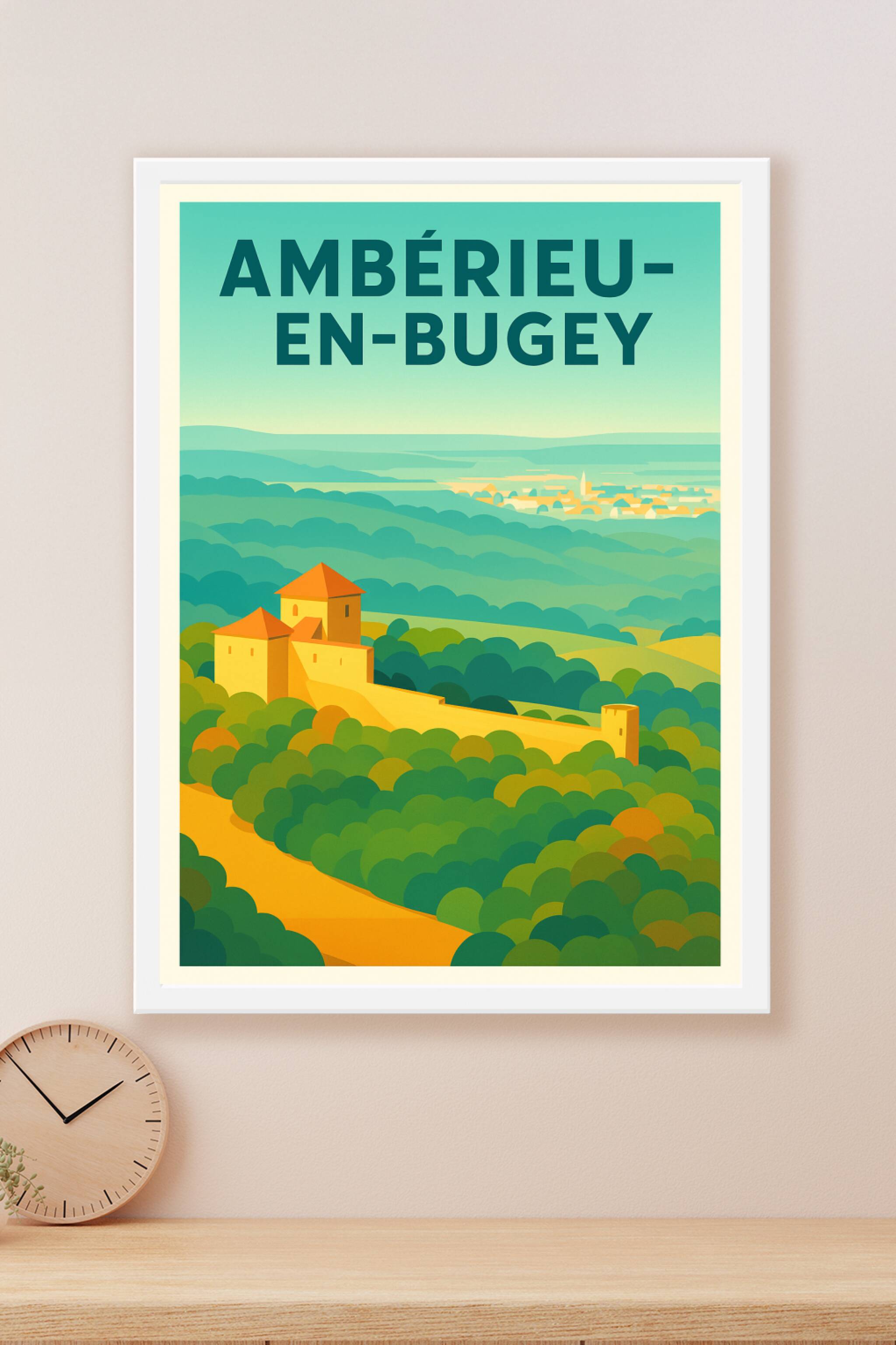 Découvrez la beauté naturelle et historique d'Ambérieu-en-Bugey avec cette affiche au style graphique et coloré qui met en lumière son château et s...