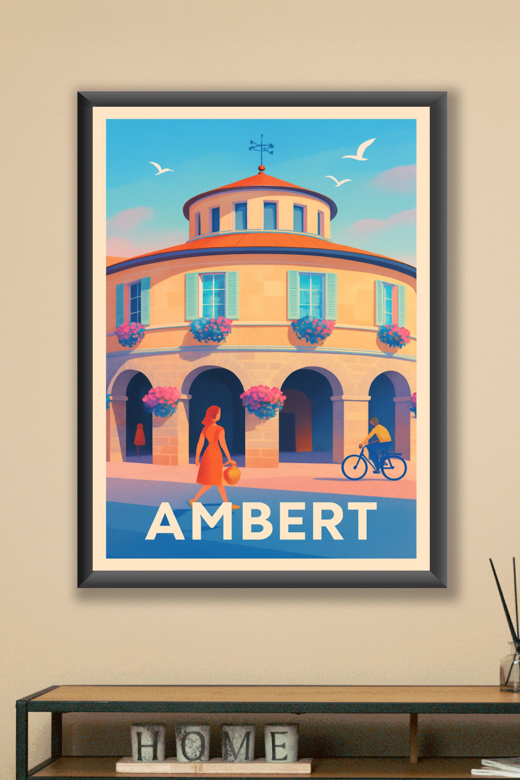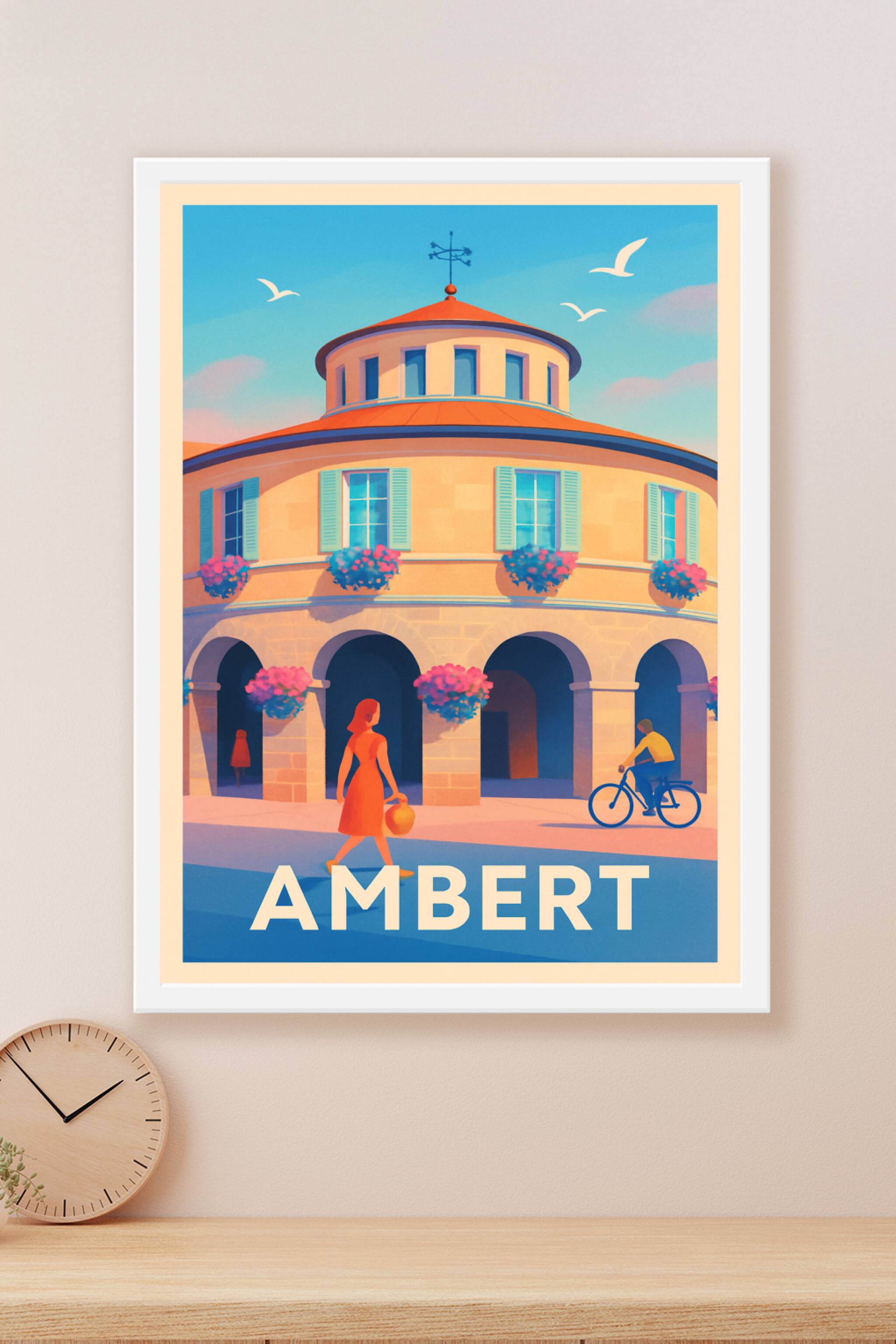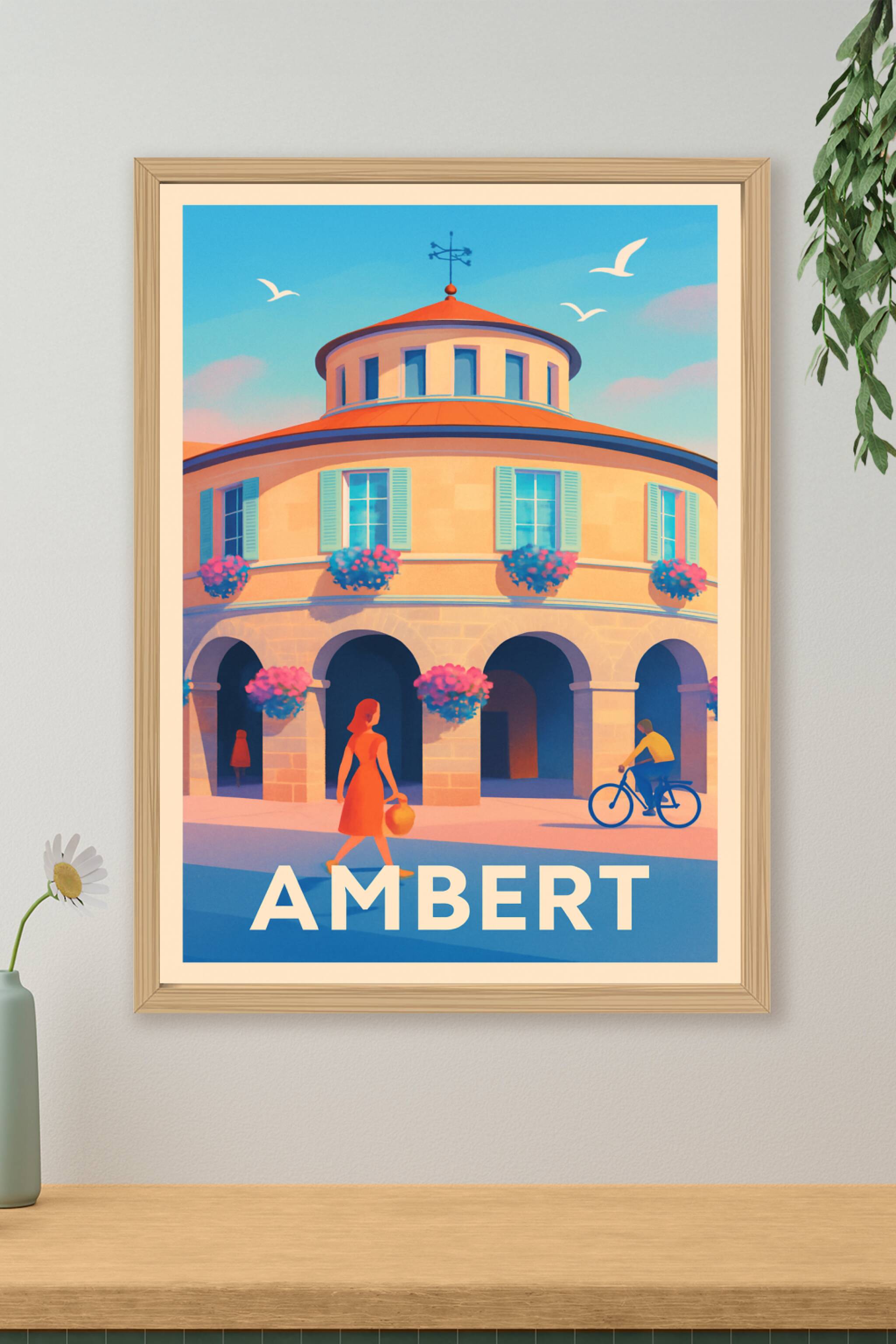 Découvrez la magie d'Ambert avec cette affiche au style délicieusement rétro, représentant une scène paisible devant un bâtiment aux arcades caract...