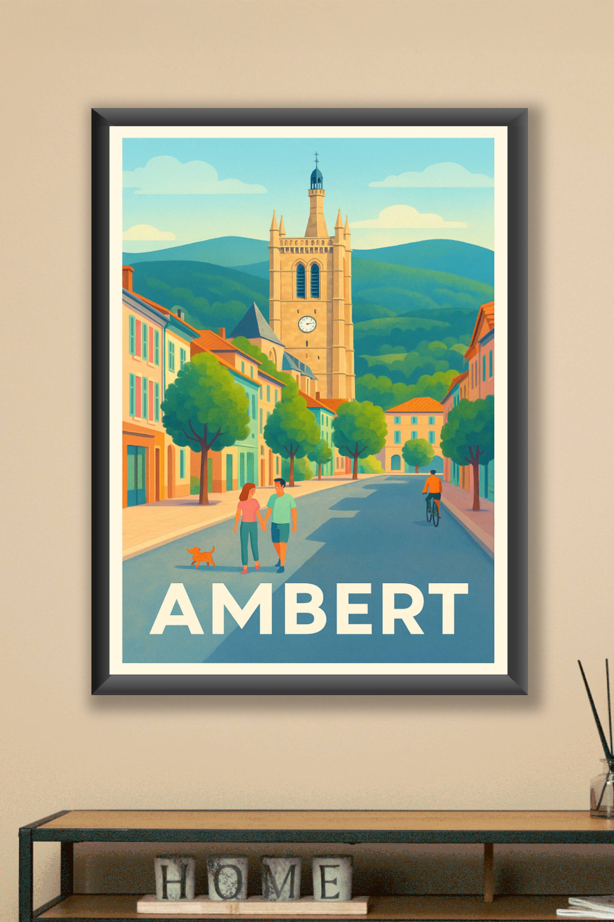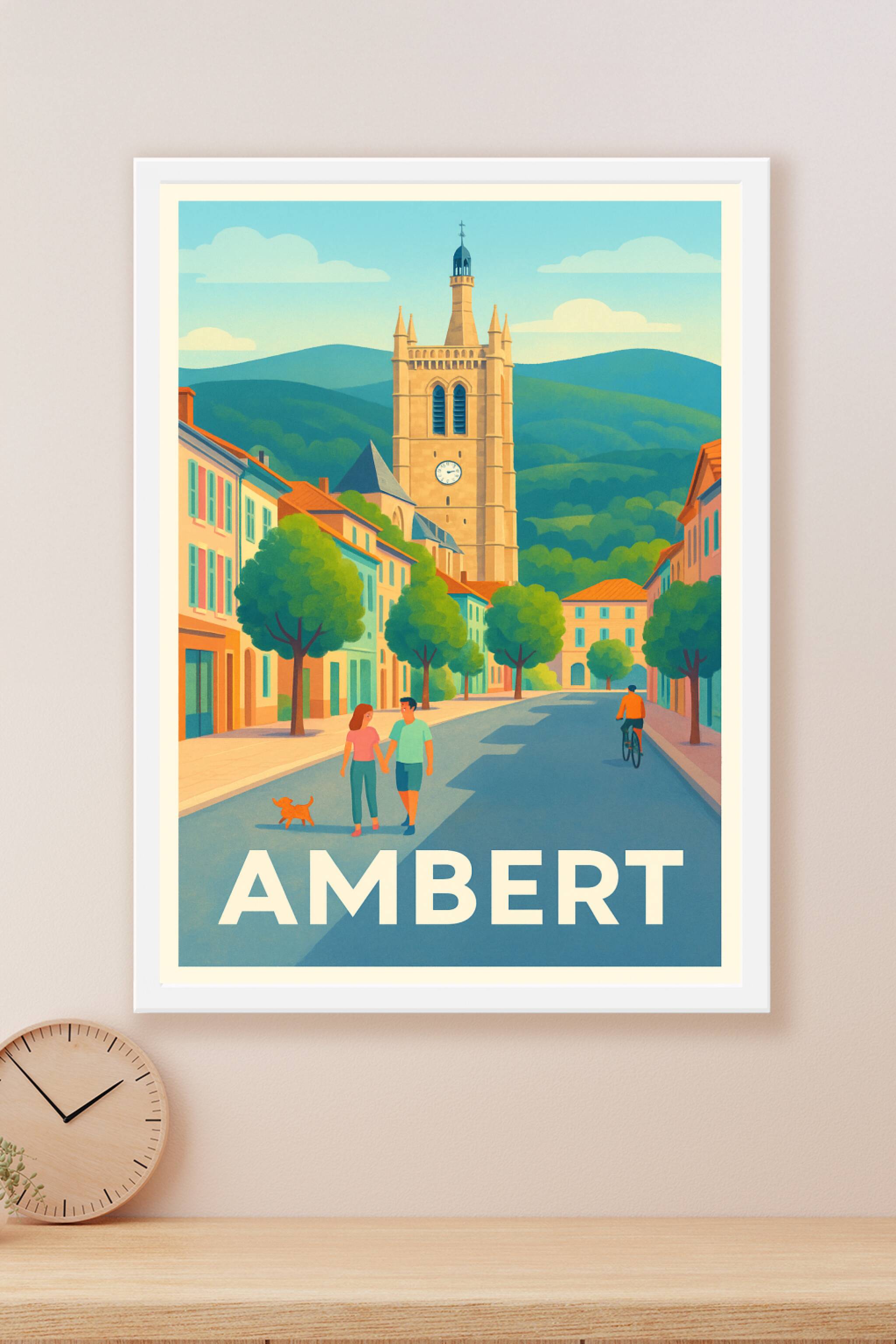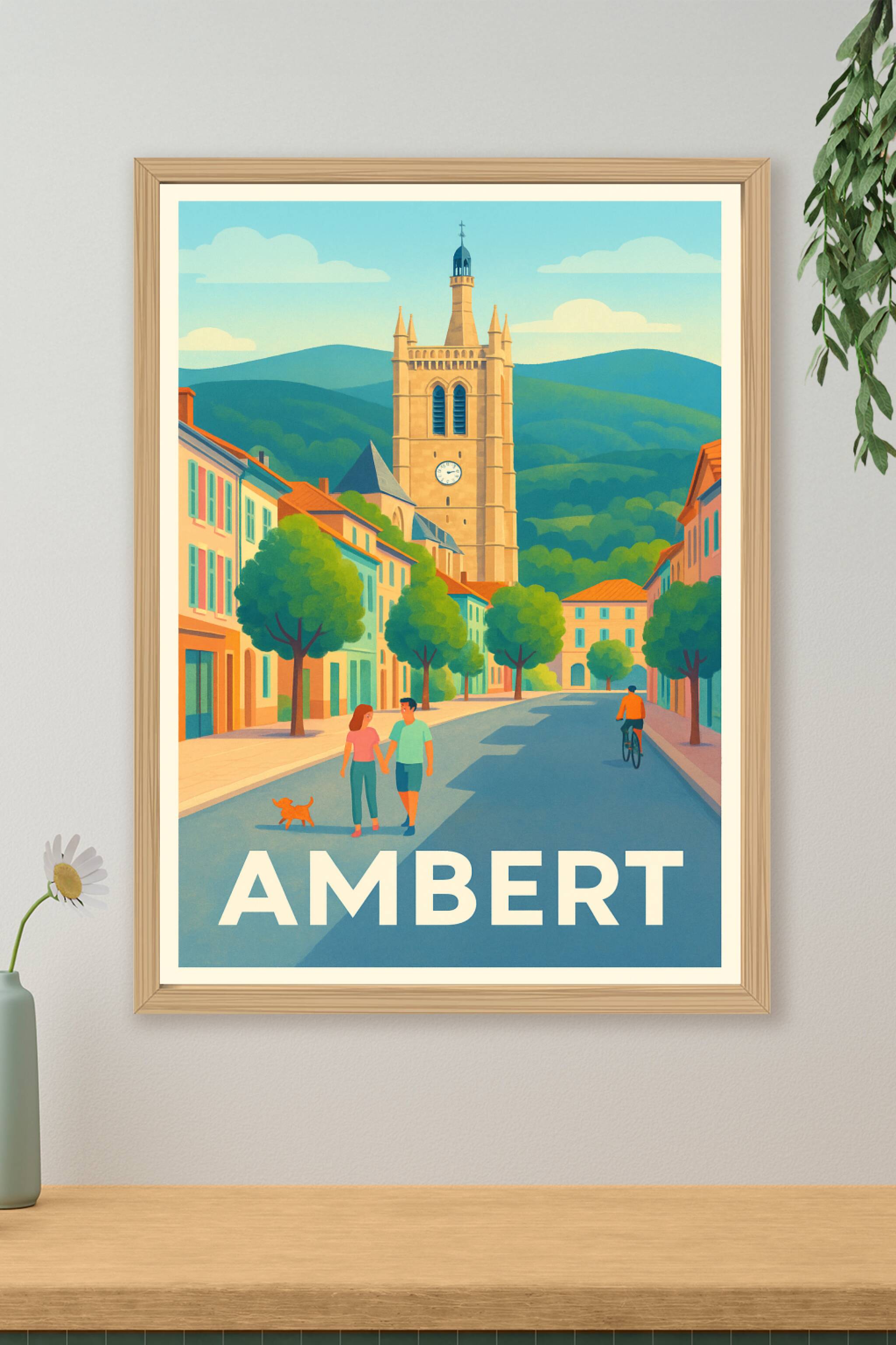 Découvrez l'élégance tranquille d'Ambert à travers cette affiche illustrée qui met en avant ses rues bordées d'arbres et l'imposante tour de l'égli...