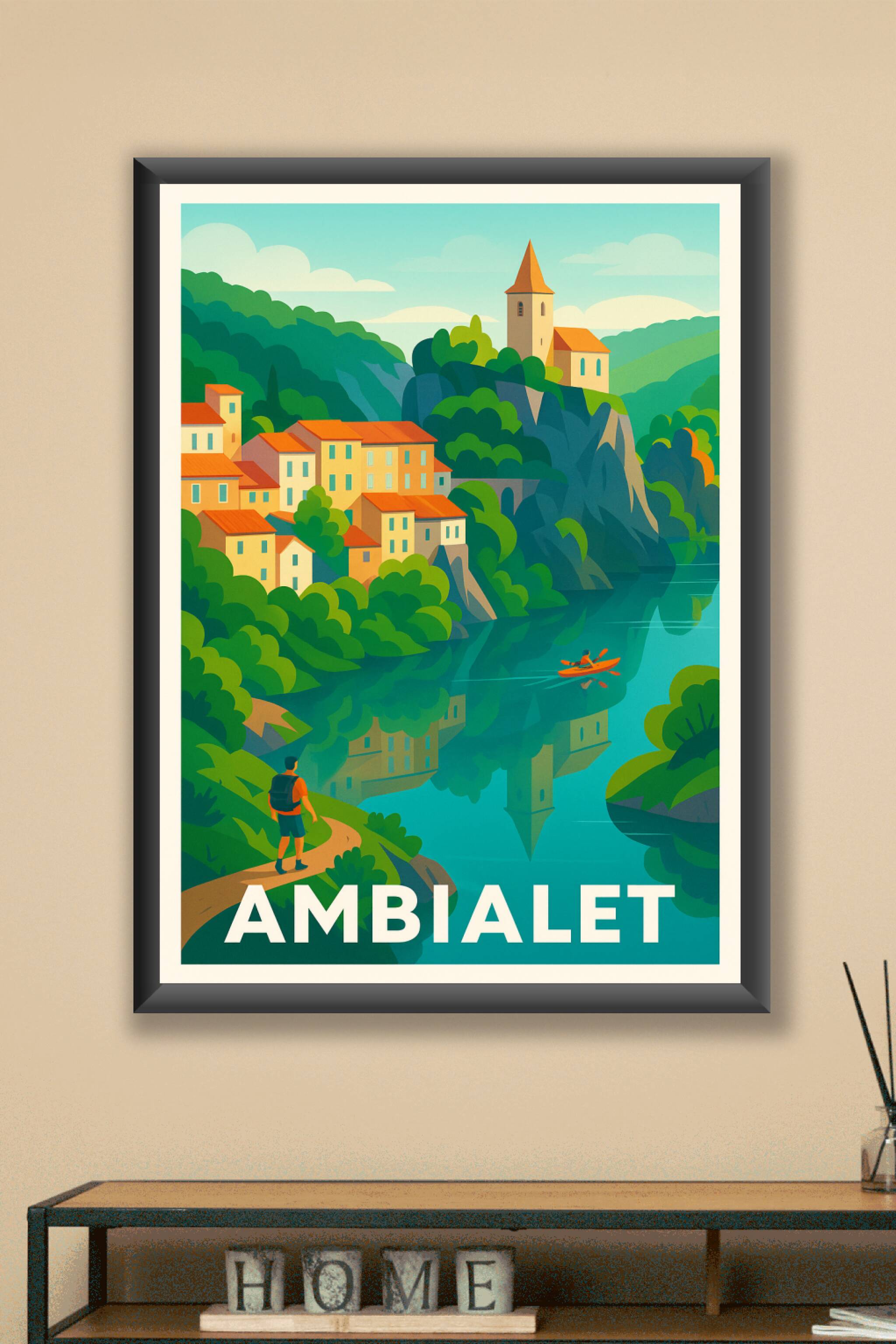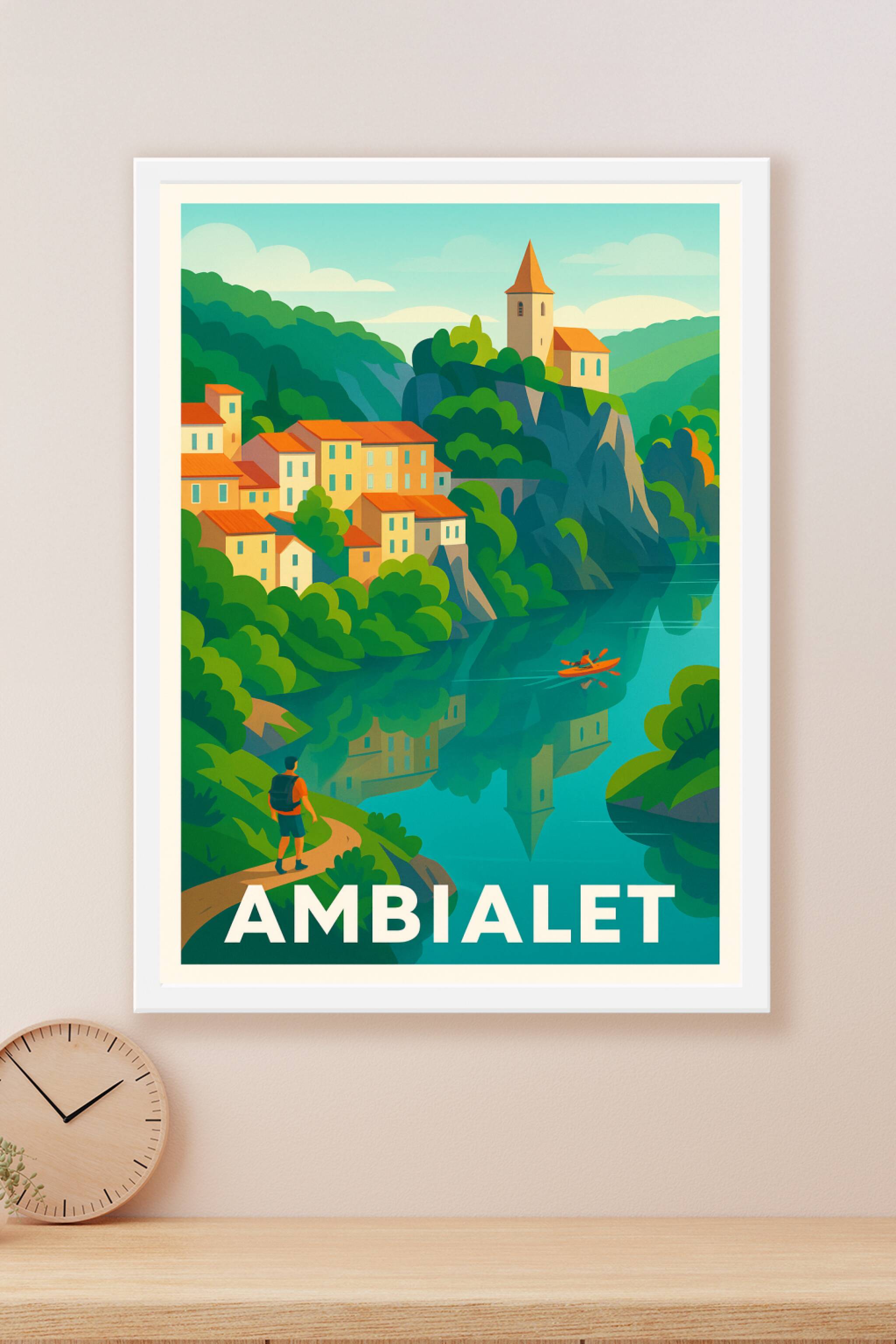 Découvrez la quiétude d'Ambialet avec cette affiche illustrée qui capture l'essence de ce charmant village niché au cœur d'un paysage de collines v...