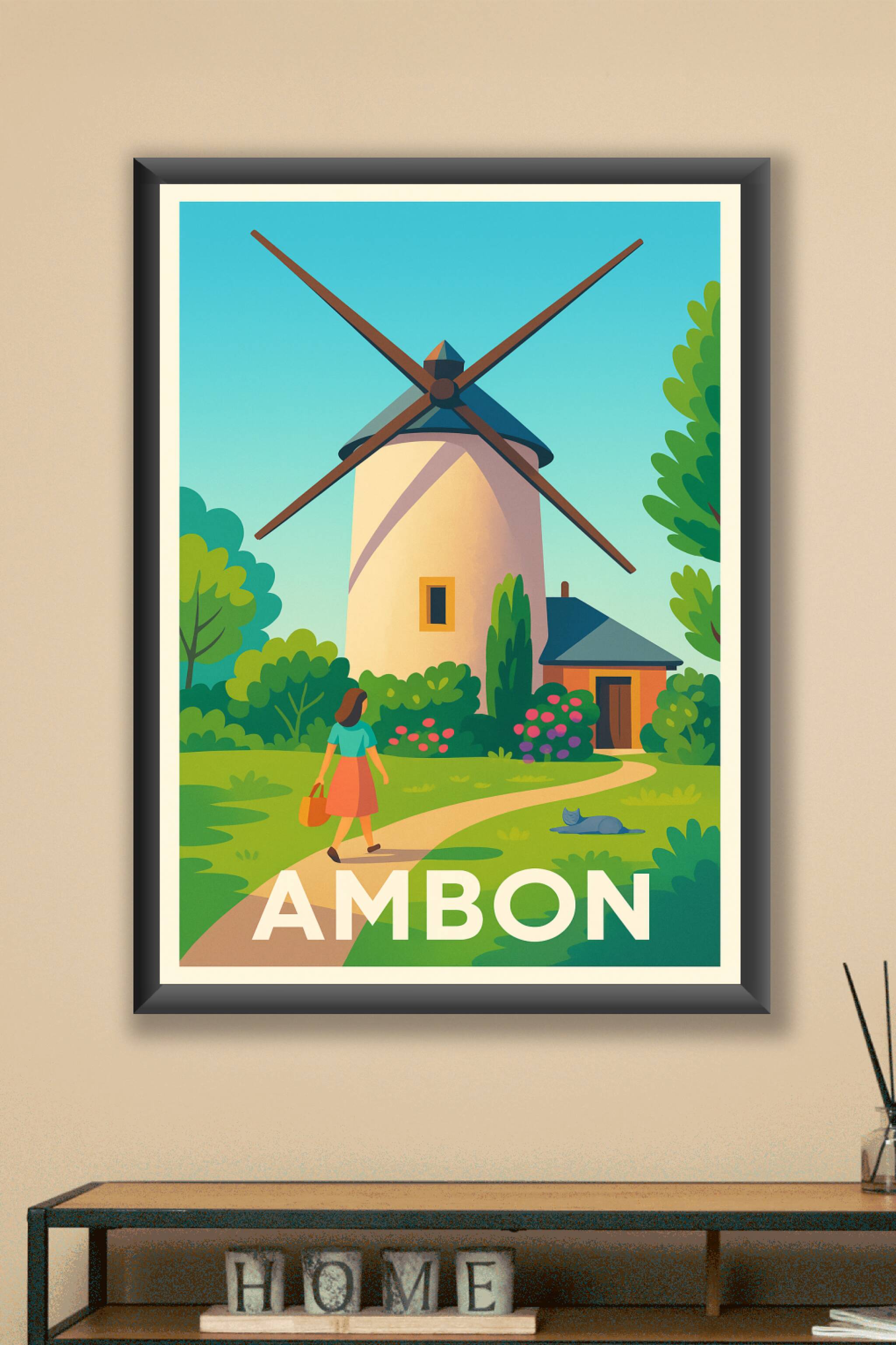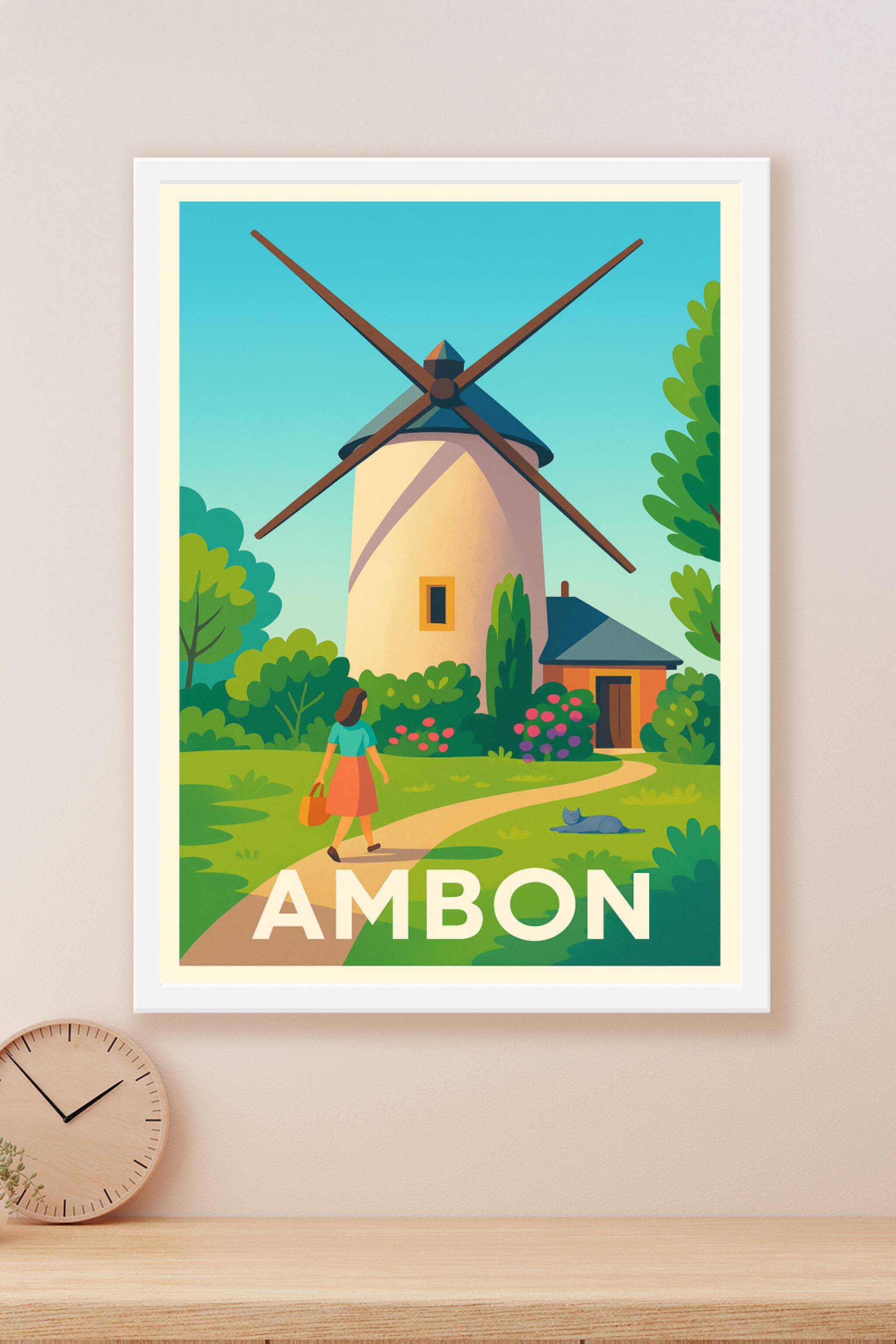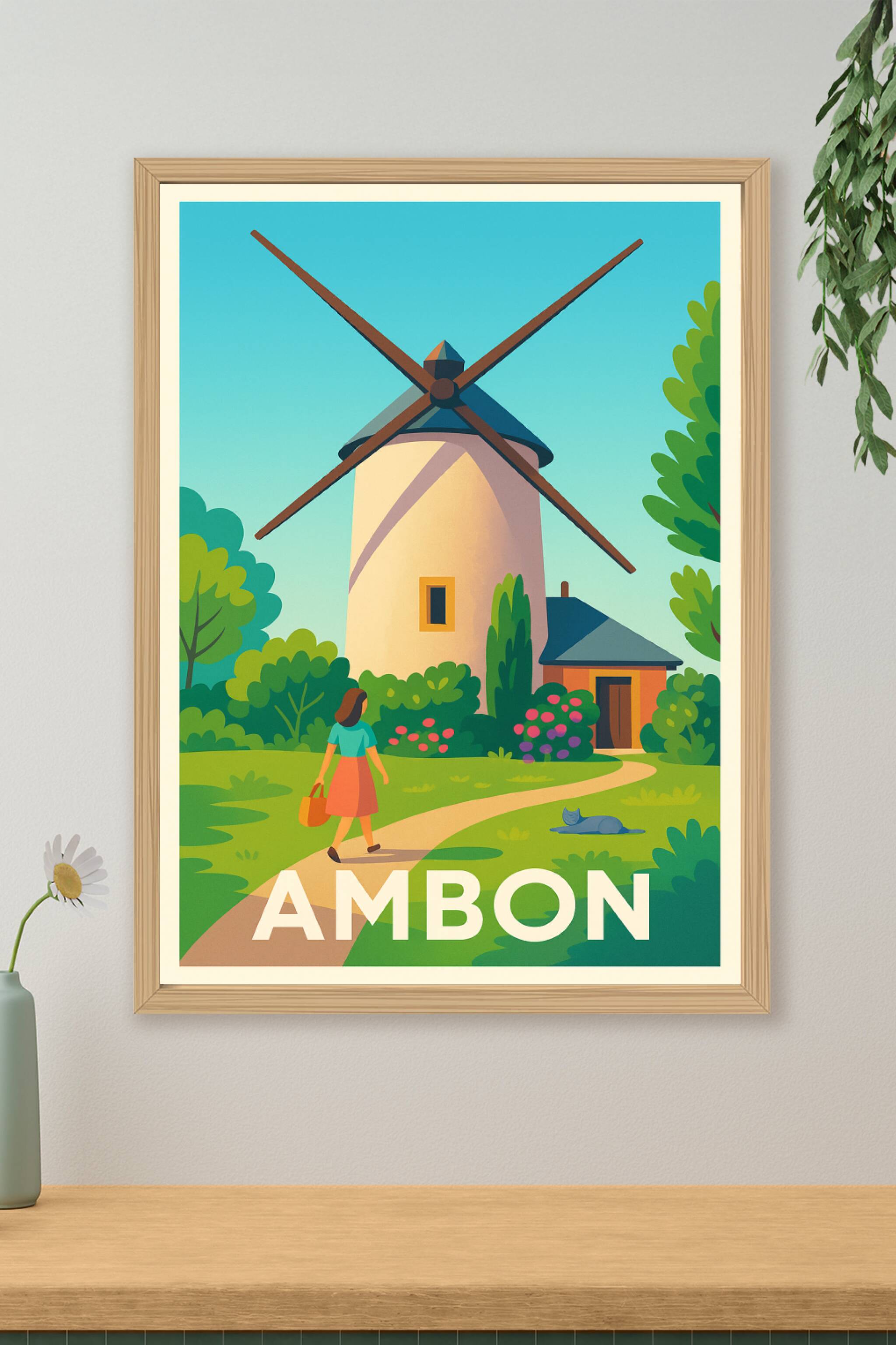 Découvrez la douceur de vivre d'Ambon avec cette affiche illustrée mettant en scène un moulin emblématique entouré de verdure et d'une atmosphère s...