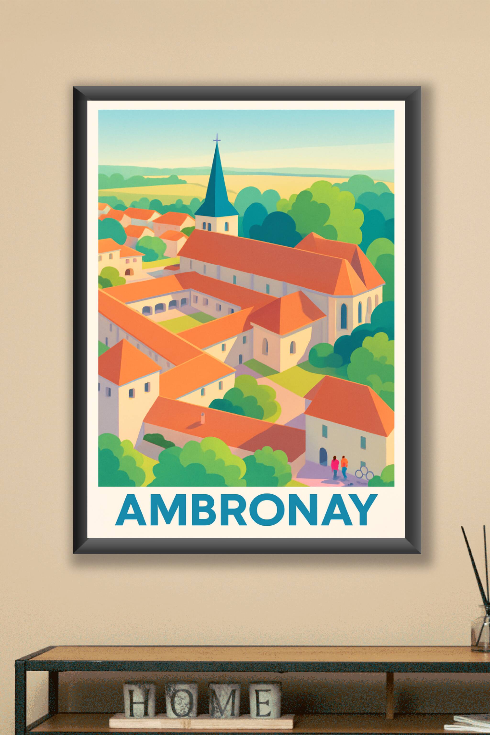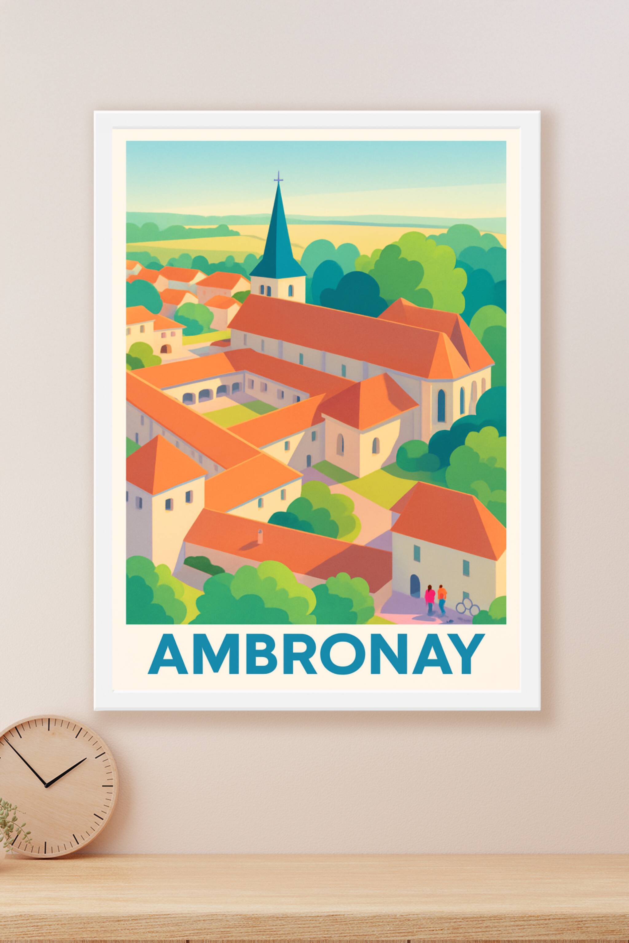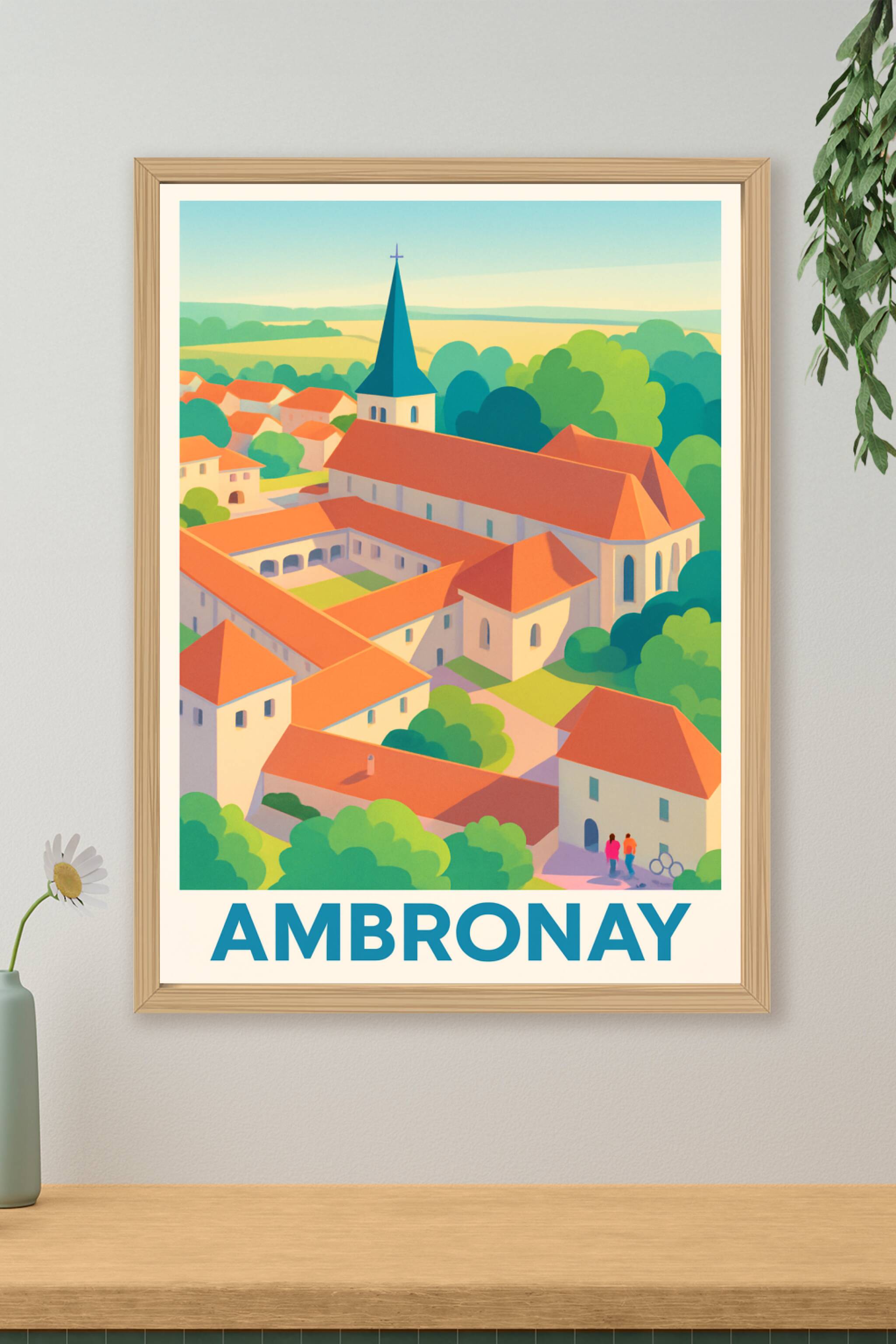 Découvrez la douceur et la sérénité d'Ambronay avec cette affiche illustrée mettant en valeur son architecture typique aux toits rouges et son cloc...