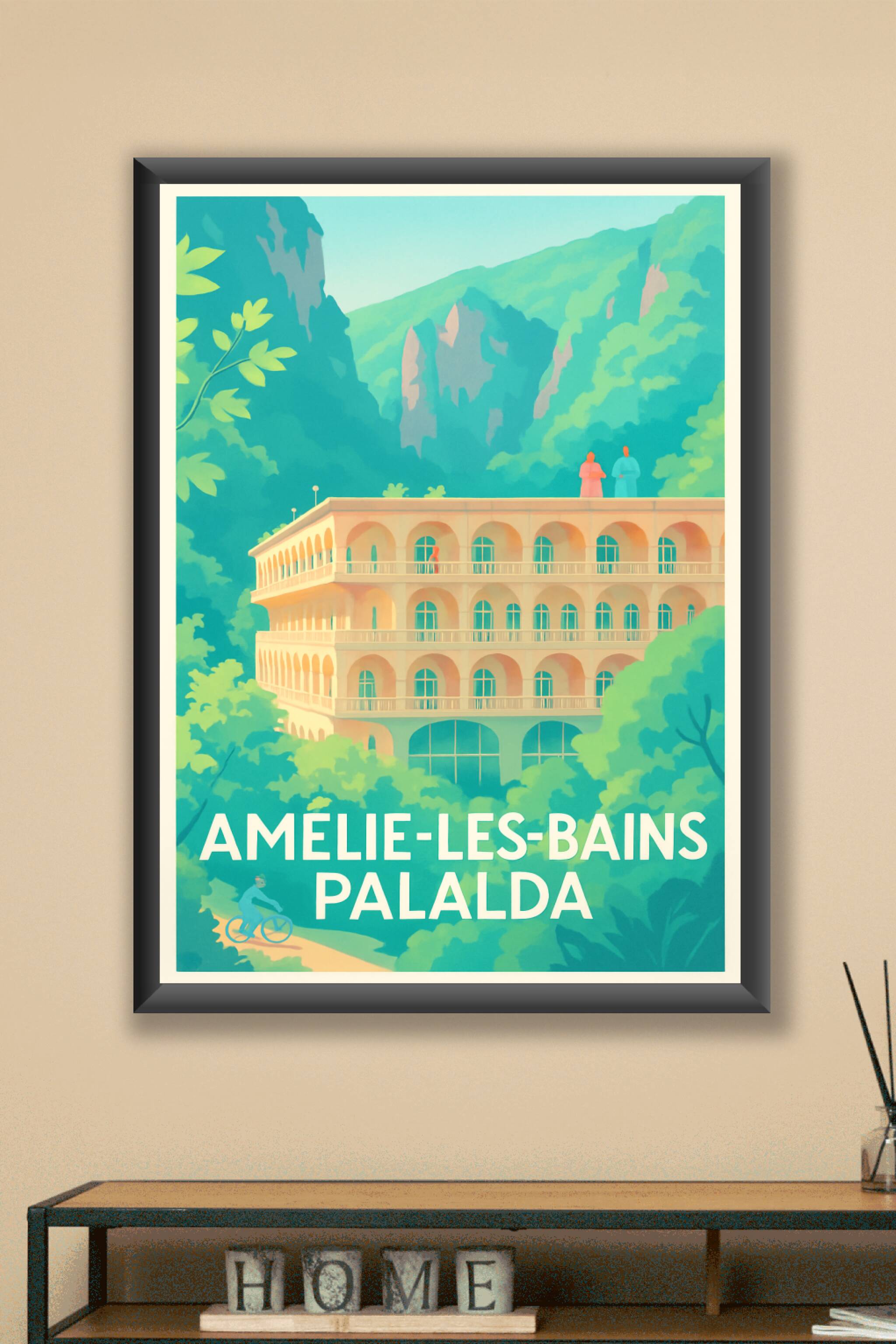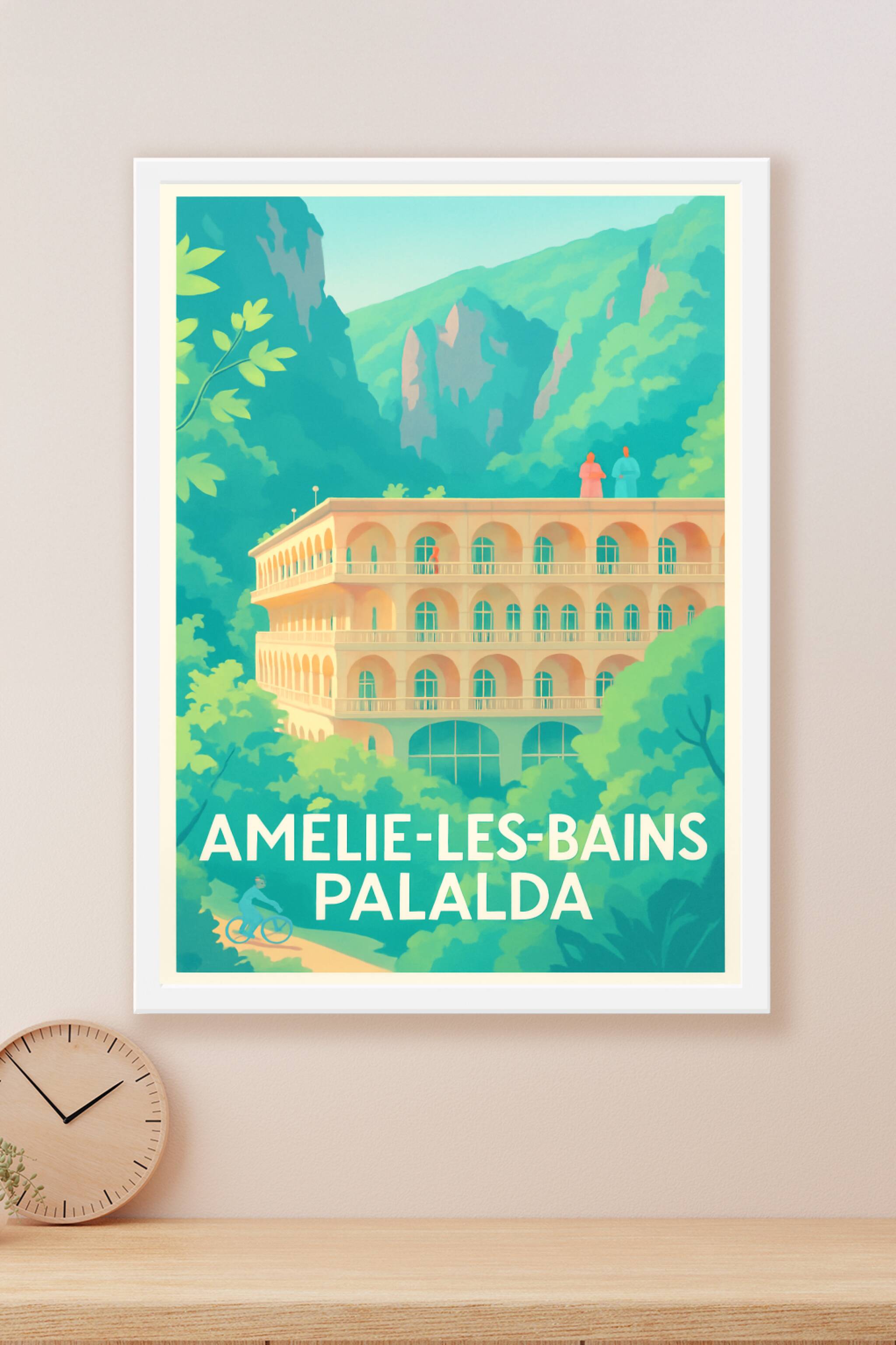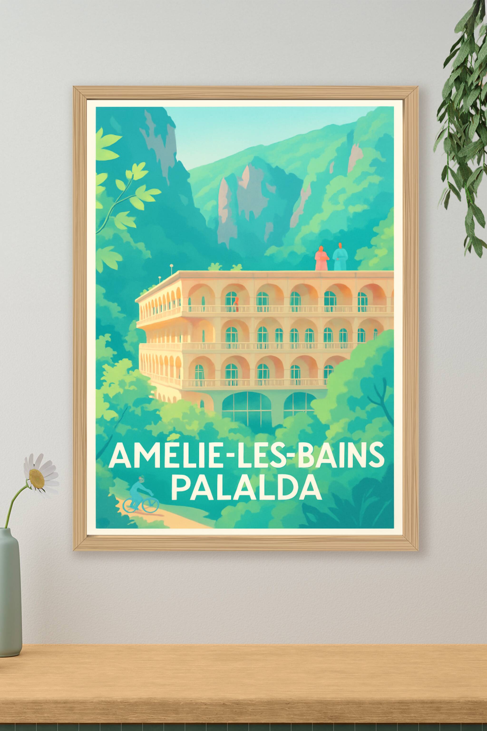 Découvrez l'ambiance apaisante d'Amélie-les-Bains à travers ce poster illustré représentant le célèbre Palalda, un bâtiment emblématique niché au c...