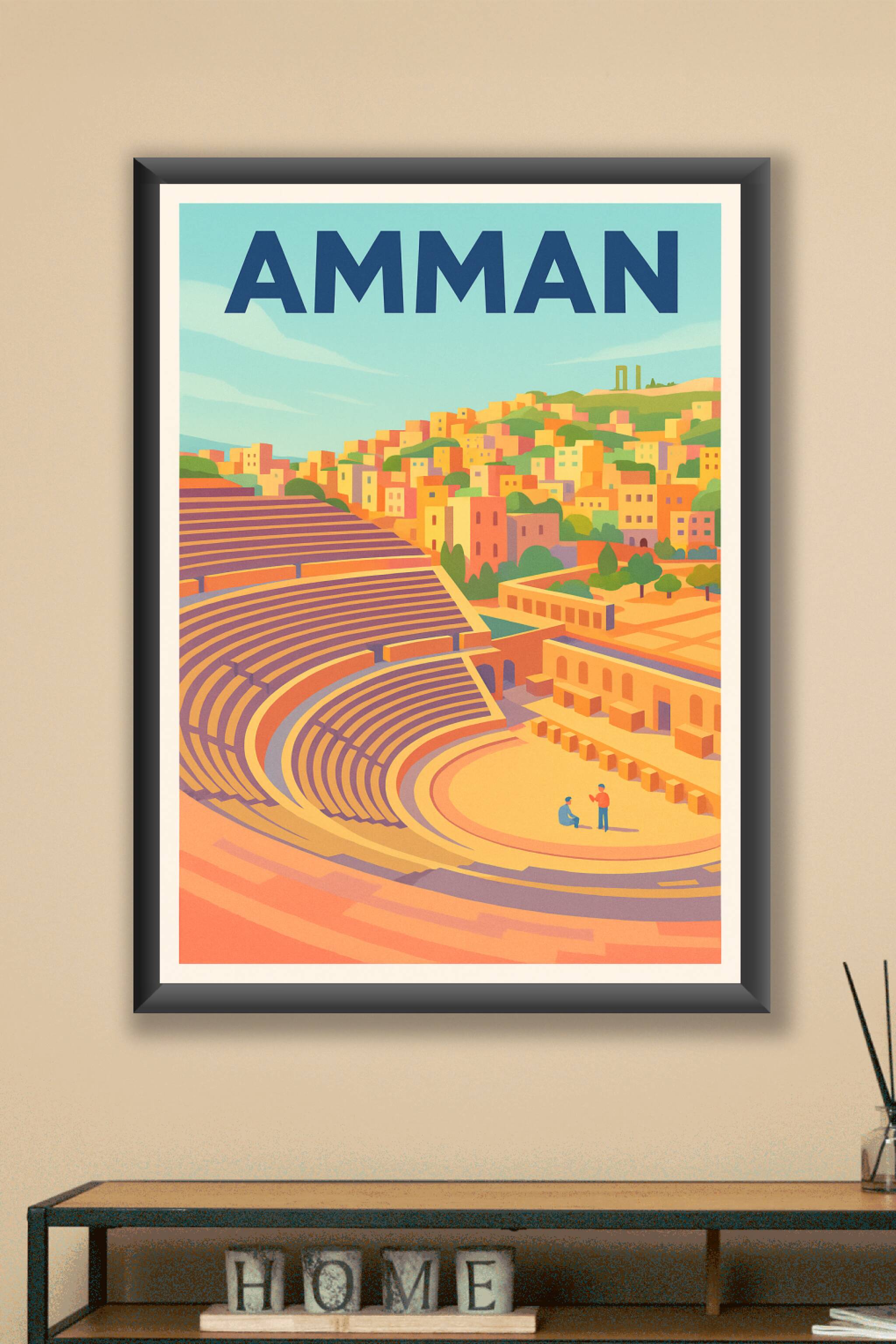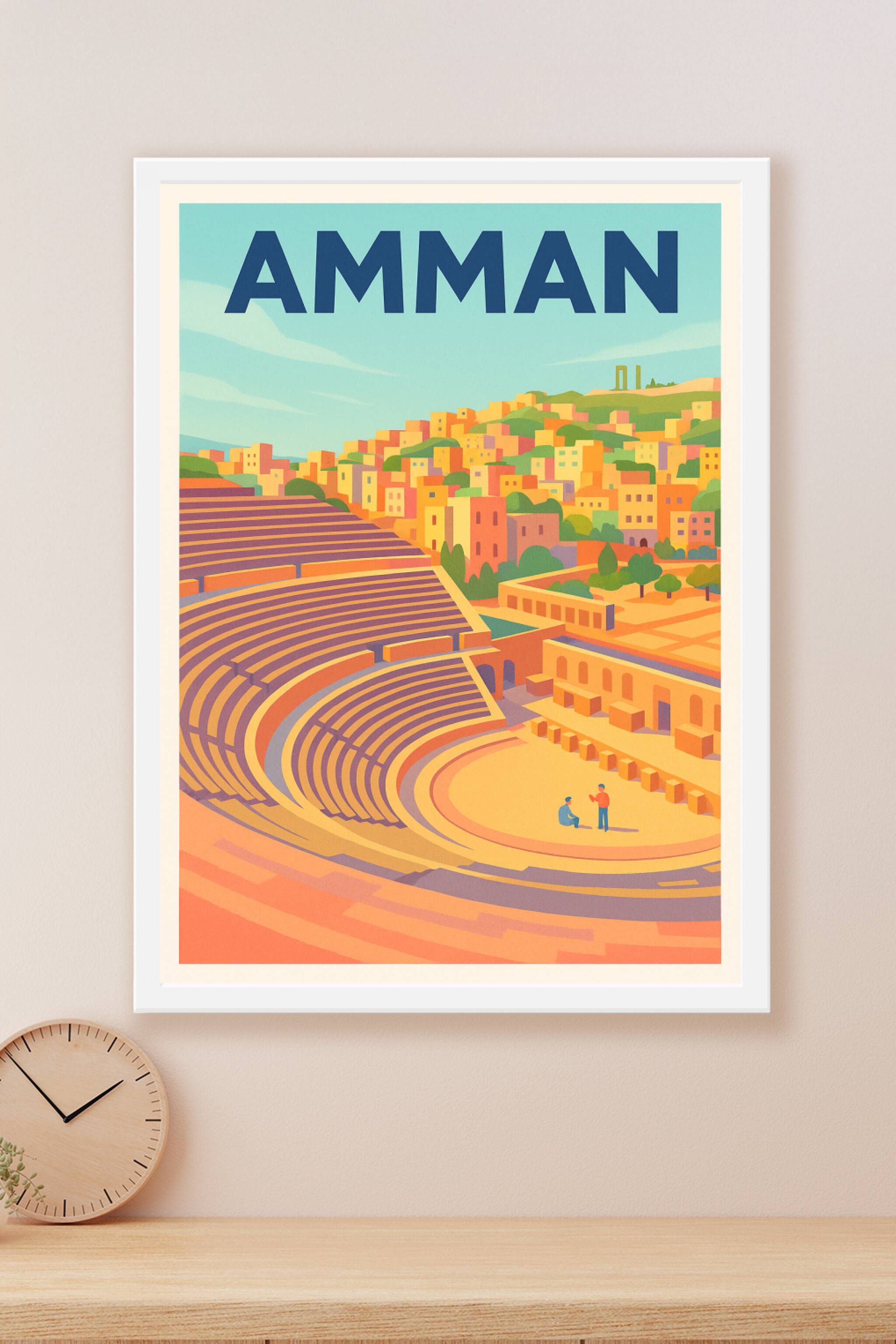 Découvrez le charme historique d'Amman à travers cette affiche illustrée mettant en lumière l'emblématique amphithéâtre romain et les maisons color...