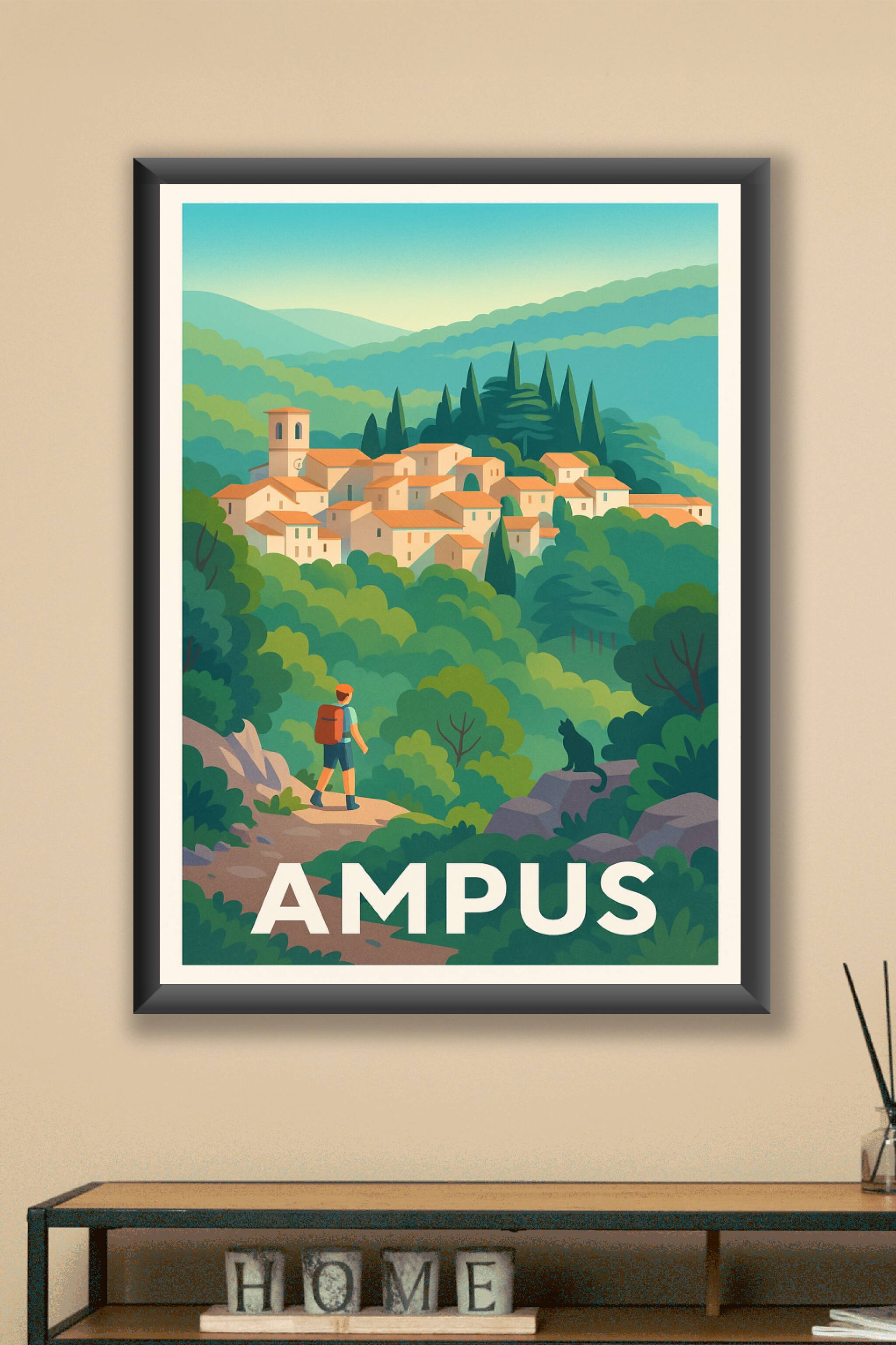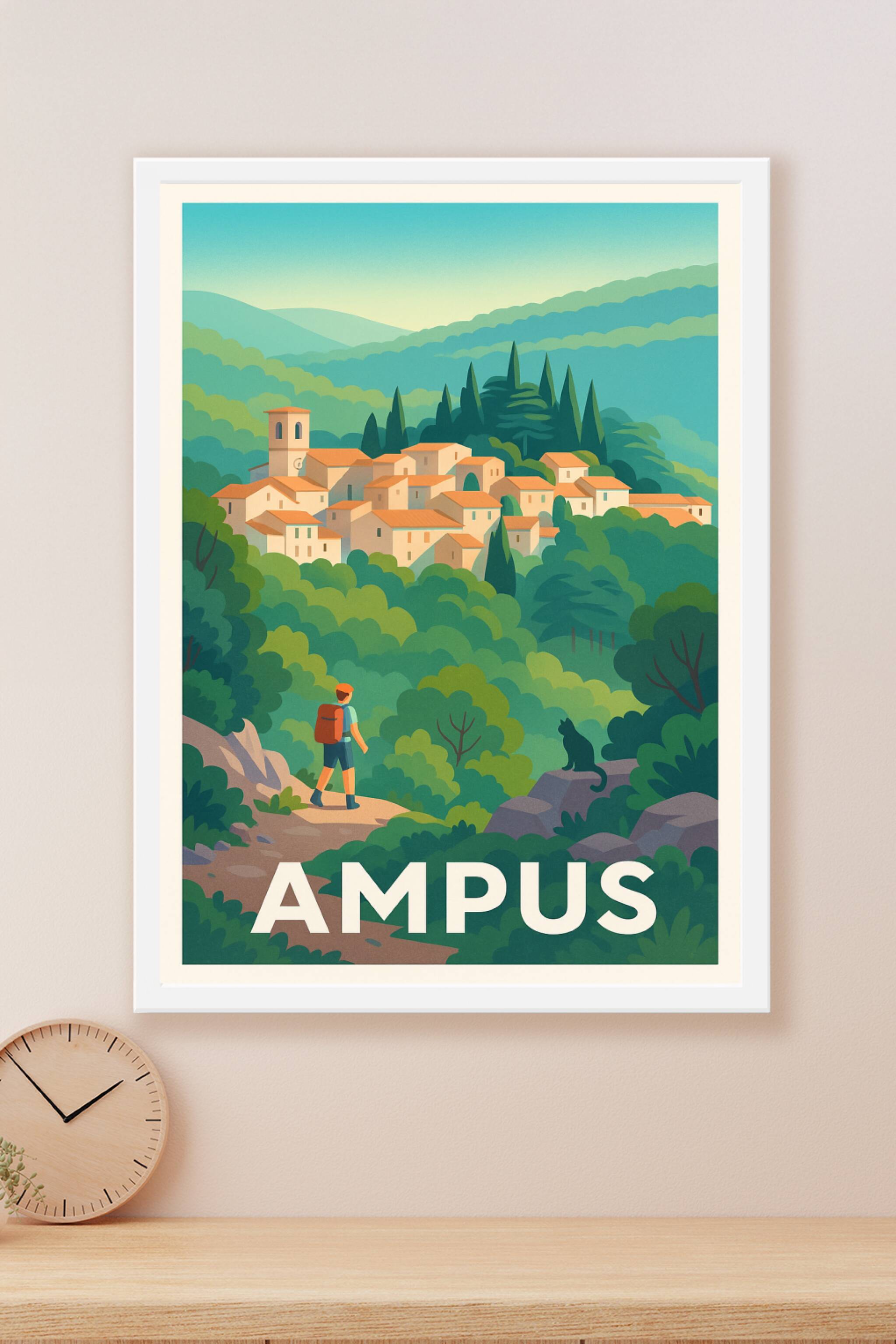 Découvrez l'ambiance paisible et verdoyante d'Ampus avec cette affiche illustrée mettant en scène un randonneur contemplant ce village pittoresque ...