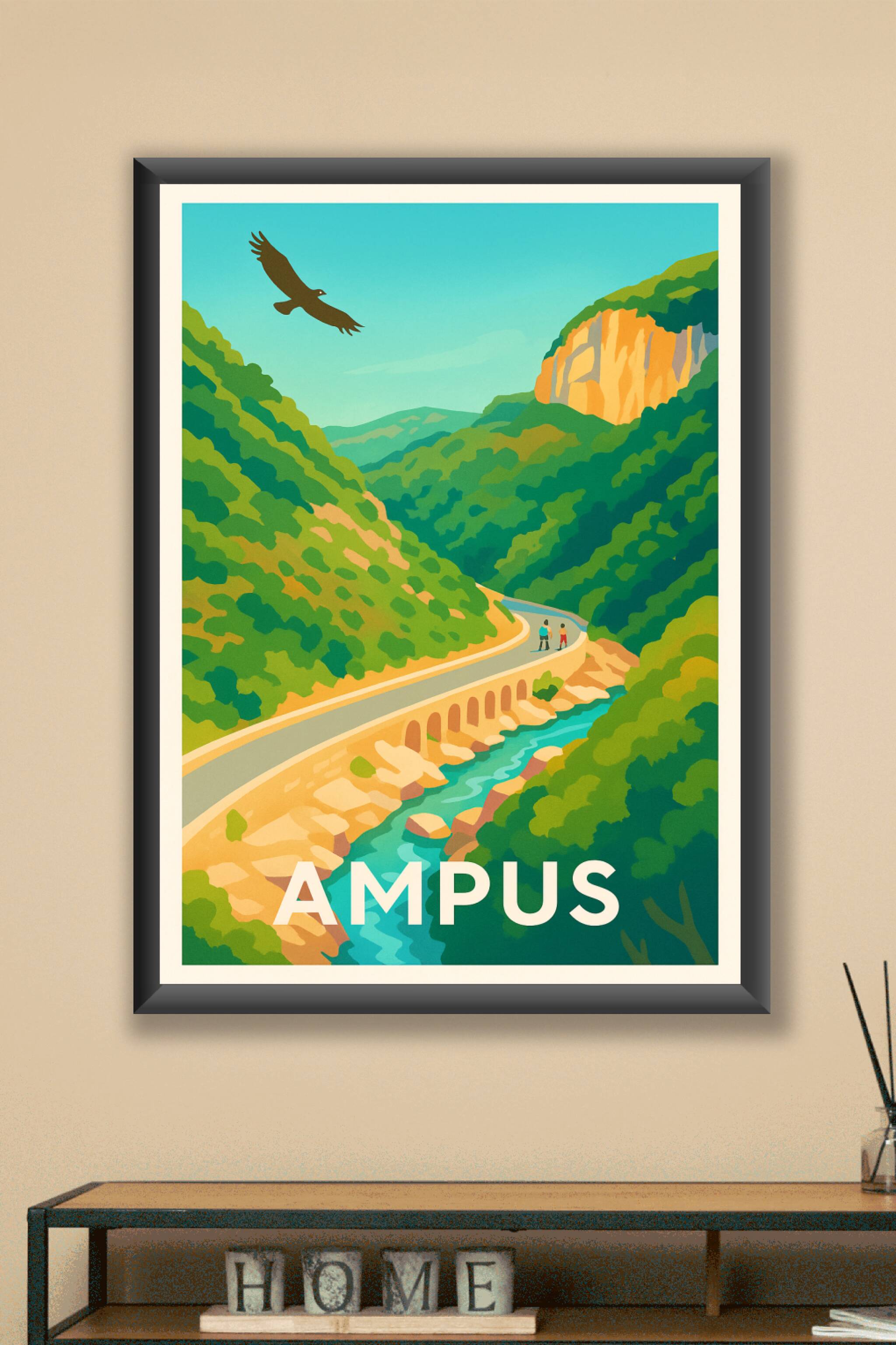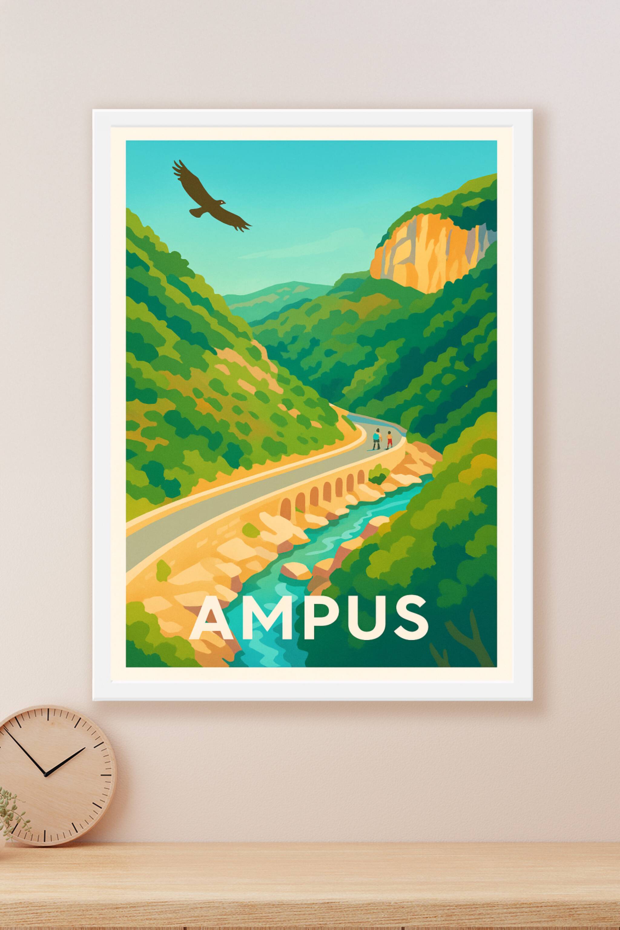 Découvrez la sérénité des paysages verdoyants d'Ampus avec cette affiche illustrée au style vintage et lumineux. Ce poster met en avant une route s...