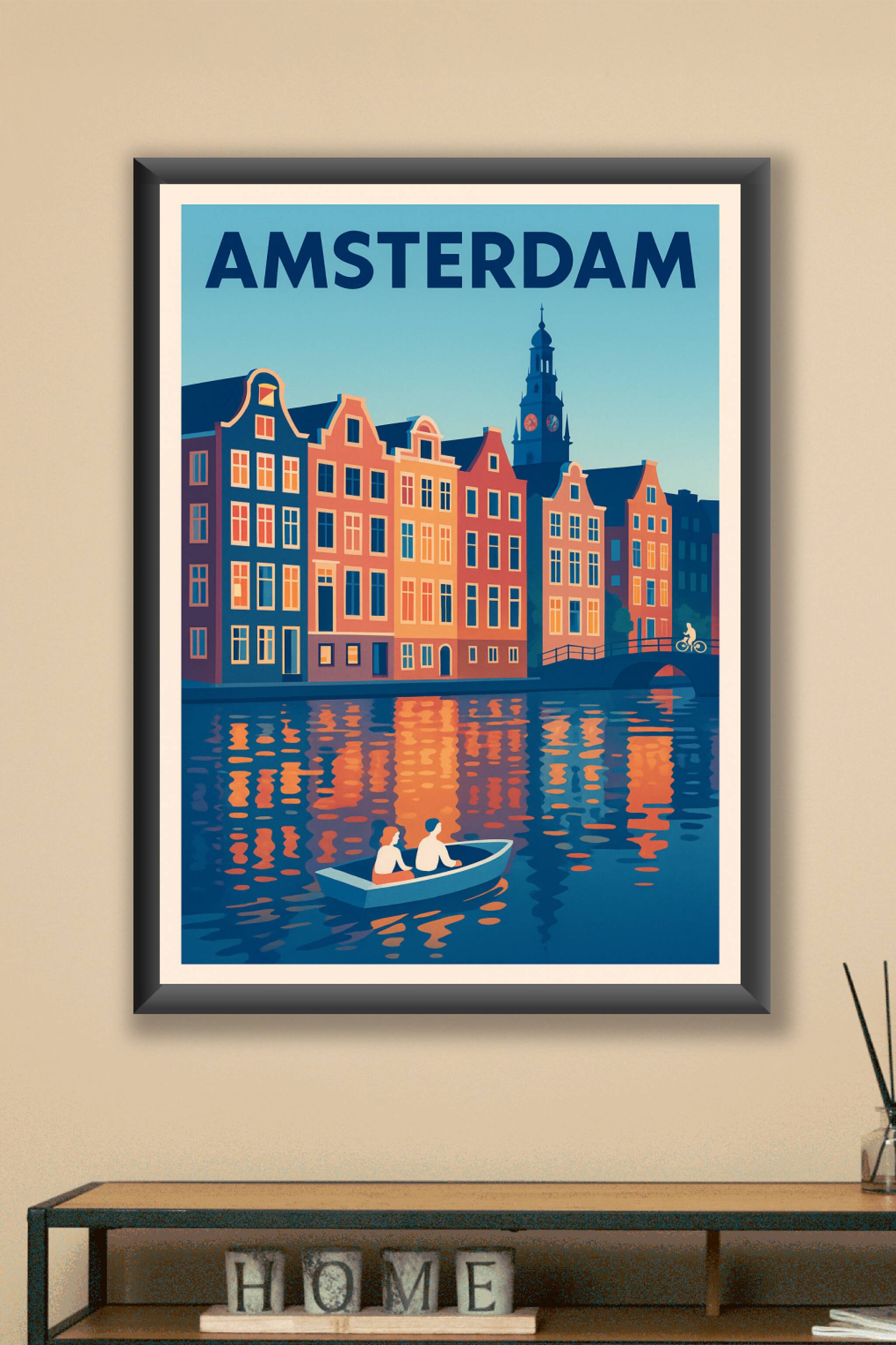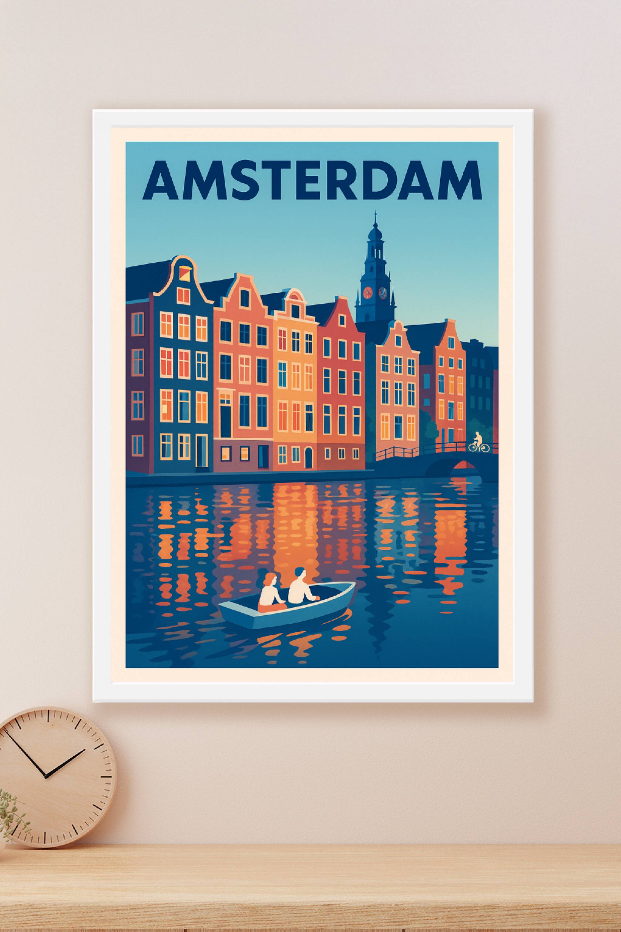 Découvrez la magie au crépuscule d'Amsterdam avec ce poster artistique illustrant les célèbres façades colorées bordant les canaux paisibles. Cette affiche unique capture l'essence romantique de la ville, où l'eau reflète les lumières chaleureuses des maisons typiques et où une balade en barque invite à la détente.Ce poster est proposé en tirage "Fine Art" sur un papier 305g coton haut de gamme, garantissant une impression d'une qualité exceptionnelle et des couleurs éclatantes à chaque détail. Disponible en formats A1 à A4, avec ou sans cadre, cette affiche Amsterdam apportera une touche d'élégance et de charme néerlandais à votre décoration intérieure. Fabriquée en France, elle est parfaite pour les amateurs d'art, les voyageurs et ceux qui souhaitent inviter l'ambiance douce des canaux dans leur quotidien.