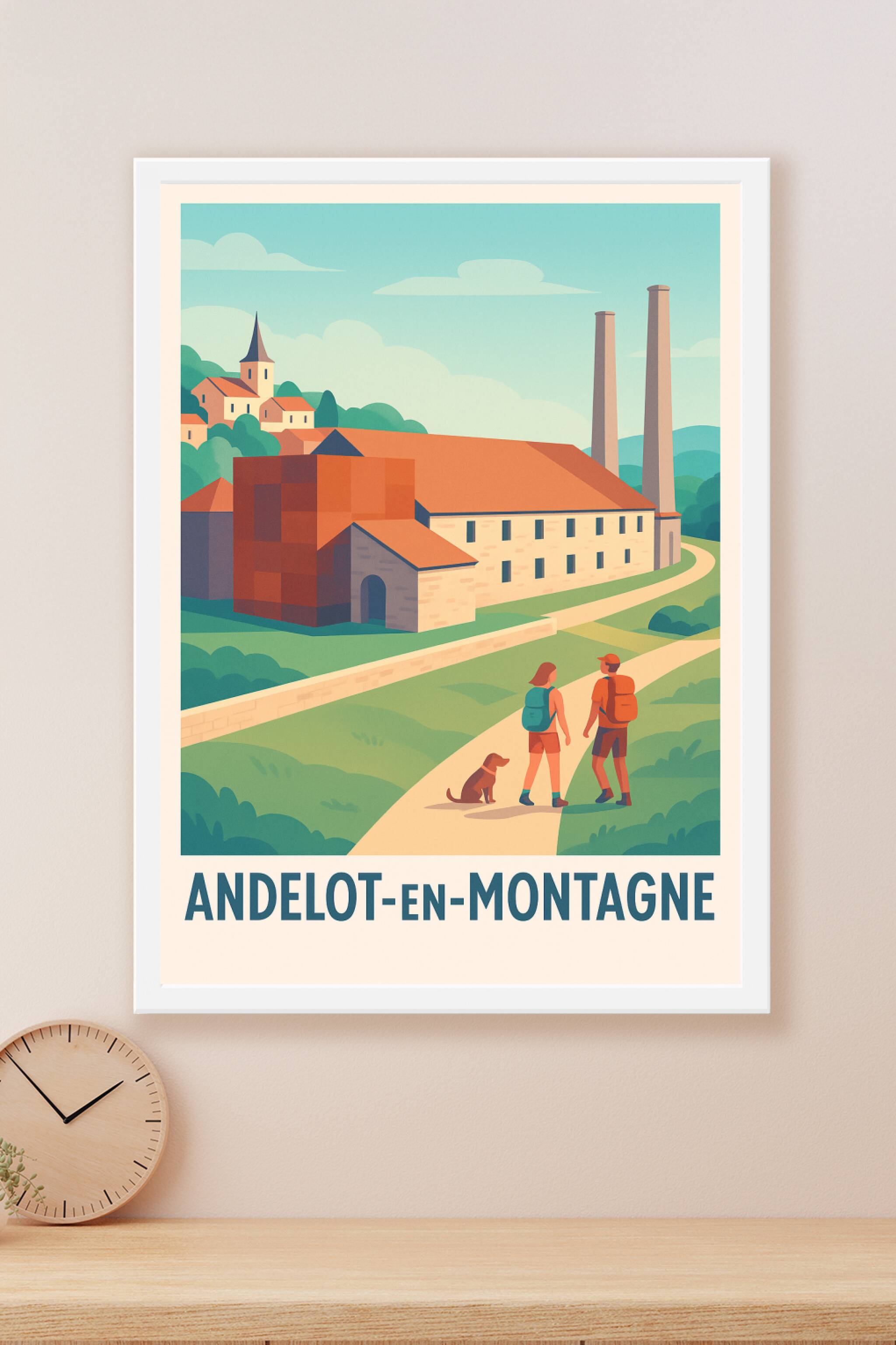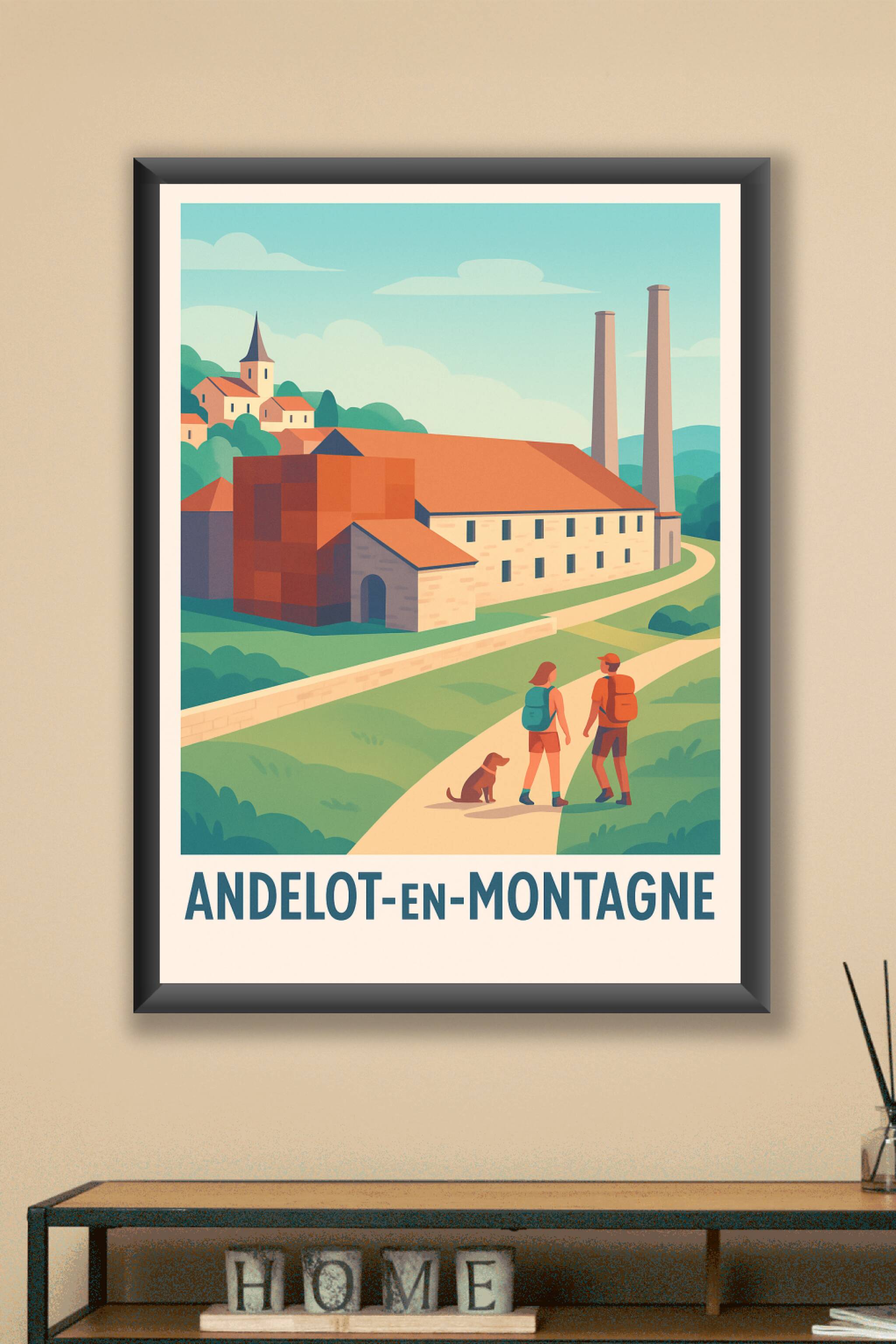 Découvrez le charme authentique d'Andelot-en-Montagne avec cette affiche au style rétro illustré. Cette scène paisible met en valeur le patrimoine ...