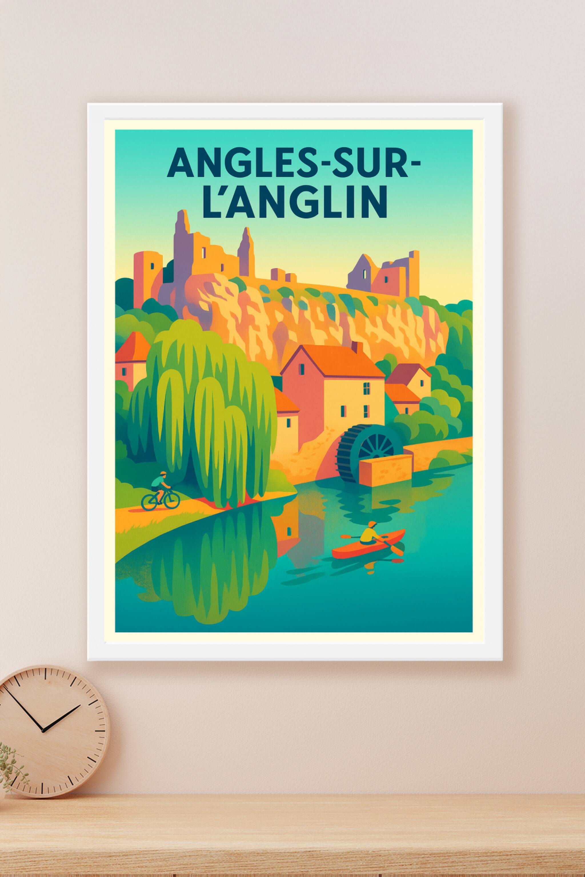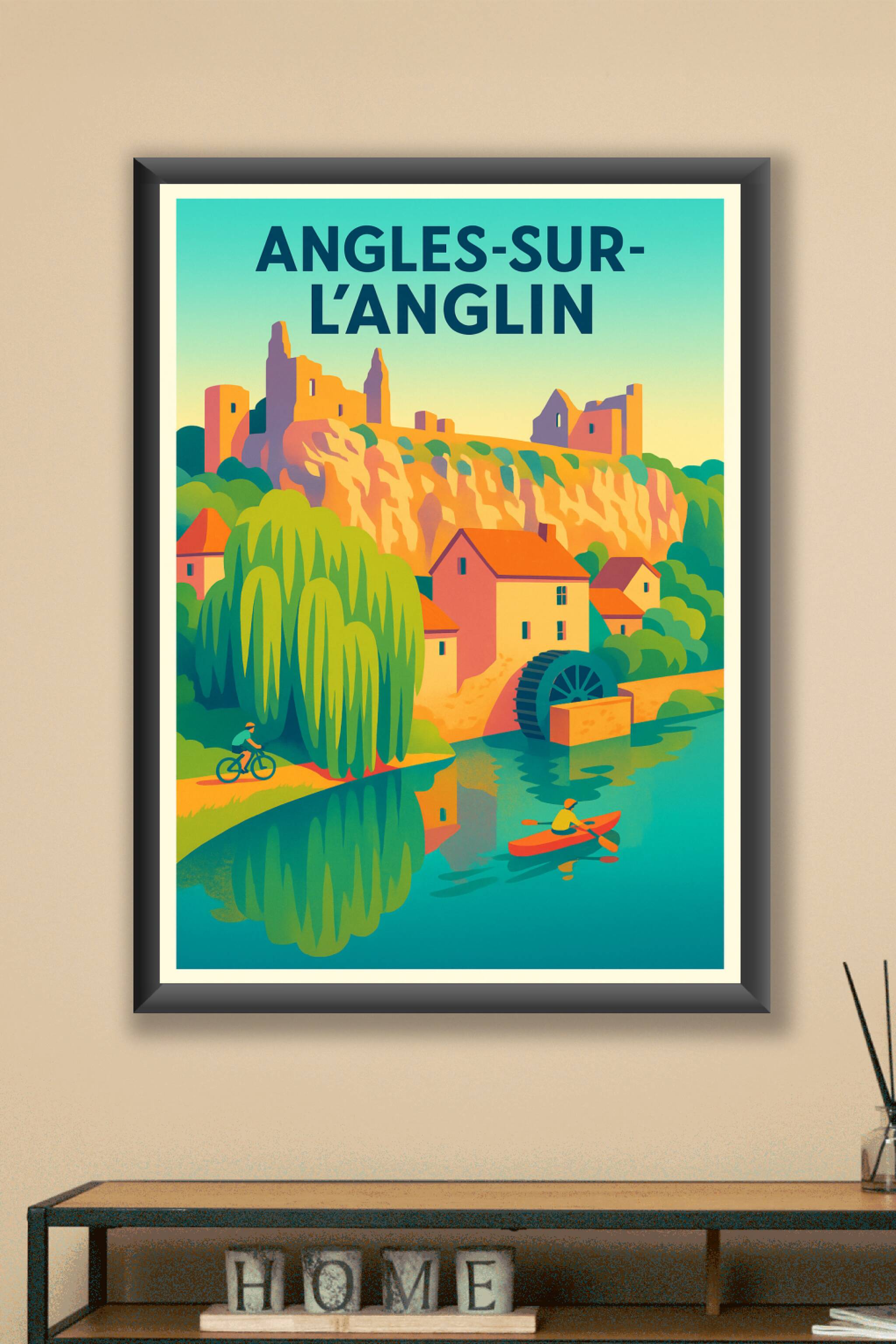 Découvrez l'élégance intemporelle d'Angles-sur-l'Anglin avec cette affiche aux couleurs chaudes et apaisantes, illustrant son célèbre moulin à eau et ses ruines médiévales surplombant la rivière. Ce poster invite à la détente et à l'aventure en pleine nature, parfait pour les amateurs de paysages authentiques et historiques. Imprimée en tirage "Fine Art" sur papier 305g coton, cette affiche offre une qualité d'impression supérieure, garantissant des couleurs éclatantes et une durabilité exceptionnelle. Disponible en formats A1 à A4, avec ou sans cadre, elle apportera une touche raffinée et chaleureuse à votre décoration intérieure ou fera un cadeau idéal pour les passionnés de patrimoine et de voyages.