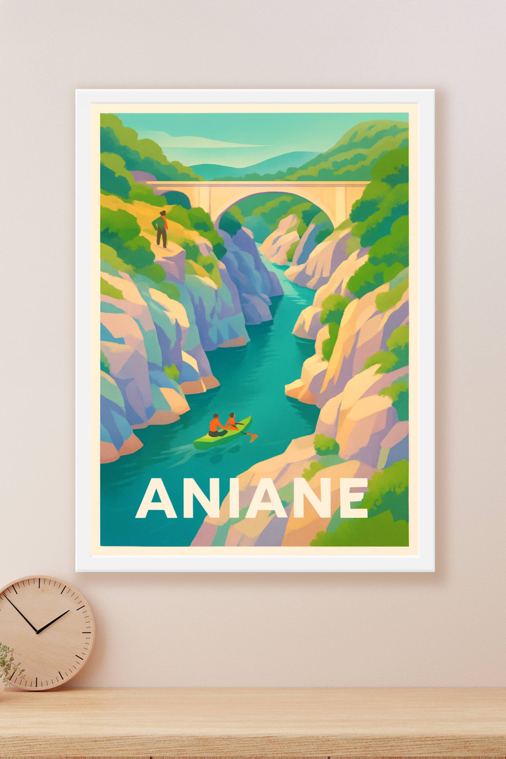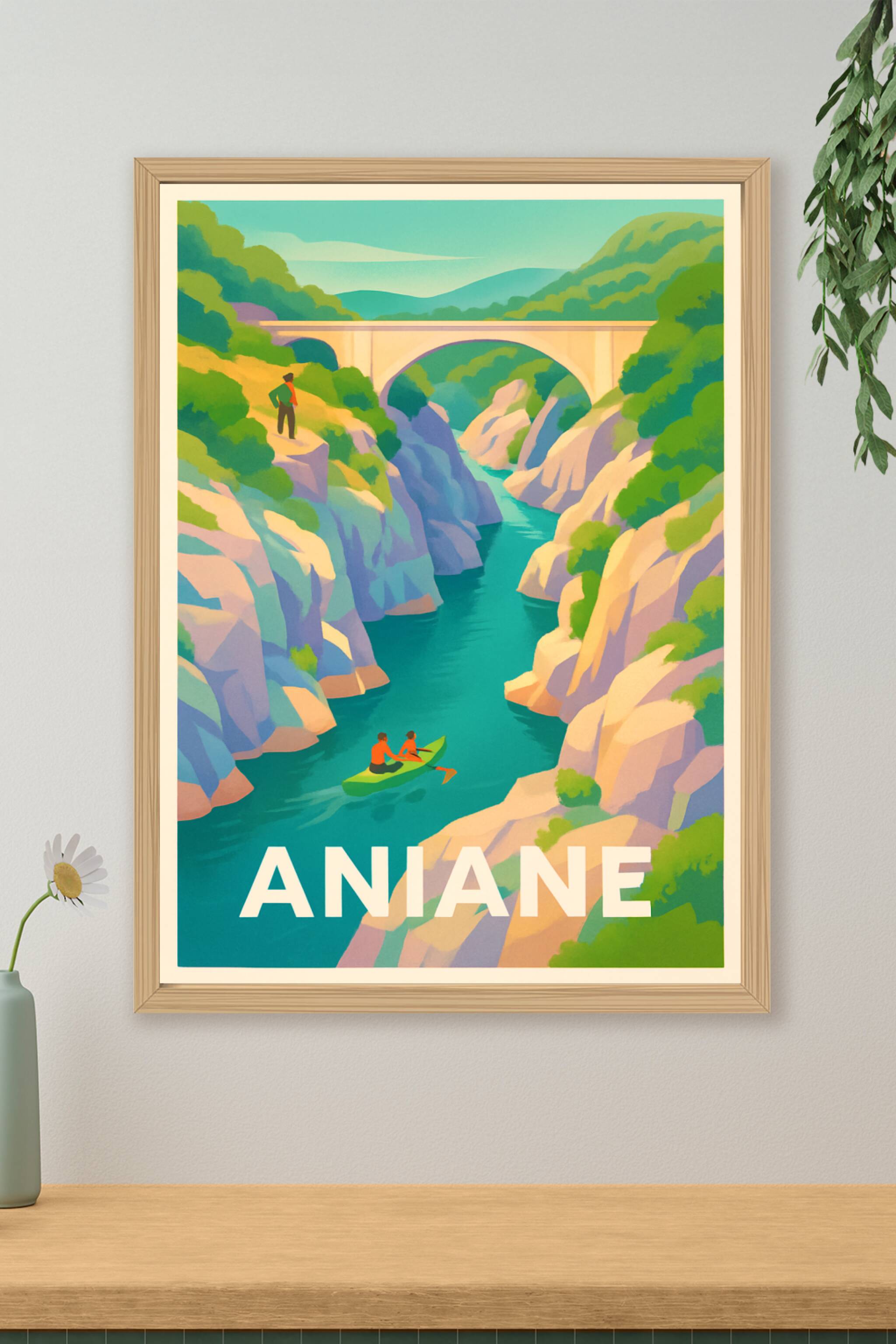Découvrez le charme authentique d'Aniane à travers cette affiche illustrée qui met en avant ses magnifiques gorges et son cours d'eau turquoise. Ce...