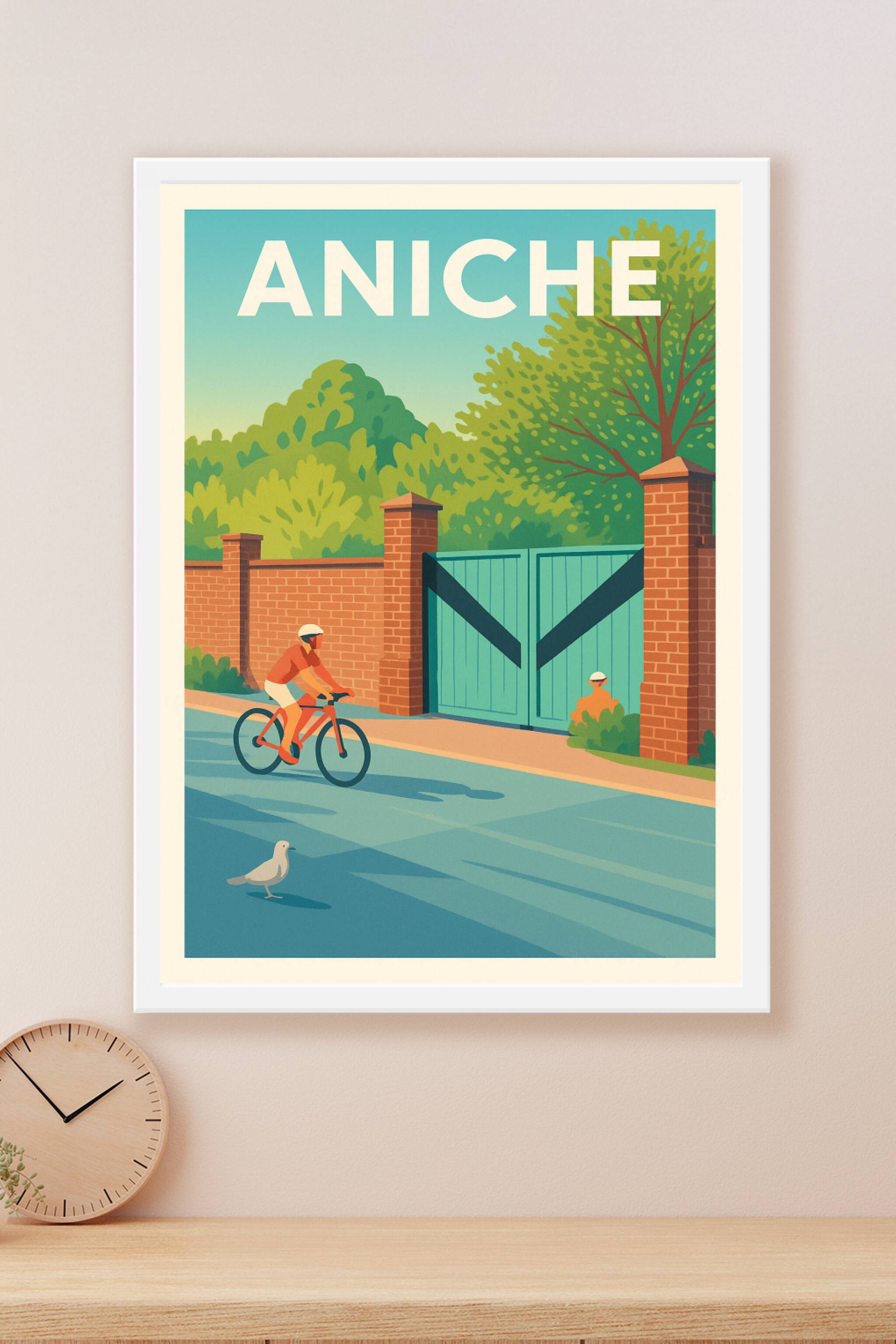 Découvrez l'ambiance paisible et lumineuse d'Aniche avec cette affiche au style rétro illustrant une promenade à vélo sur une route bordée de murs ...