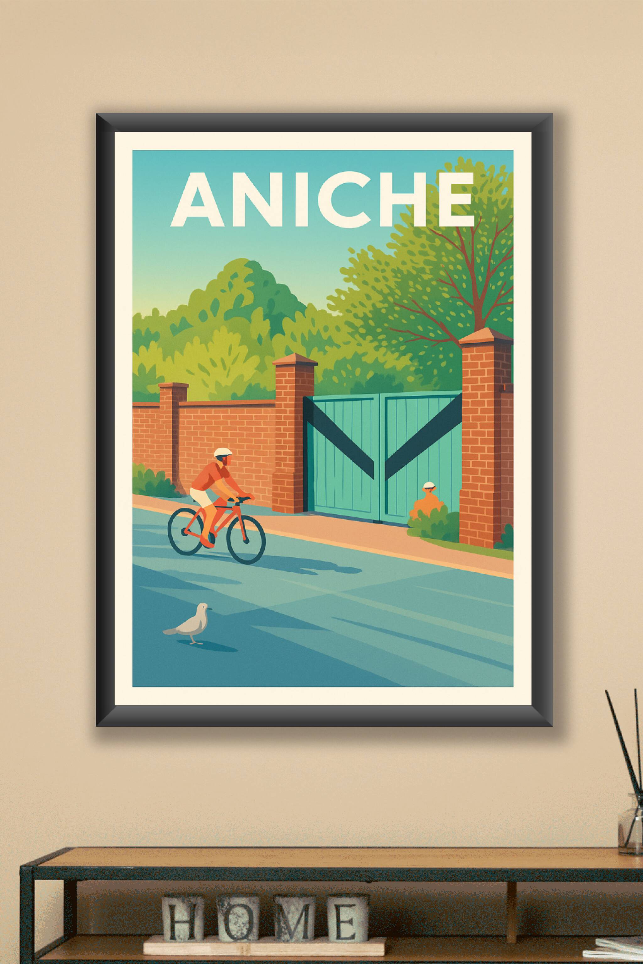 Découvrez l'ambiance paisible et lumineuse d'Aniche avec cette affiche au style rétro illustrant une promenade à vélo sur une route bordée de murs en briques et de verdure luxuriante. La scène évoque la tranquillité d'une petite ville et le charme d'une journée ensoleillée. Ce poster est imprimé en tirage "Fine Art" sur papier 305g coton pour une qualité d'impression exceptionnelle, qui valorise les couleurs et les détails. Disponible en formats A1 à A4, avec ou sans cadre, cette affiche s'adapte parfaitement à votre décoration intérieure. Offrez-vous ou à vos proches un souvenir unique et élégant, fabriqué en France avec soin, pour capturer l'esprit d'Aniche dans votre maison.