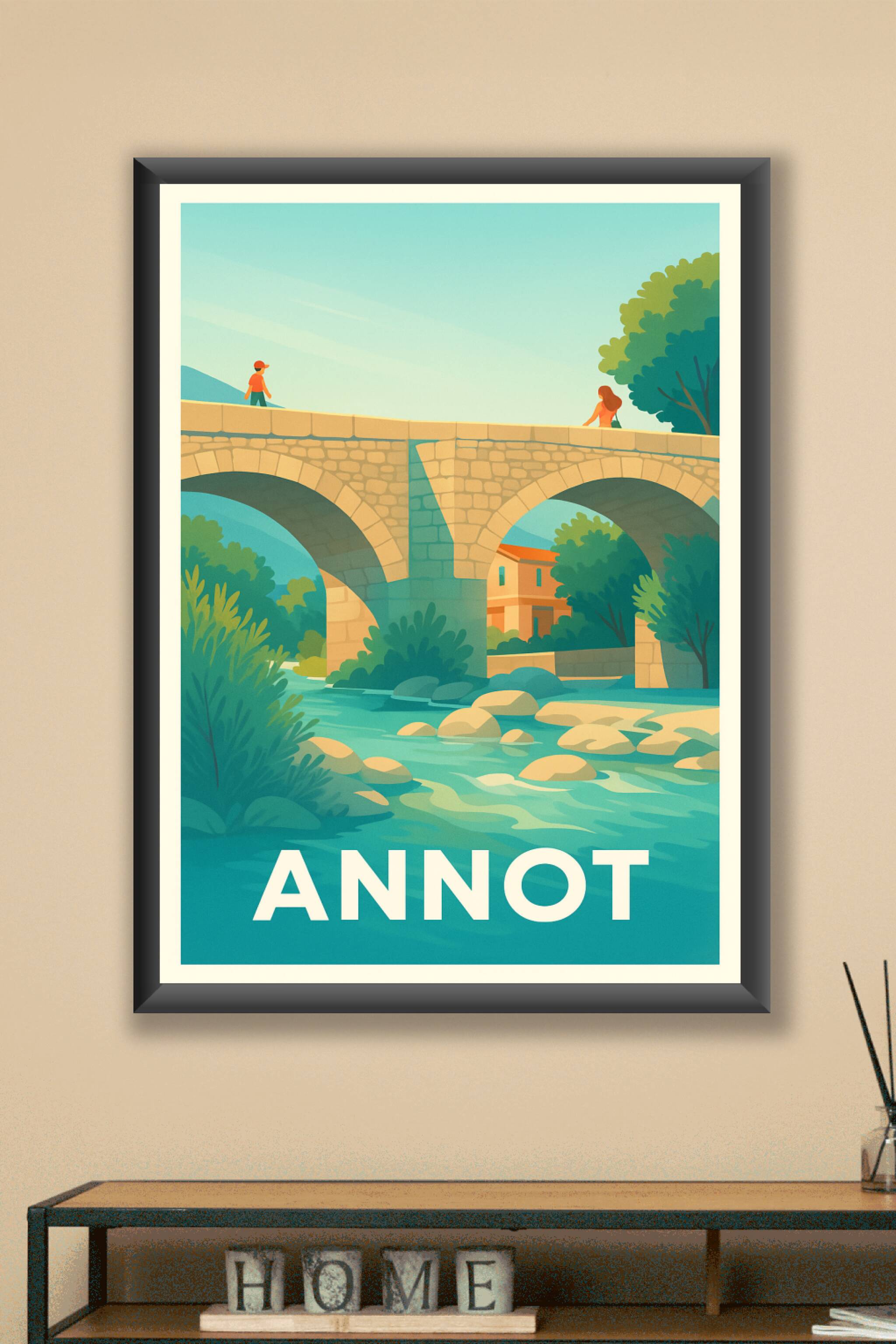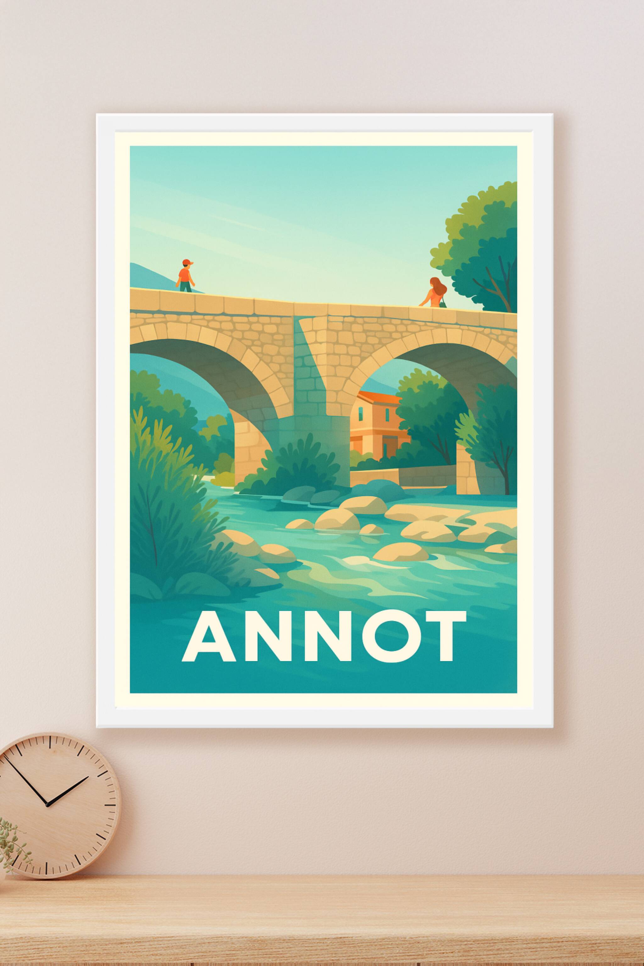 Découvrez la douceur et la sérénité d'Annot avec cette affiche illustrée mettant en scène un pont de pierre emblématique et son paysage paisible. C...
