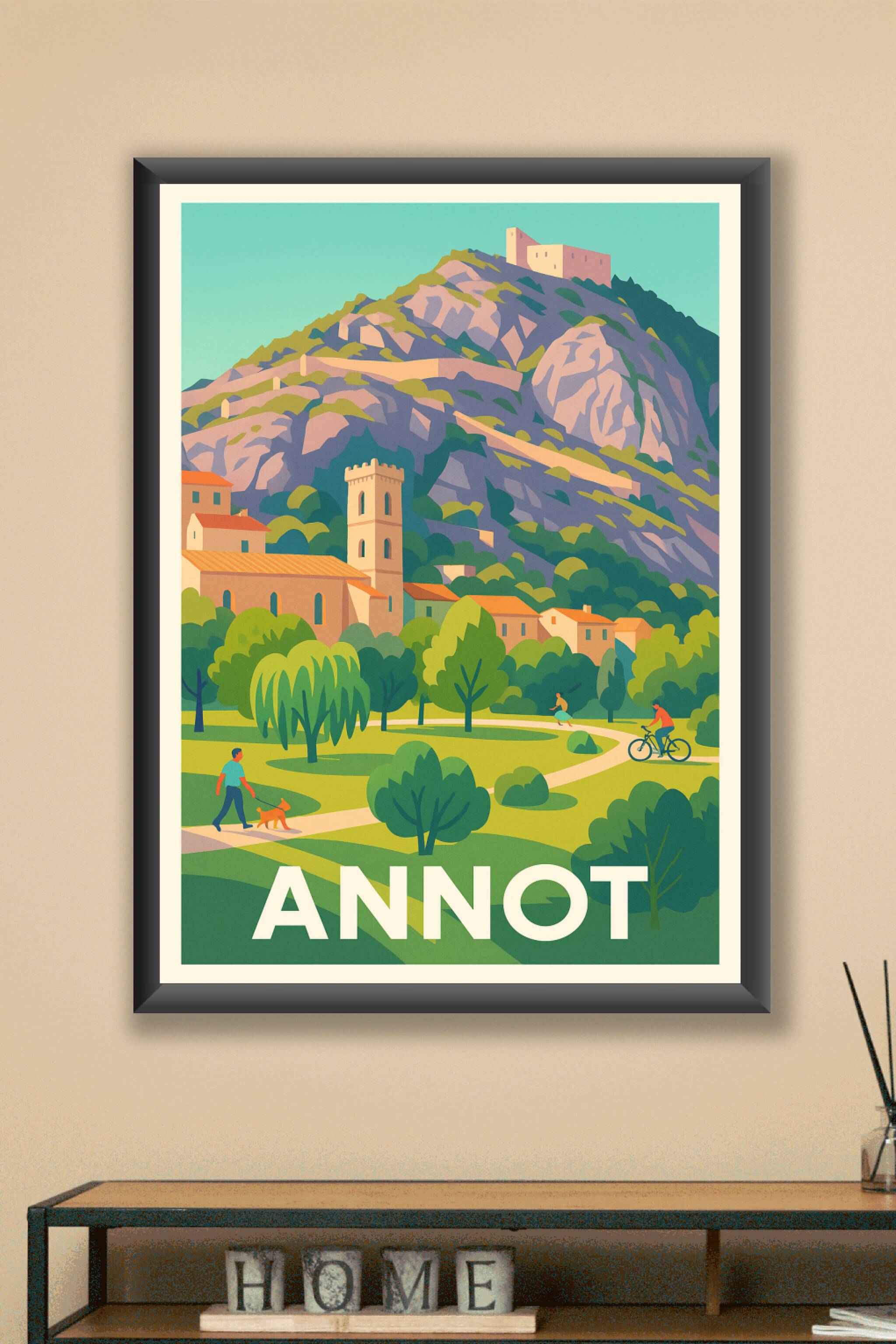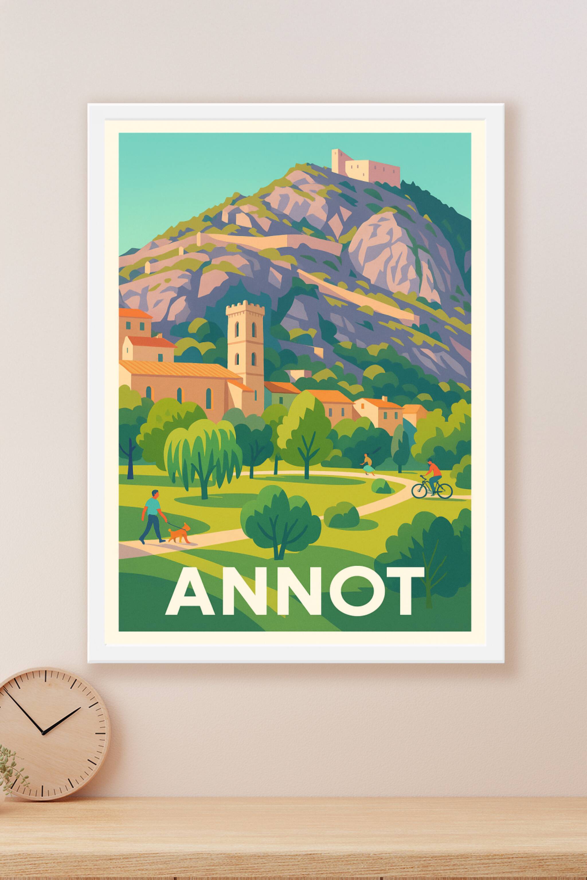 Découvrez la sérénité et la beauté naturelle du village d'Annot avec cette affiche illustrée aux couleurs douces et apaisantes. La représentation d...