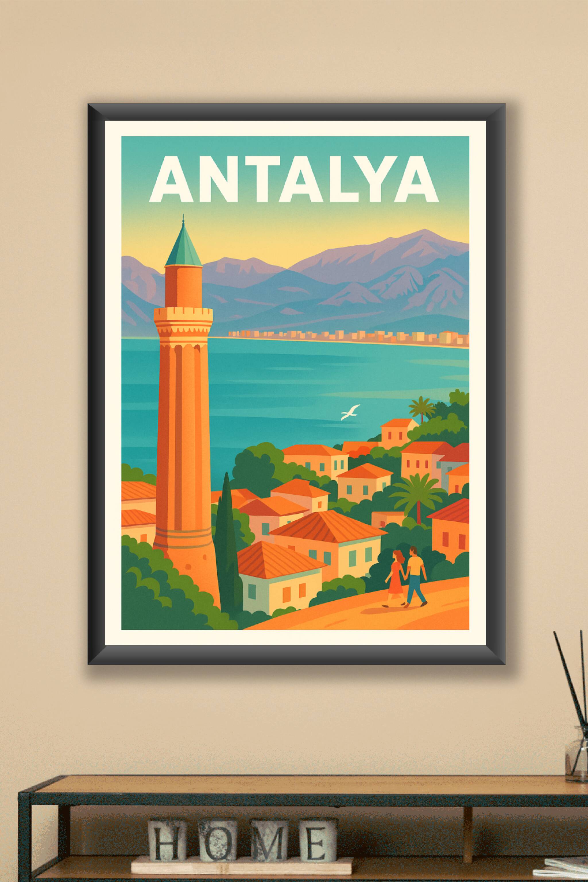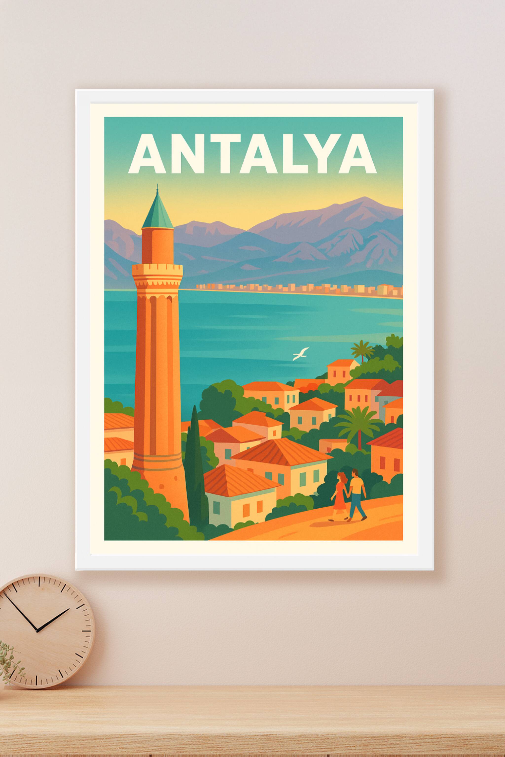 Découvrez le charme envoûtant d'Antalya avec cette affiche au style rétro illustrant ses toits d'argile rouge, son minaret emblématique et les mont...