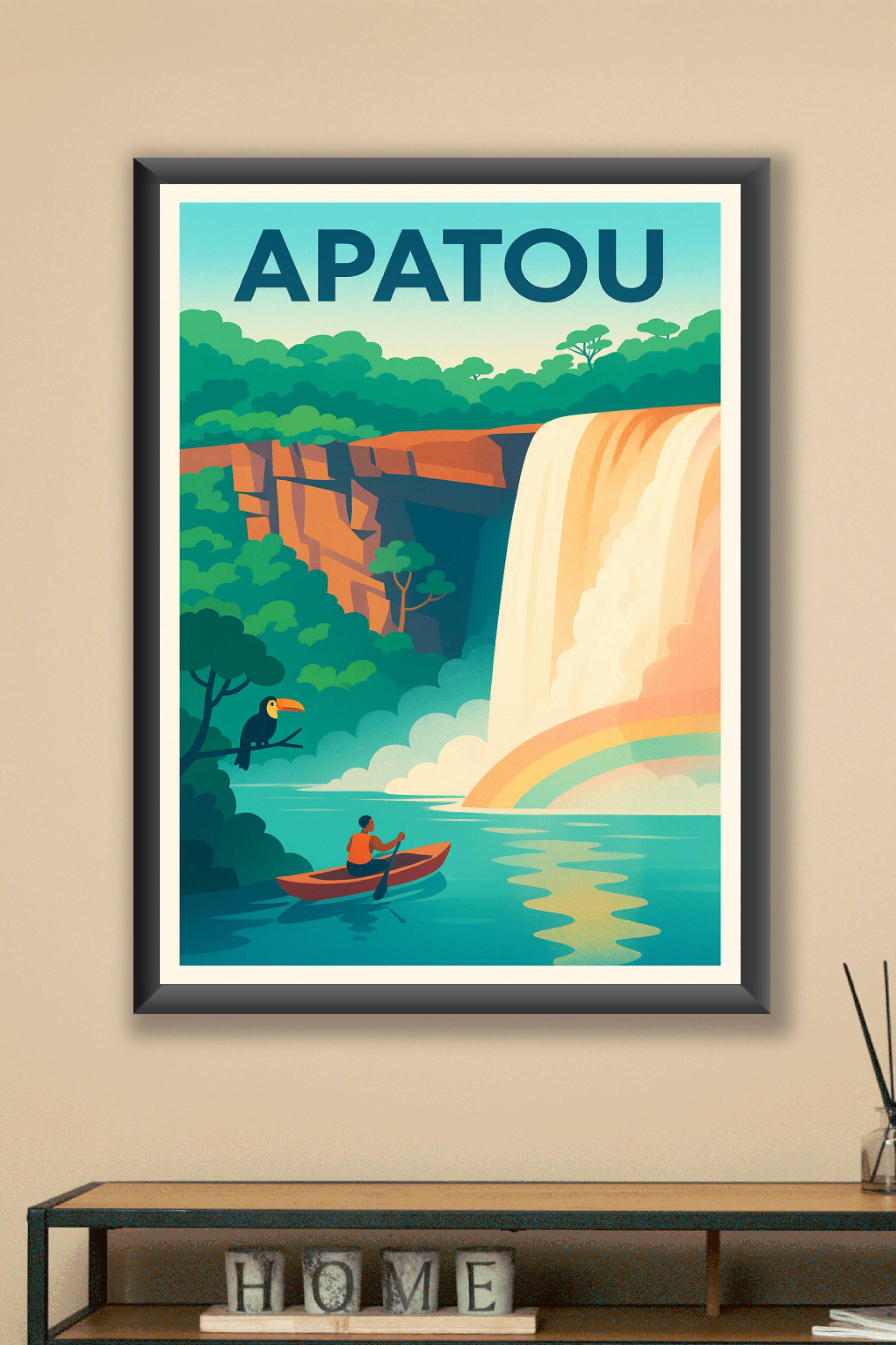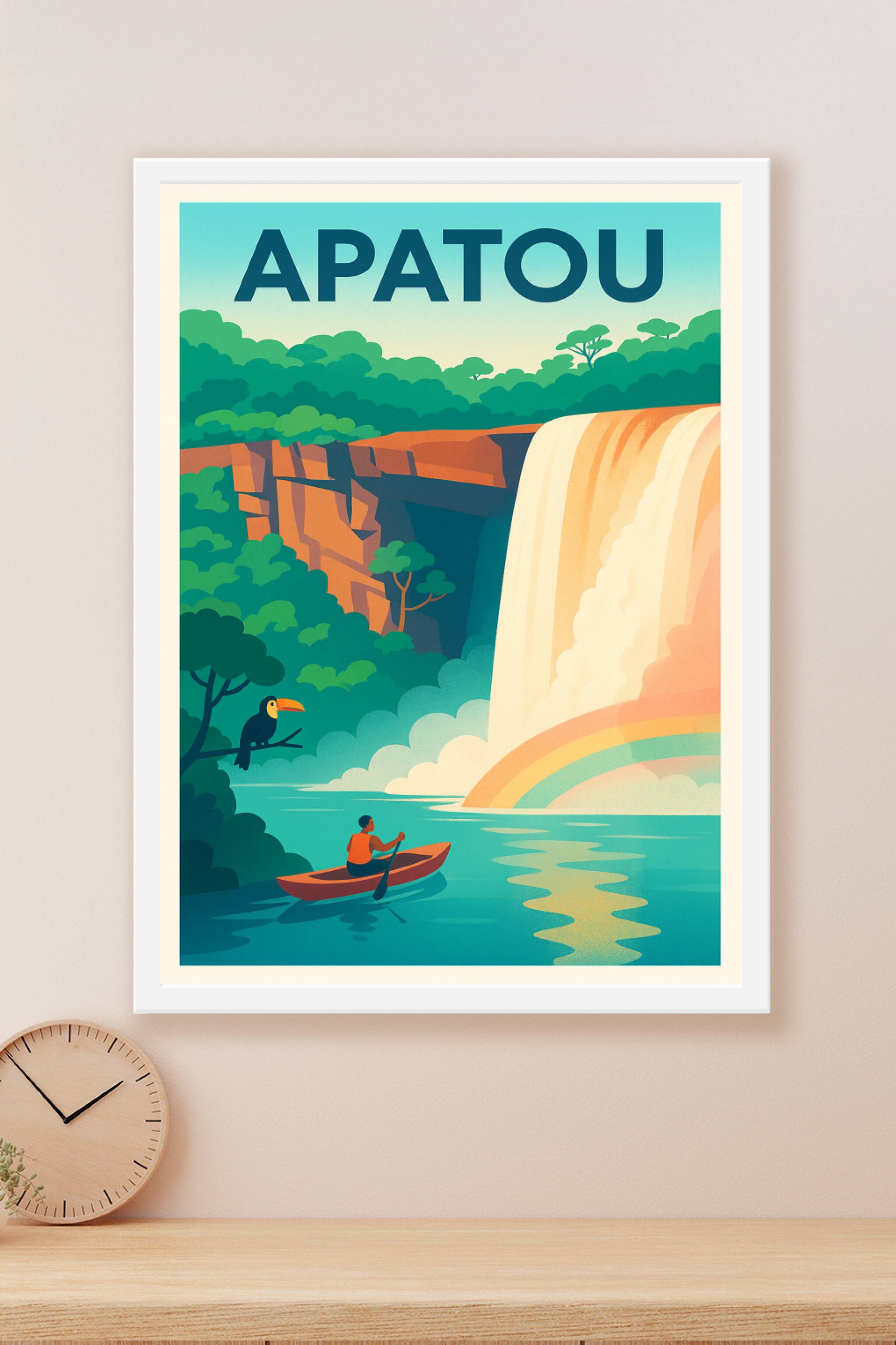 Plongez dans la sérénité d'Apatou avec cette affiche illustrée qui capture la beauté spectaculaire de ses cascades entourées d'une nature luxuriant...