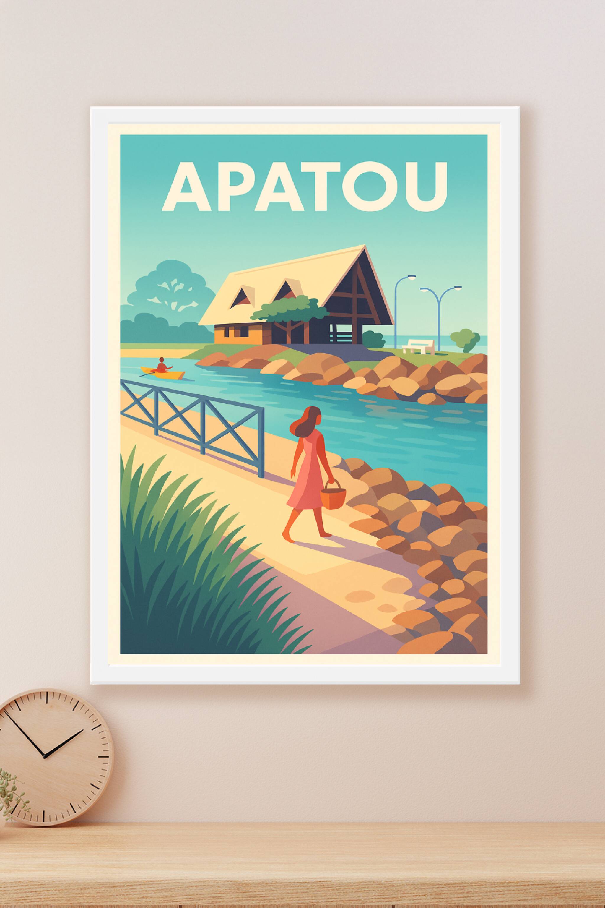 Découvrez la sérénité d'Apatou capturée dans cette affiche au style rétro et aux couleurs douces. Une scène paisible où une femme marche le long d'...