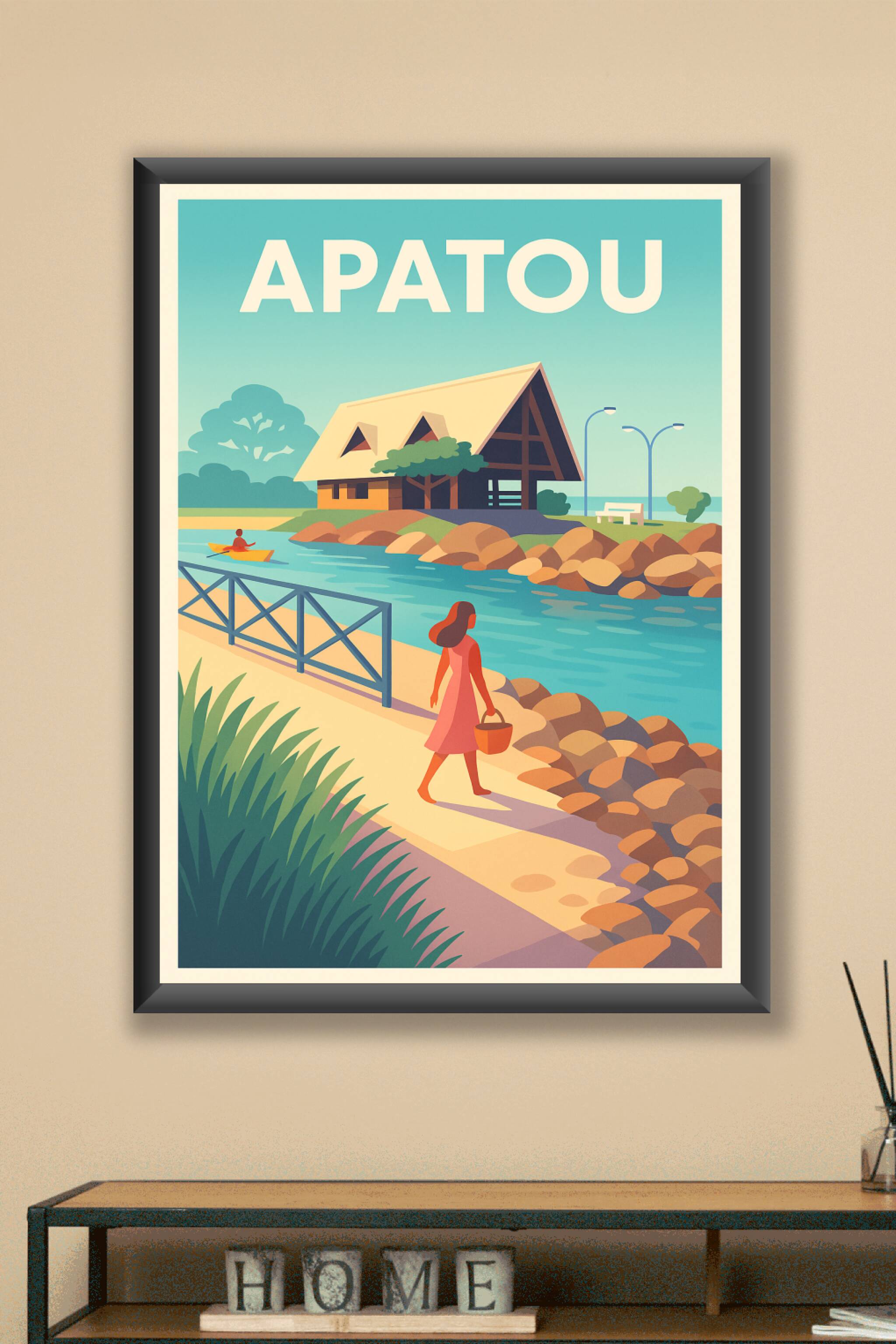 Découvrez la sérénité d'Apatou capturée dans cette affiche au style rétro et aux couleurs douces. Une scène paisible où une femme marche le long d'un canal bordé de rochers, avec une cabane traditionnelle en arrière-plan, idéale pour apporter une ambiance apaisante et naturelle à votre décoration intérieure. Ce poster est proposé en tirage "Fine Art" sur papier 305g coton, garantissant une qualité d'impression exceptionnelle et durable. Disponible en formats du A1 à A4, avec ou sans cadre, cette affiche s'adapte parfaitement à tous les espaces, que ce soit pour un salon, une chambre ou un bureau. Profitez d'un produit fabriqué en France, parfait pour offrir ou embellir votre intérieur avec une touche de douceur et d'évasion.