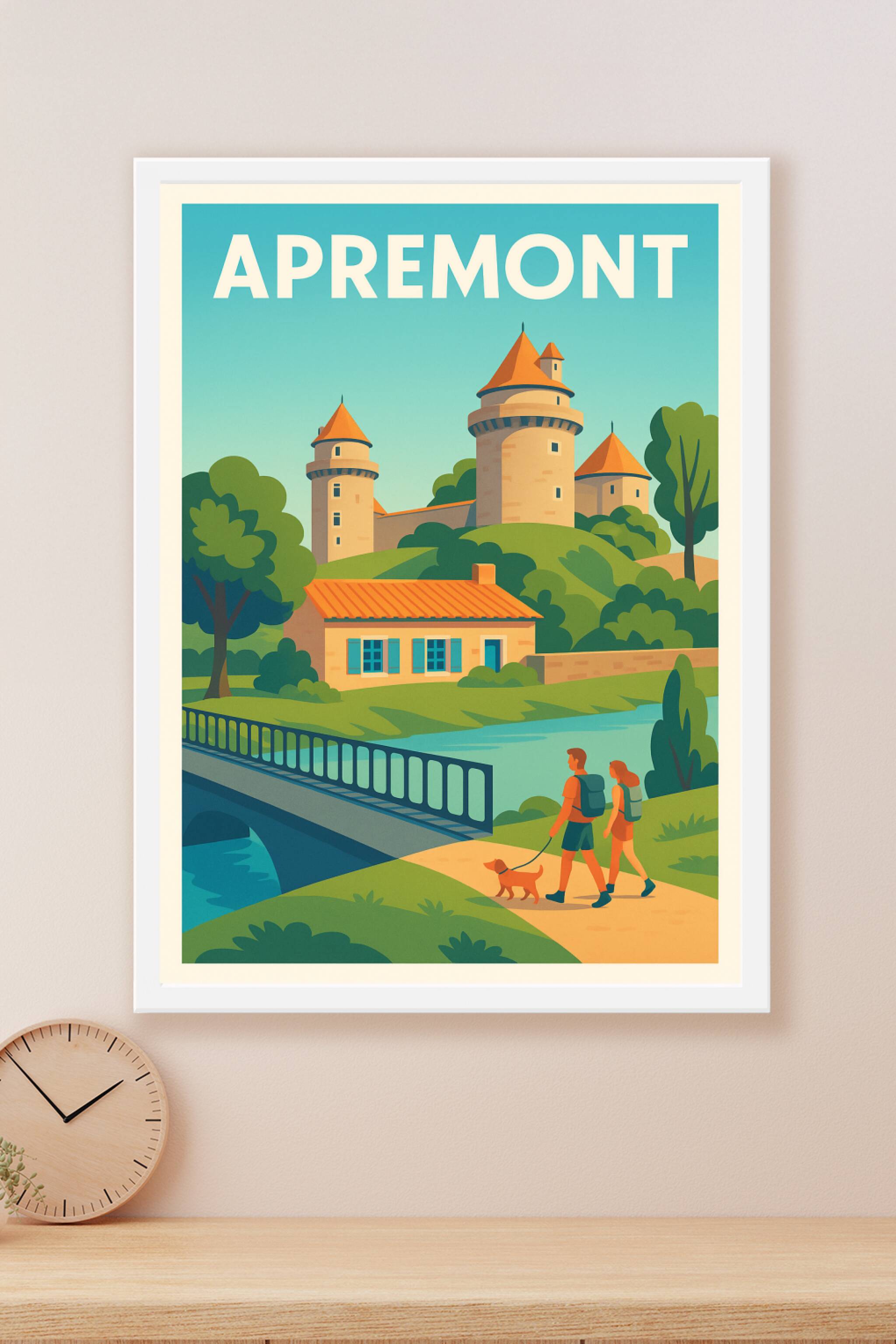 Découvrez l'atmosphère paisible et pittoresque d'Apremont avec cette magnifique affiche illustrée. Ce poster met en lumière les emblématiques tours...
