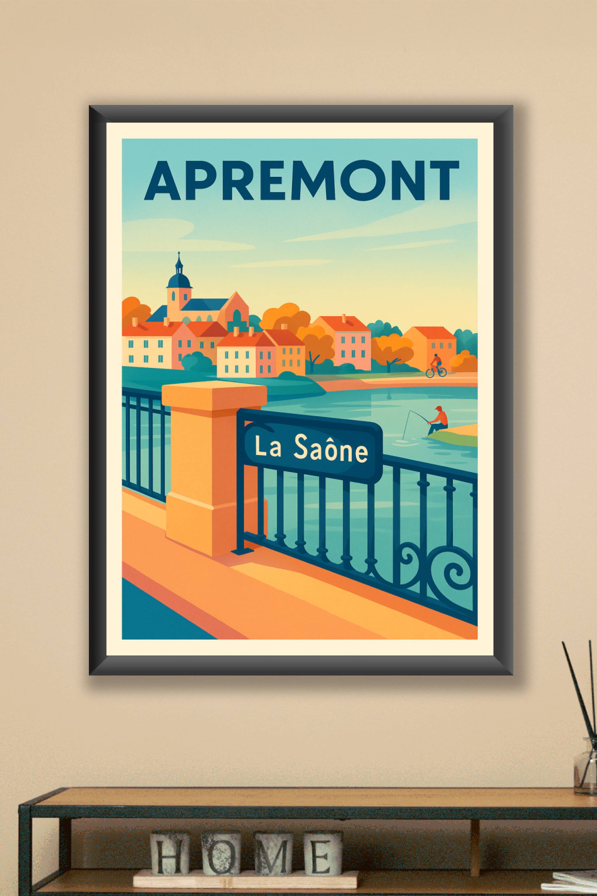 Découvrez le charme tranquille d'Apremont avec cette affiche illustrée d'une scène au bord de la Saône où maisons colorées, cycliste et pêcheur se ...