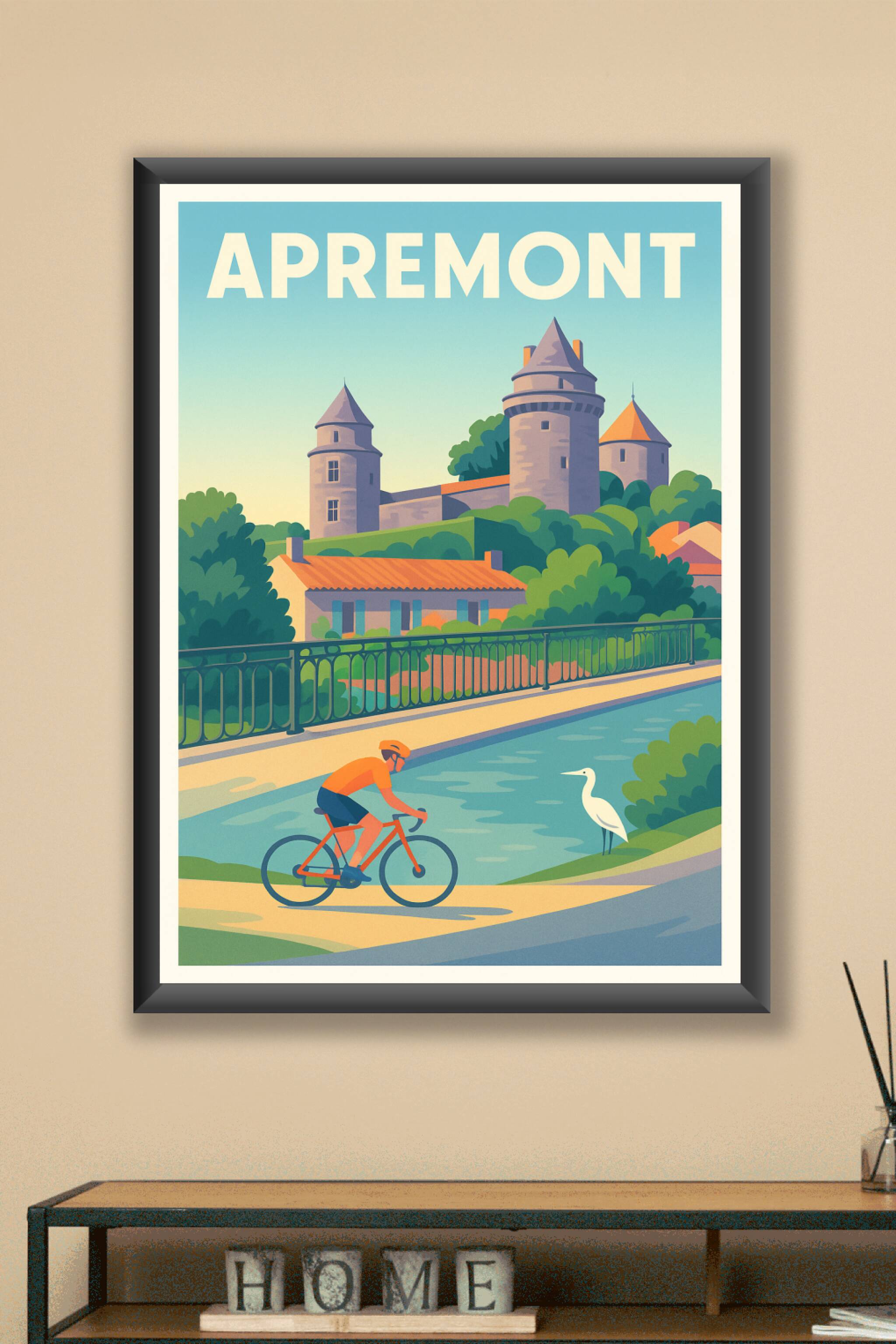 Découvrez le charme bucolique d'Apremont avec cette affiche illustrée qui capture à merveille la sérénité et la beauté intemporelle de la ville. L'image met en scène un cycliste traversant les abords paisibles du château médiéval, évoquant une promenade tranquille au cœur de paysages verdoyants et d'architectures historiques.Ce poster est imprimé en tirage "Fine Art" sur papier 305g coton, garantissant une qualité d'impression exceptionnelle et une tenue durable des couleurs. Disponible en formats A1 à A4, avec ou sans cadre, cette affiche apportera une touche élégante et accueillante à votre décoration intérieure.Parfait pour les amateurs d'art, les passionnés de voyage ou comme cadeau original, ce tirage reflète tout le charme authentique d'Apremont avec une finition premium 100% fabriquée en France.