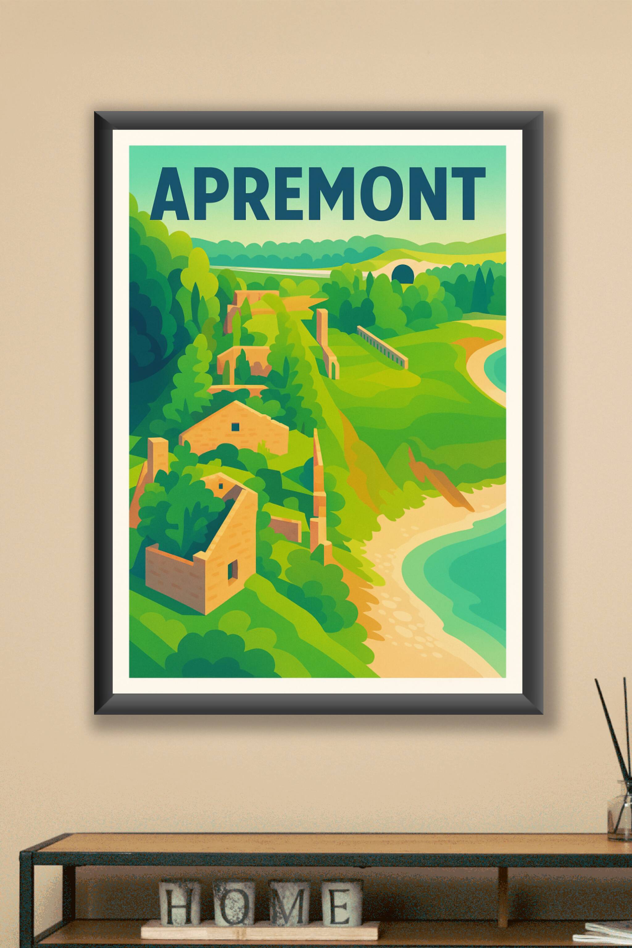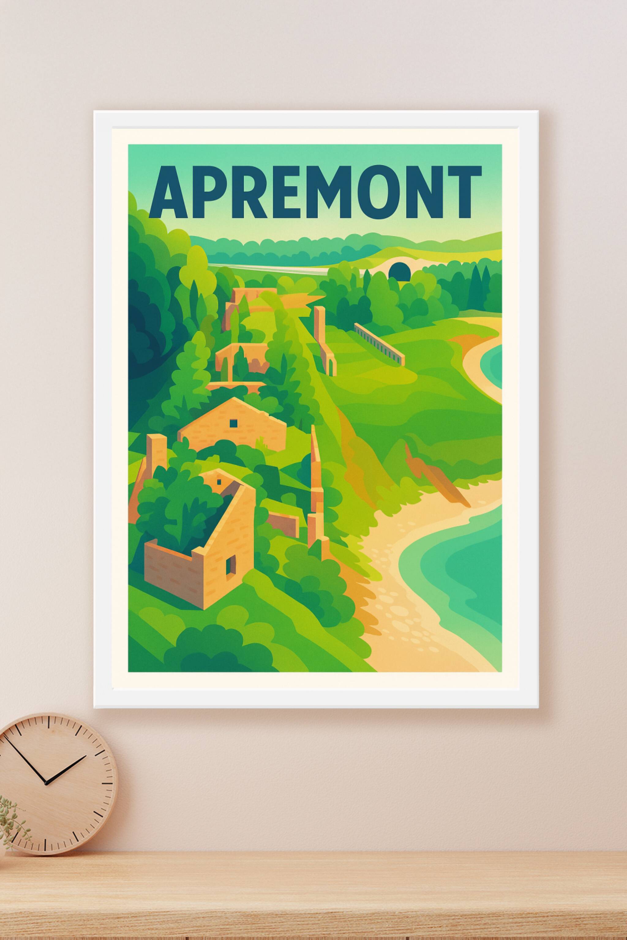 Découvrez la beauté paisible d'Apremont avec cette affiche au style graphique, mettant en valeur ses paysages verdoyants et ses ruines pittoresques...