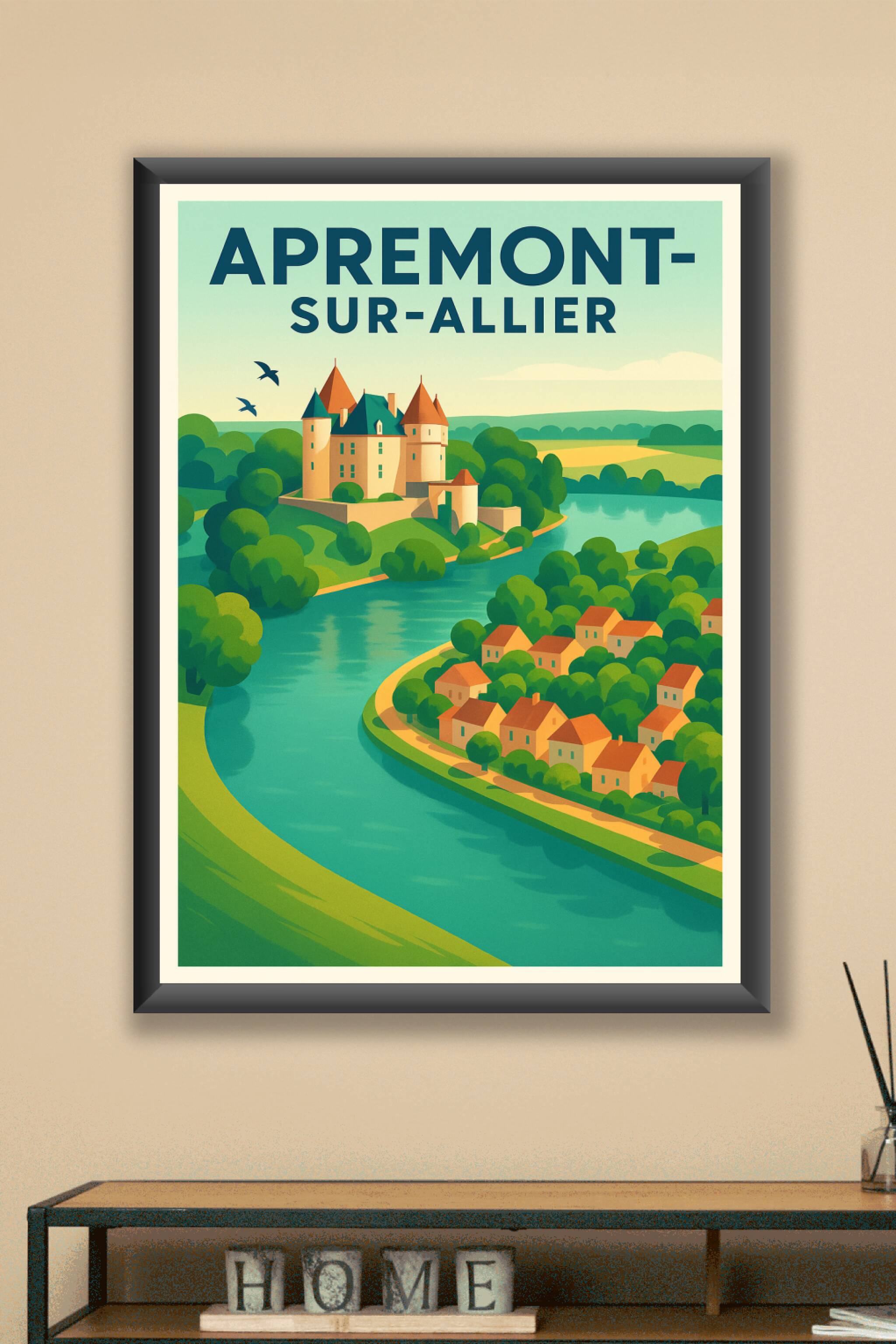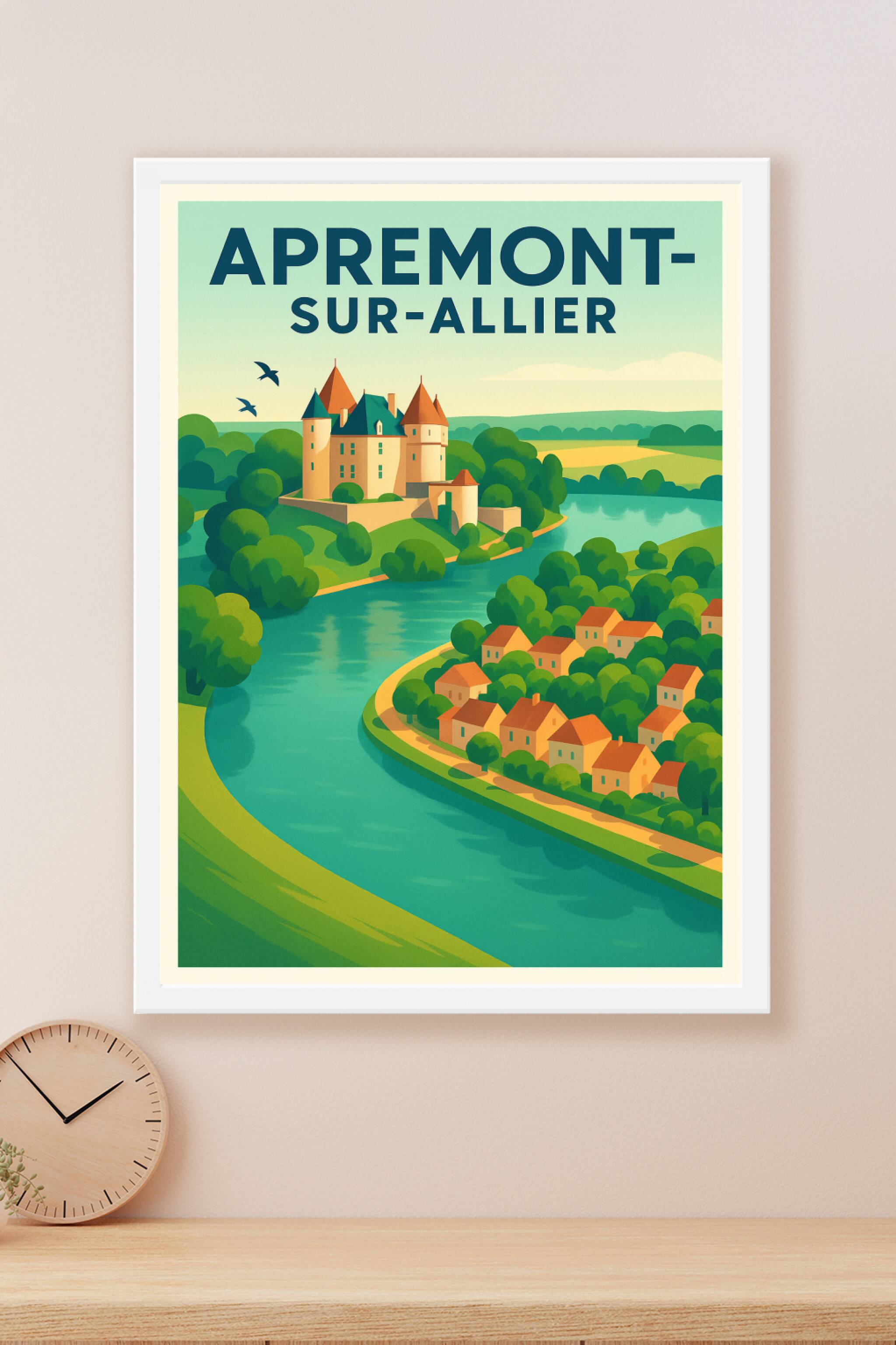 Découvrez la charmante quiétude d'Apremont-sur-Allier avec cette affiche au style vintage, mettant en scène son château emblématique et les douces ...