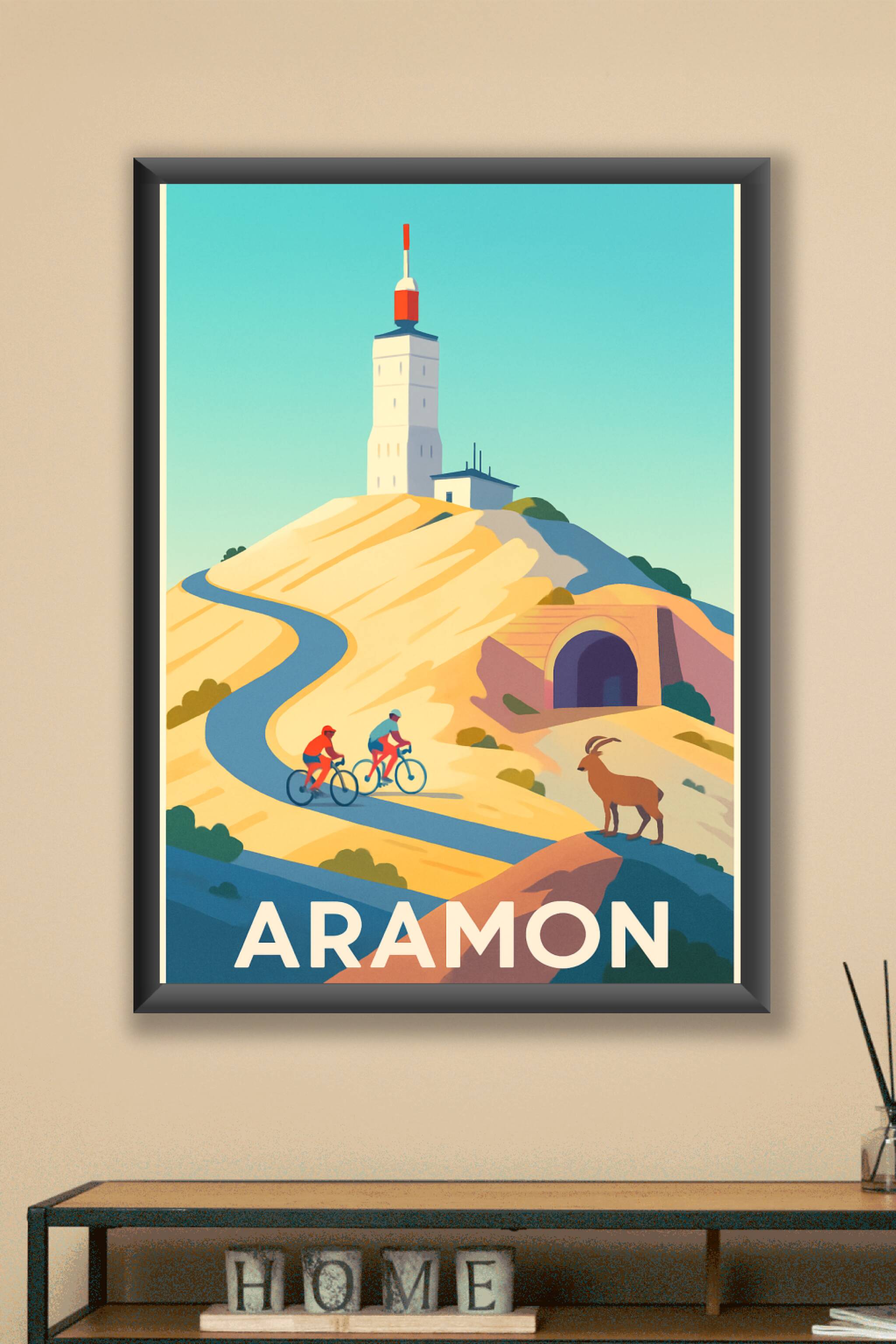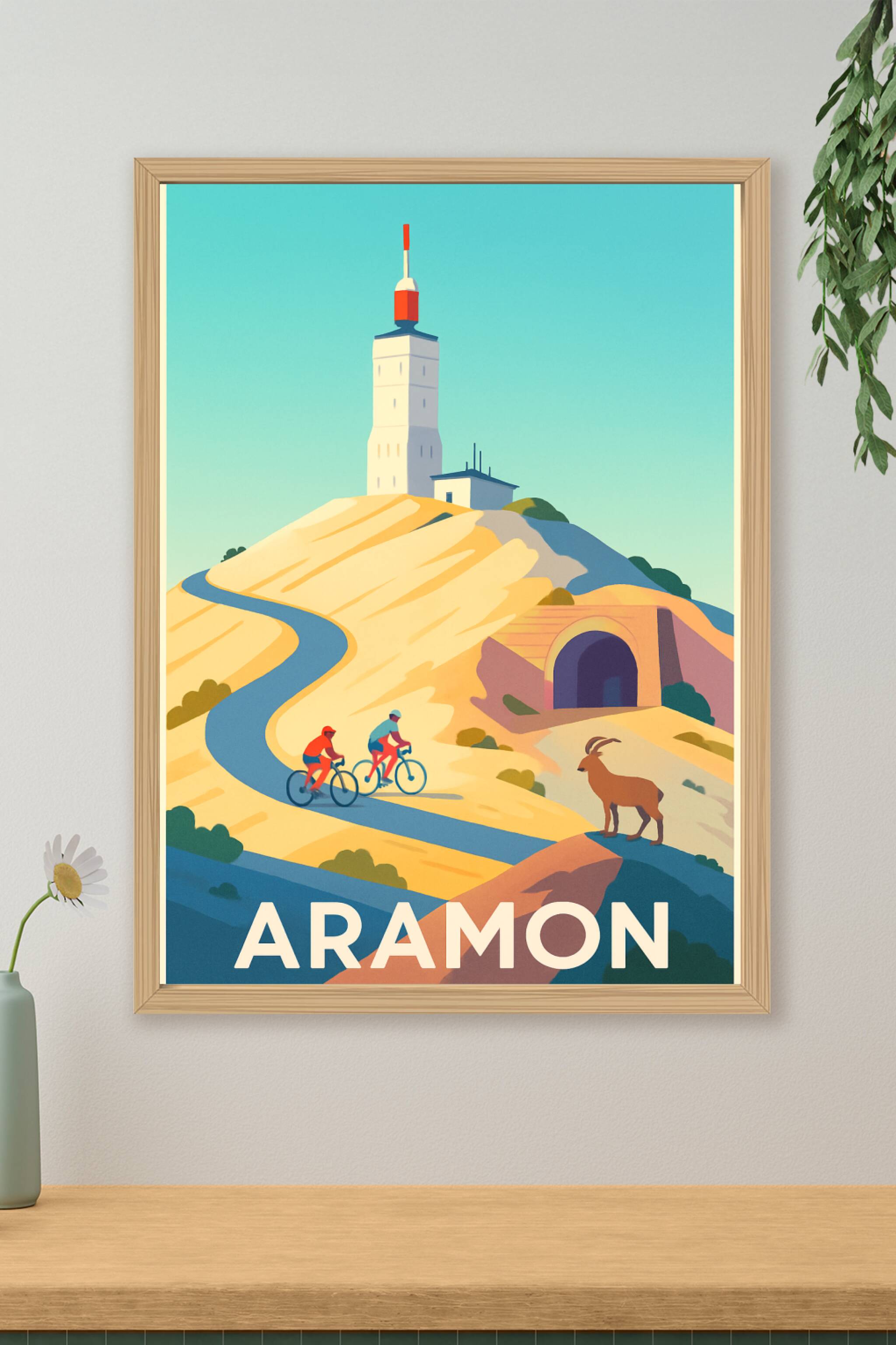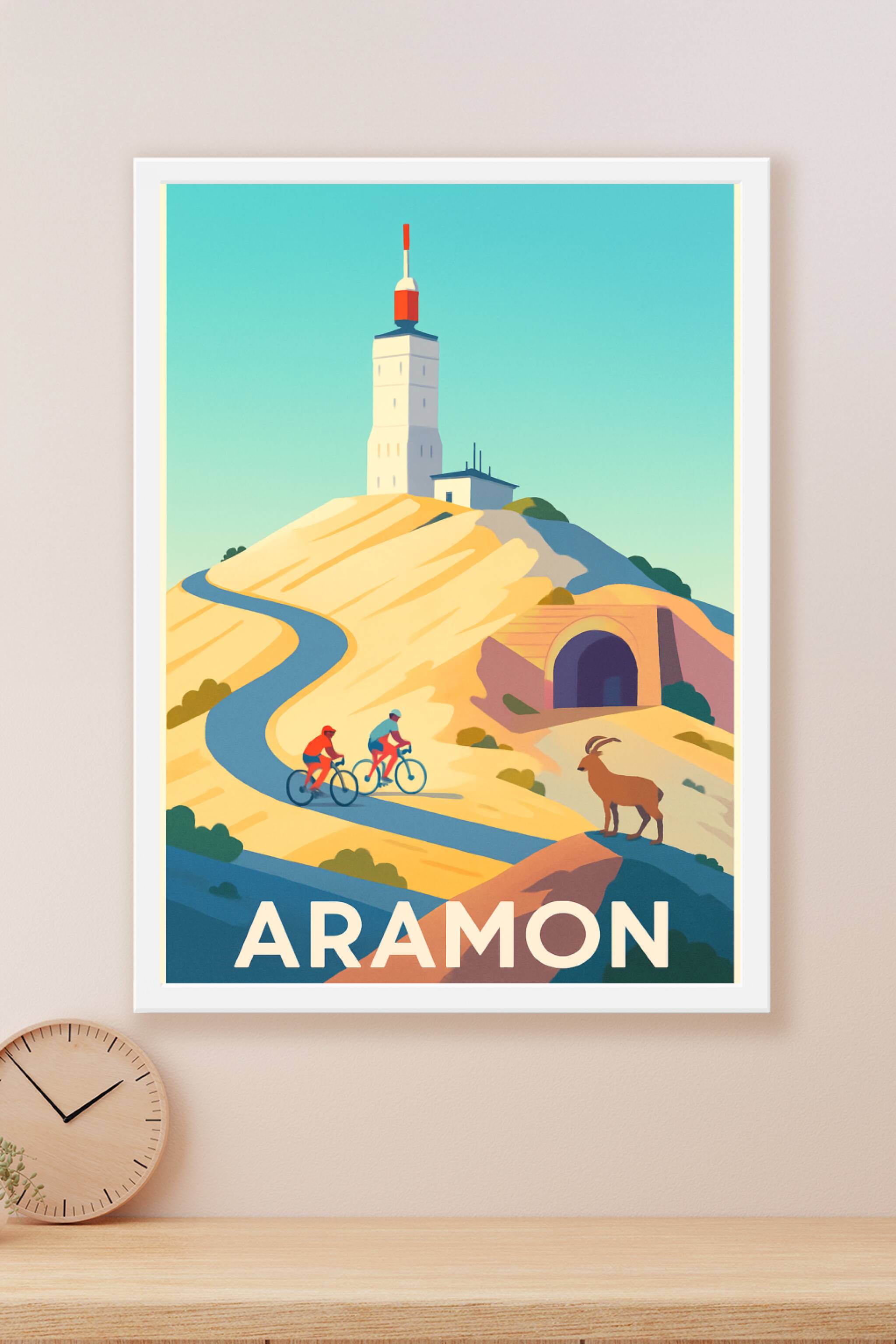 Découvrez la beauté sauvage et la tranquillité d'Aramon avec cette affiche élégante illustrant deux cyclistes gravissant la célèbre montée sous un ...