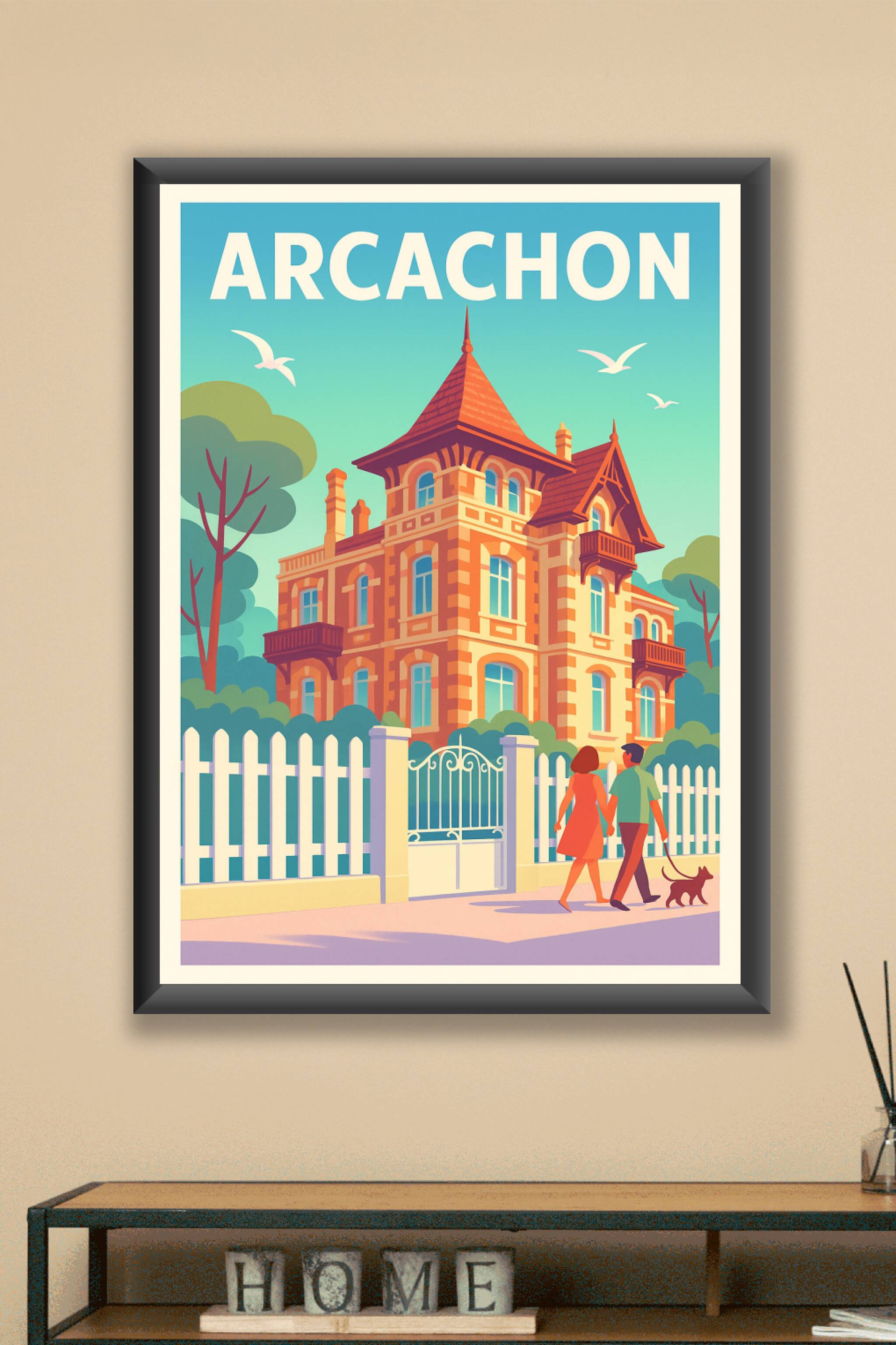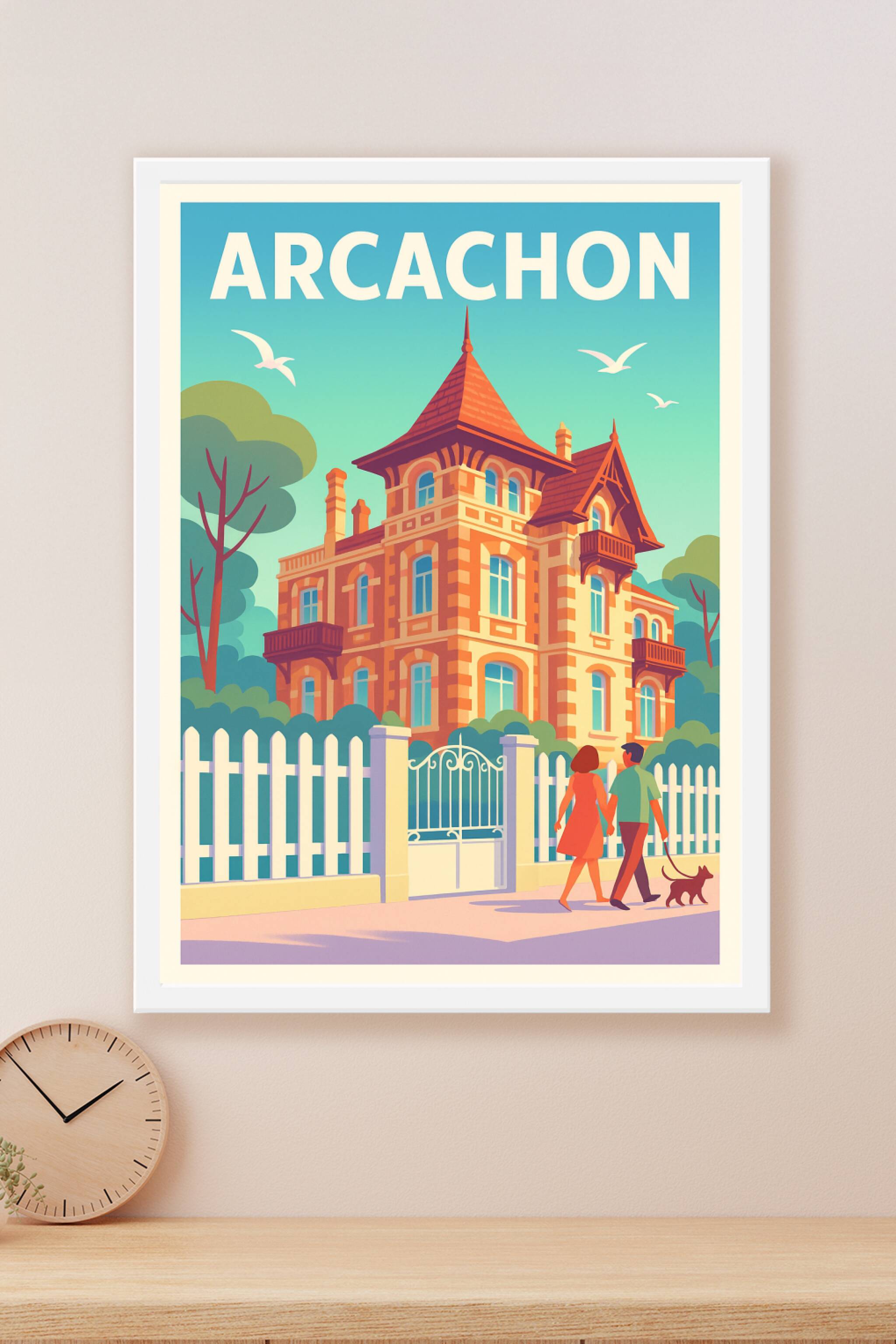 Découvrez l'élégance intemporelle d'Arcachon avec cette affiche vintage mettant en scène une magnifique villa typique de la ville, entourée de verd...