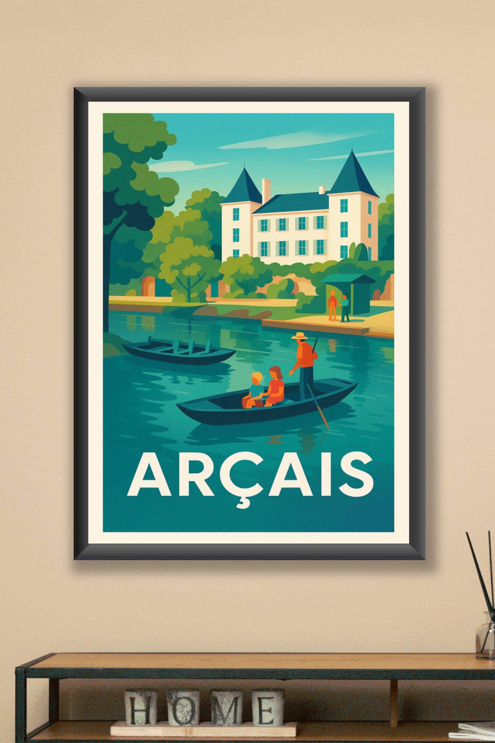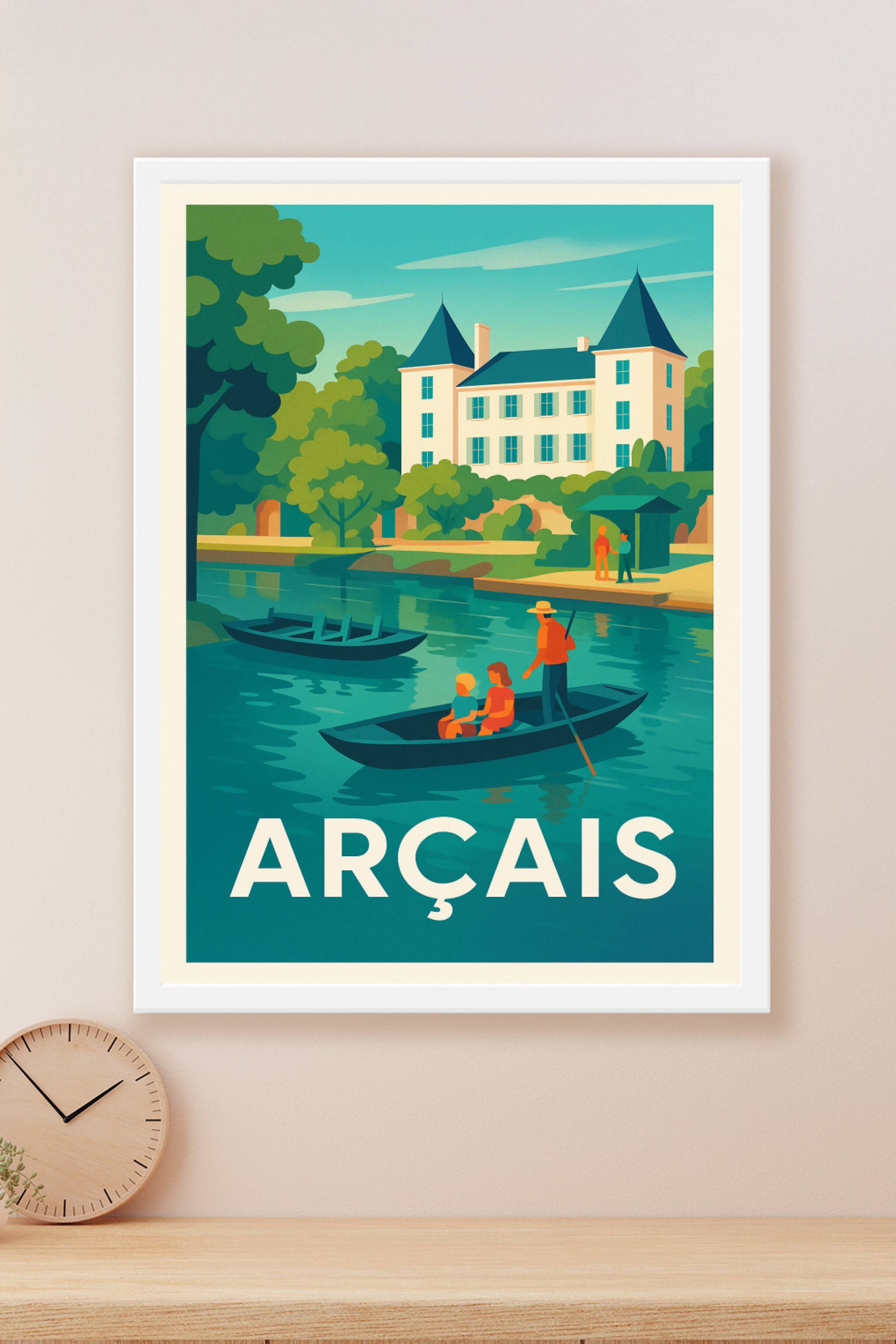 Découvrez l'ambiance paisible et bucolique d'Arçais avec cette affiche vintage illustrant une promenade en barque sur le canal, face aux majestueus...