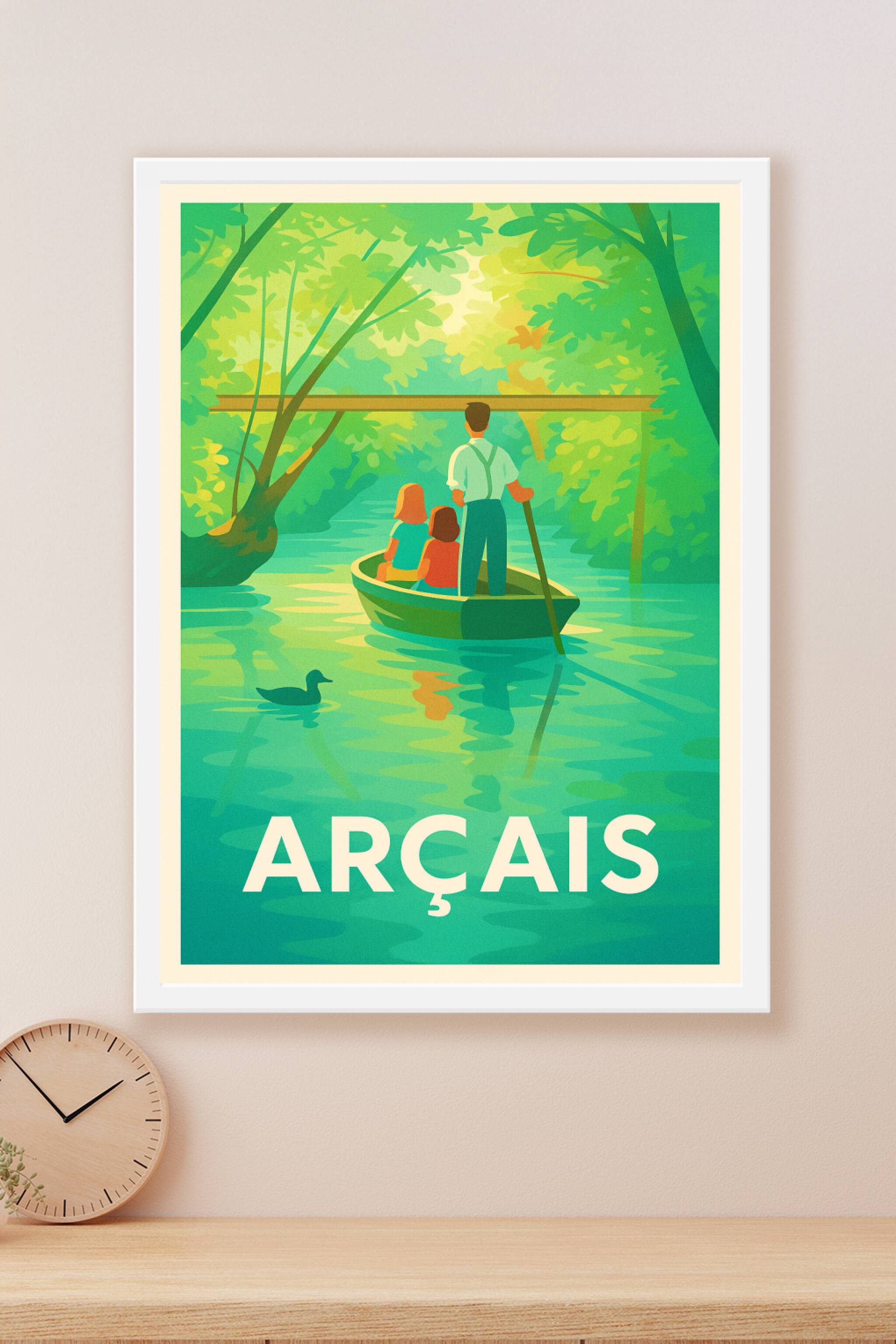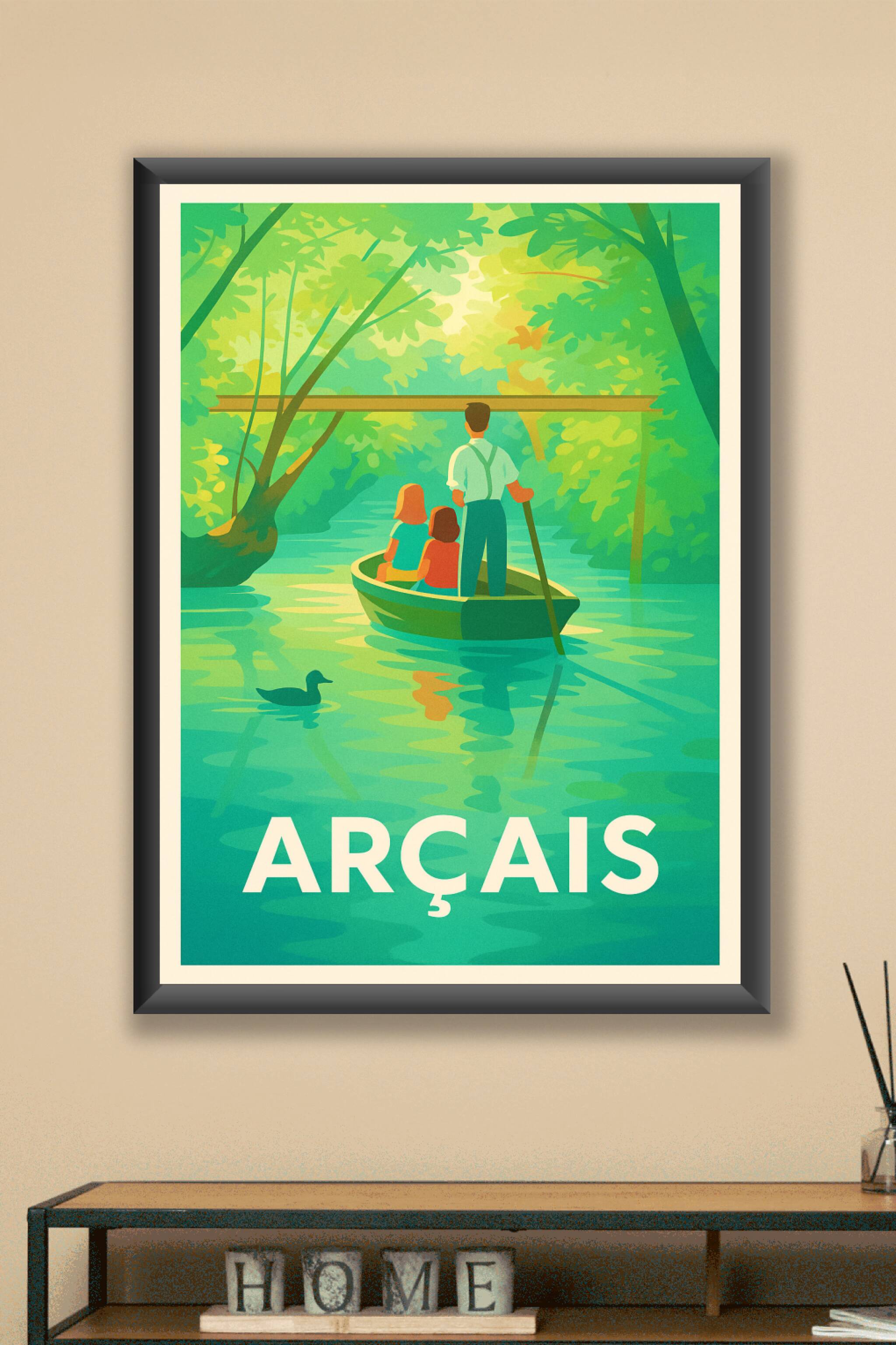 Découvrez l'ambiance paisible et verdoyante d'Arçais à travers cette affiche illustrée, où un homme guide une barque sur une rivière bordée d'arbre...