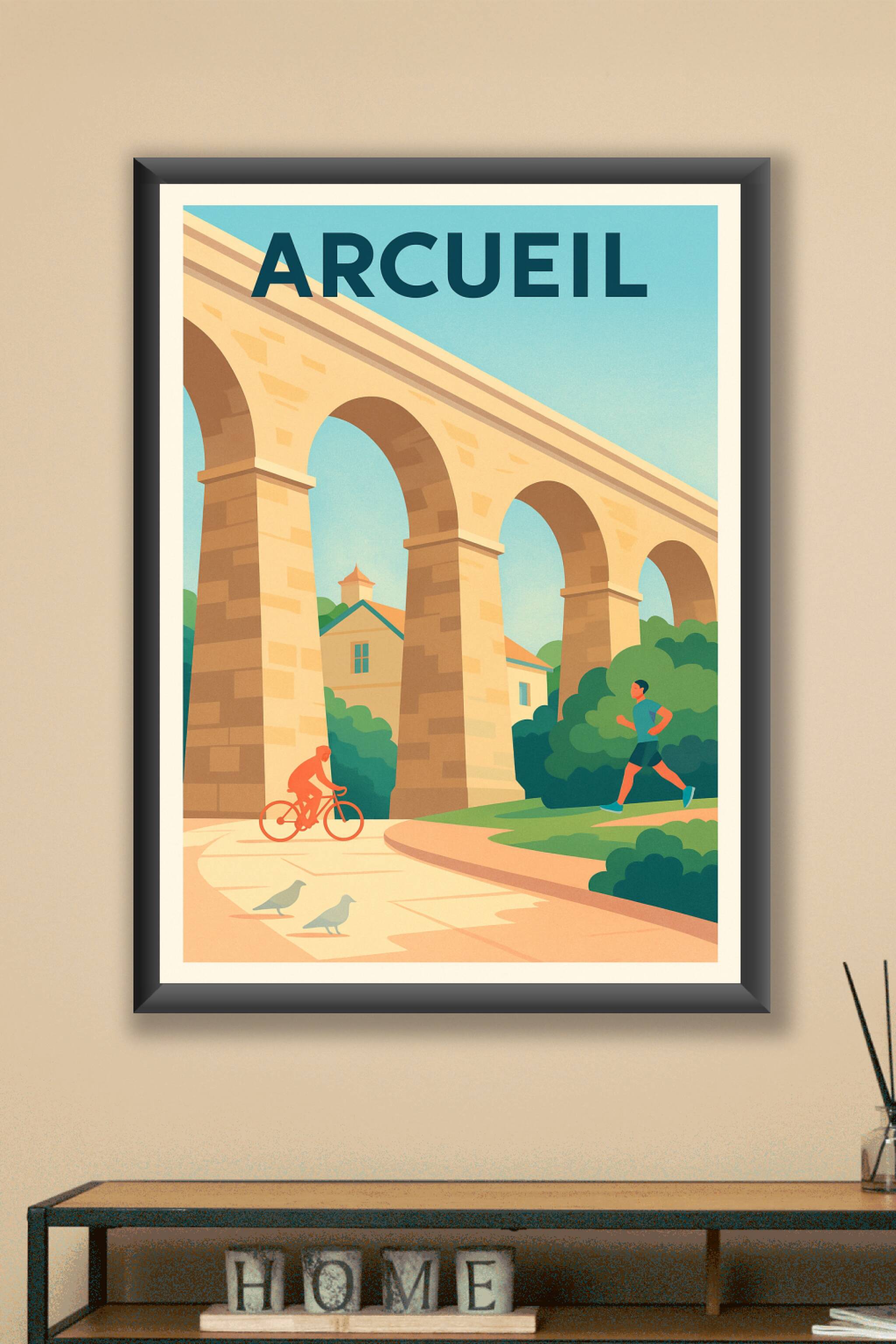 Apportez une touche de sérénité et de dynamisme à votre intérieur avec cette affiche célébrant la ville d'Arcueil et son célèbre aqueduc. Ce poster au style épuré met en avant l’équilibre parfait entre le patrimoine architectural et les activités de plein air, illustré par un cycliste et un joggeur sous un ciel lumineux. Imprimée en tirage "Fine Art" sur papier 305g coton, cette affiche garantit une qualité d'impression exceptionnelle et des couleurs riches et durables. Disponible en formats A1 à A4, avec ou sans cadre, elle s'adapte facilement à tout type de décoration. Sublimez votre espace ou offrez un souvenir authentique d'Arcueil grâce à ce poster unique, 100% fabriqué en France.