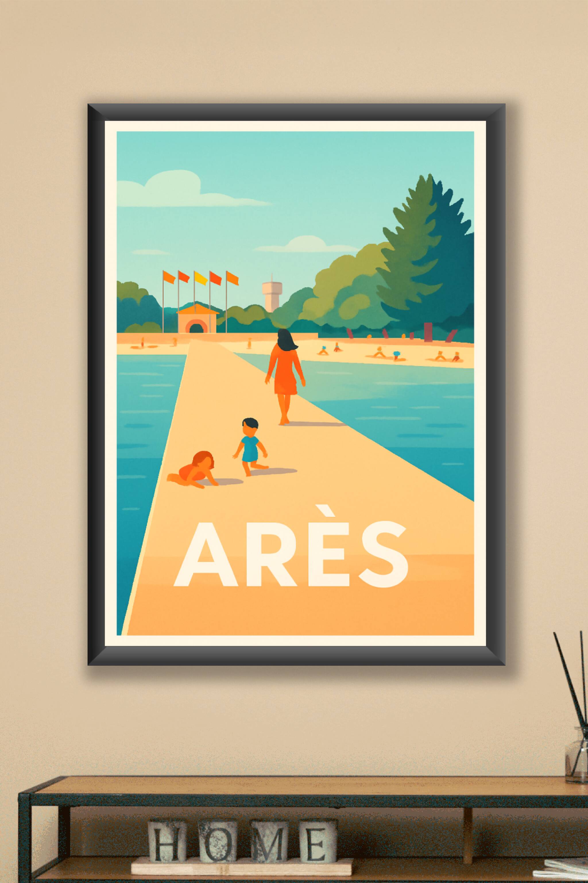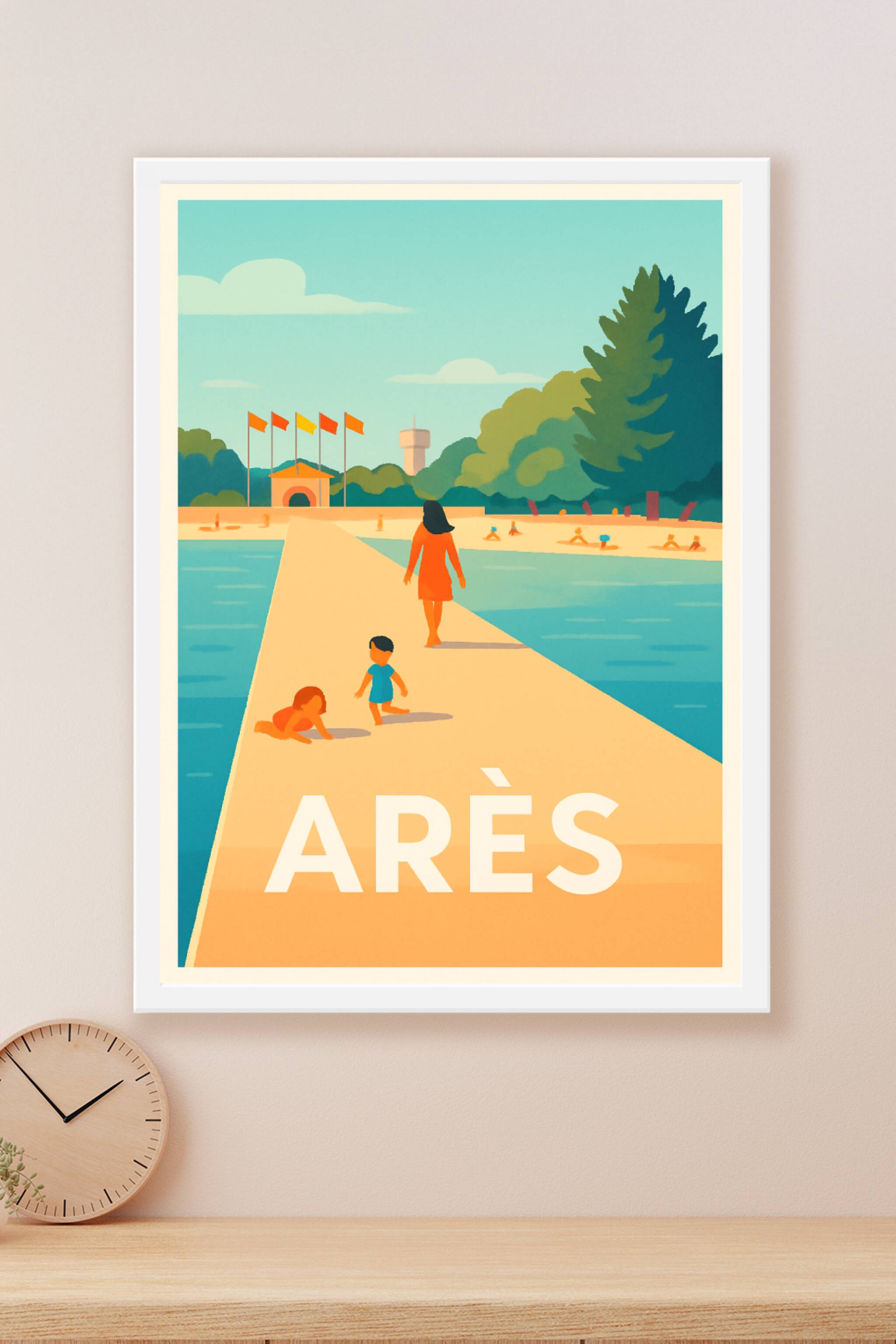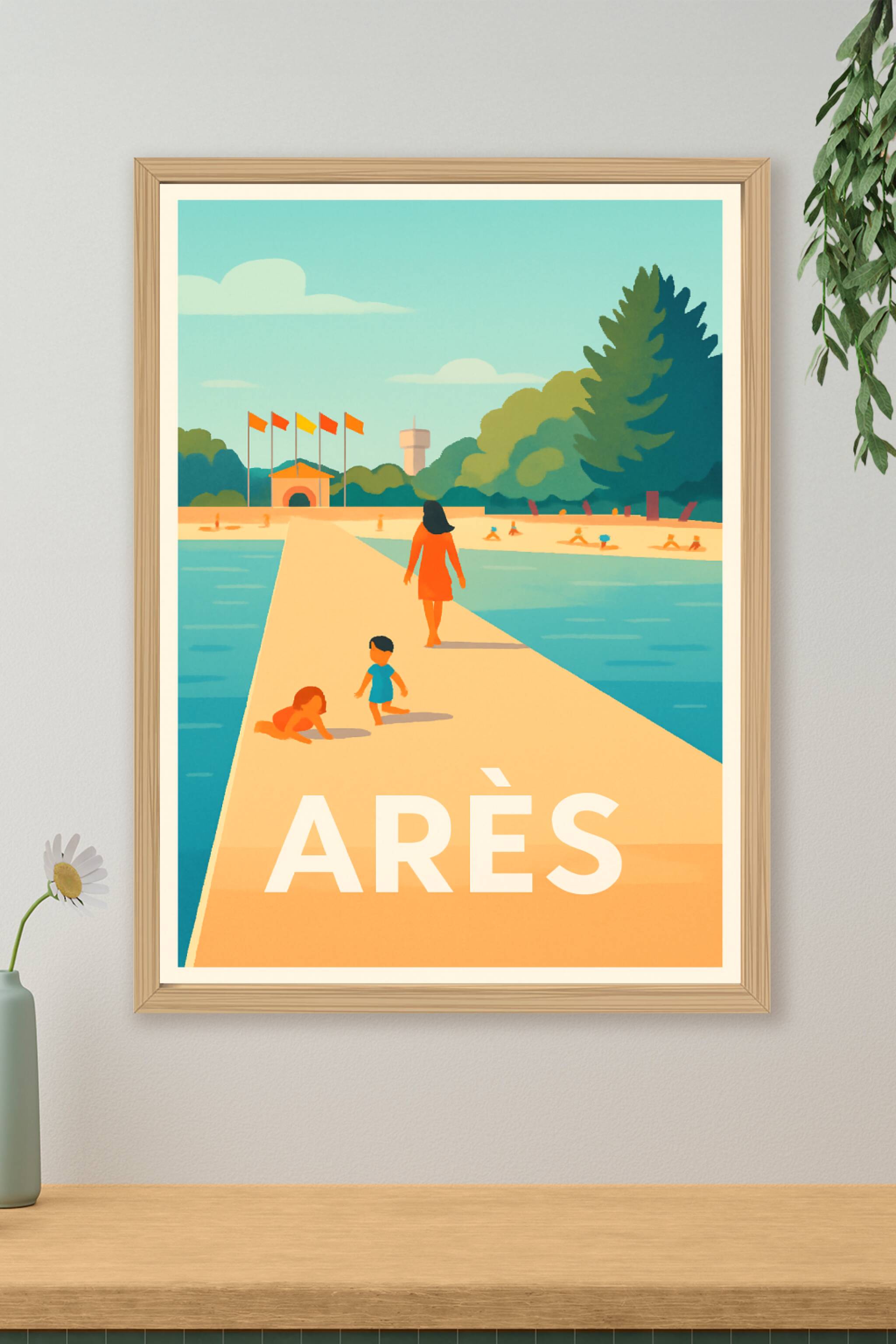 Découvrez la douceur de vivre d'Arès à travers cette affiche rétro illustrant une promenade ensoleillée le long du bassin d'Arcachon. Une ambiance ...