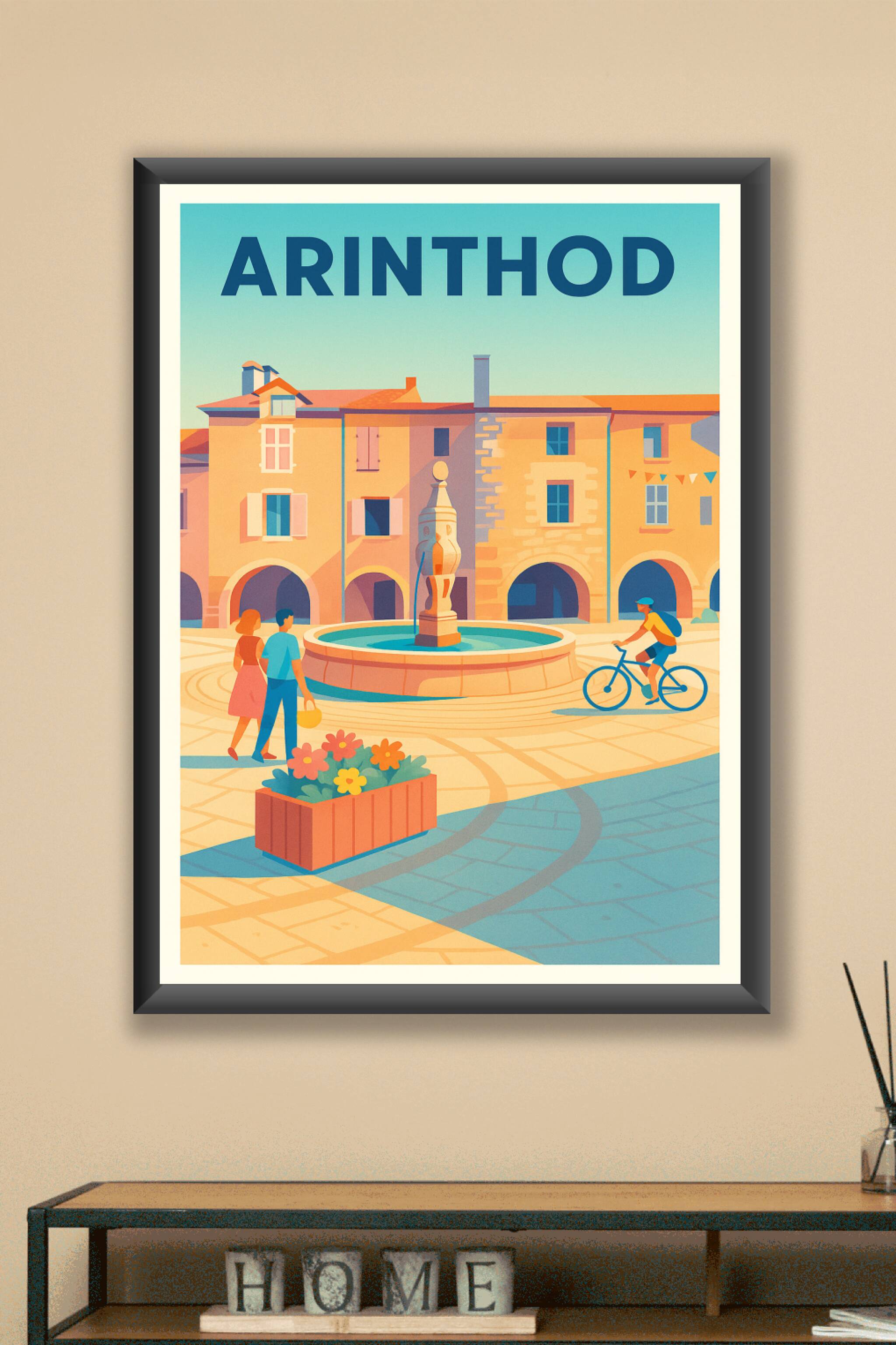 Découvrez la douce ambiance d'Arinthod capturée dans cette affiche illustrée aux couleurs chaudes et lumineuses. La place centrale, avec sa fontain...