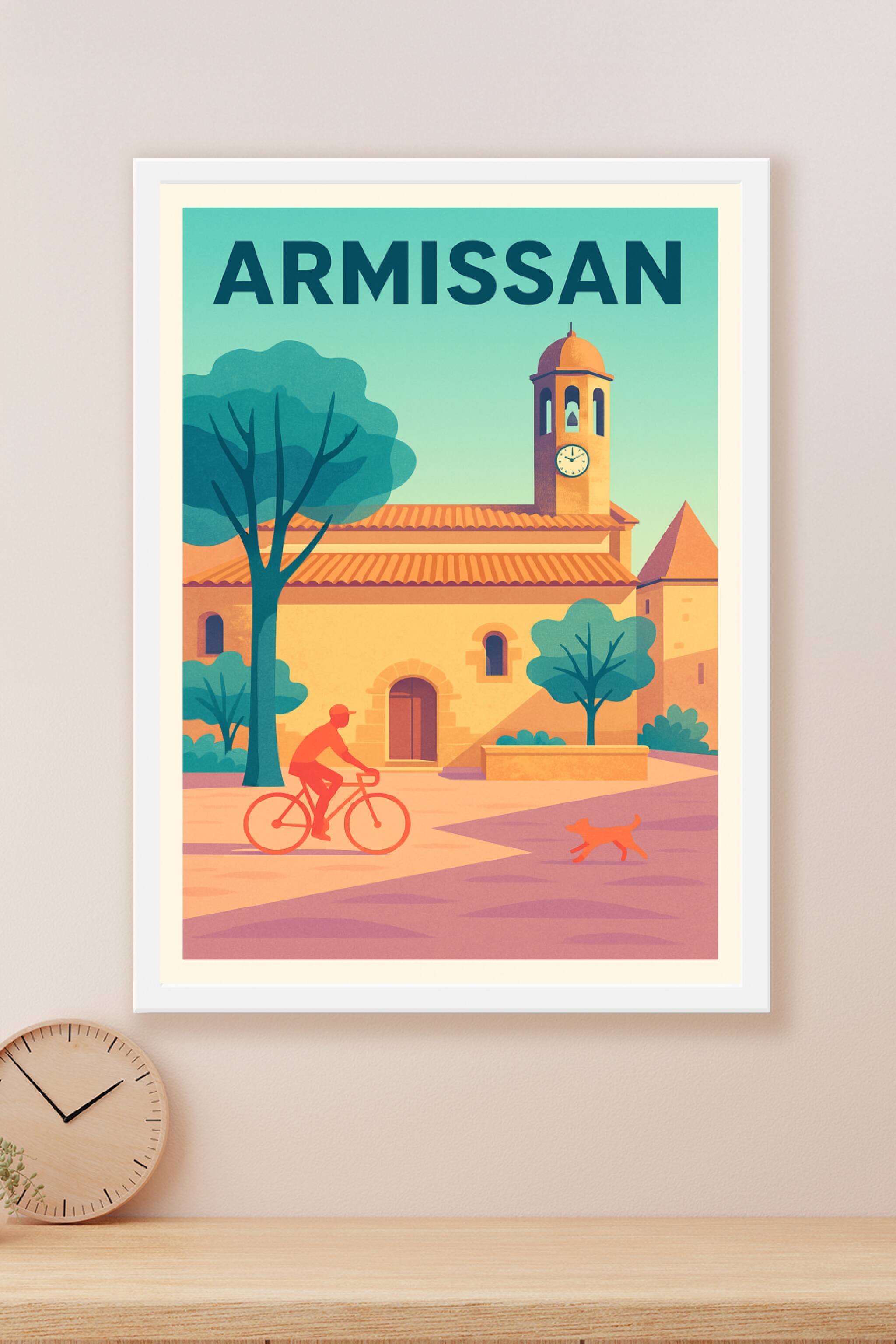 Découvrez le charme tranquille d'Armissan avec ce poster élégant qui met en lumière l'architecture typique de cette ville pittoresque. L’affiche illustre un cycliste et un chien dans une ambiance douce et ensoleillée, avec un clocher emblématique au centre de la composition.Ce poster est disponible en tirage "Fine Art", imprimé sur un papier de qualité 305g coton assurant des couleurs éclatantes et une durabilité optimale. Choisissez parmi plusieurs formats de A1 à A4, avec ou sans cadre, pour parfaitement s'adapter à votre espace de vie ou de travail. Cette affiche de style vintage est l’ajout parfait pour apporter une touche chaleureuse et authentique à votre décoration intérieure, ou pour offrir un souvenir raffiné d’Armissan.