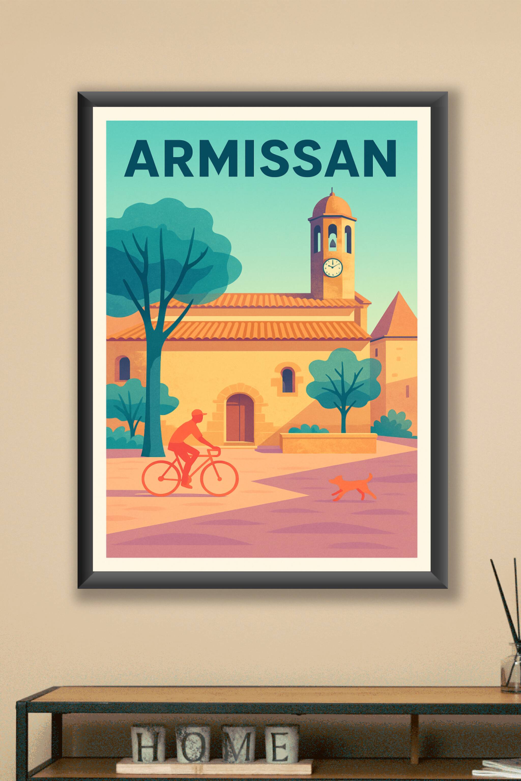 Découvrez le charme tranquille d'Armissan avec ce poster élégant qui met en lumière l'architecture typique de cette ville pittoresque. L’affiche il...
