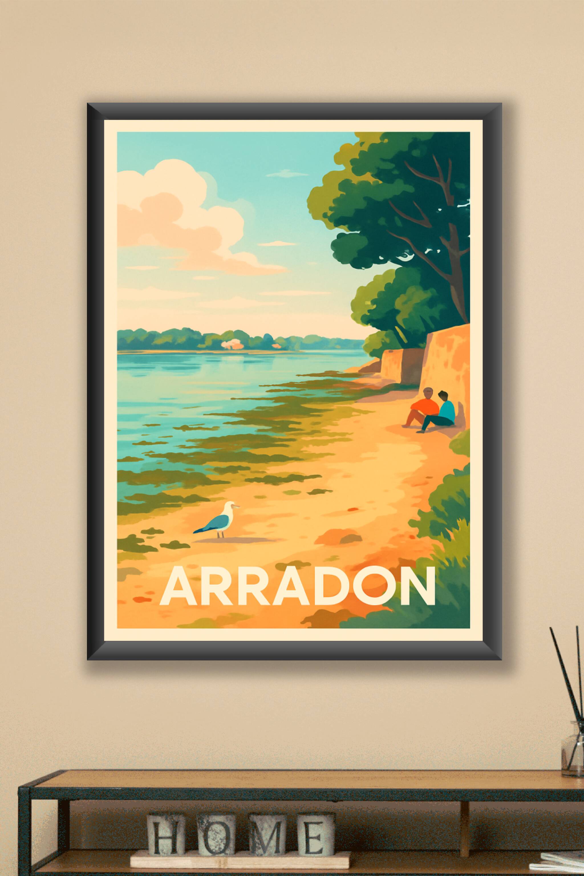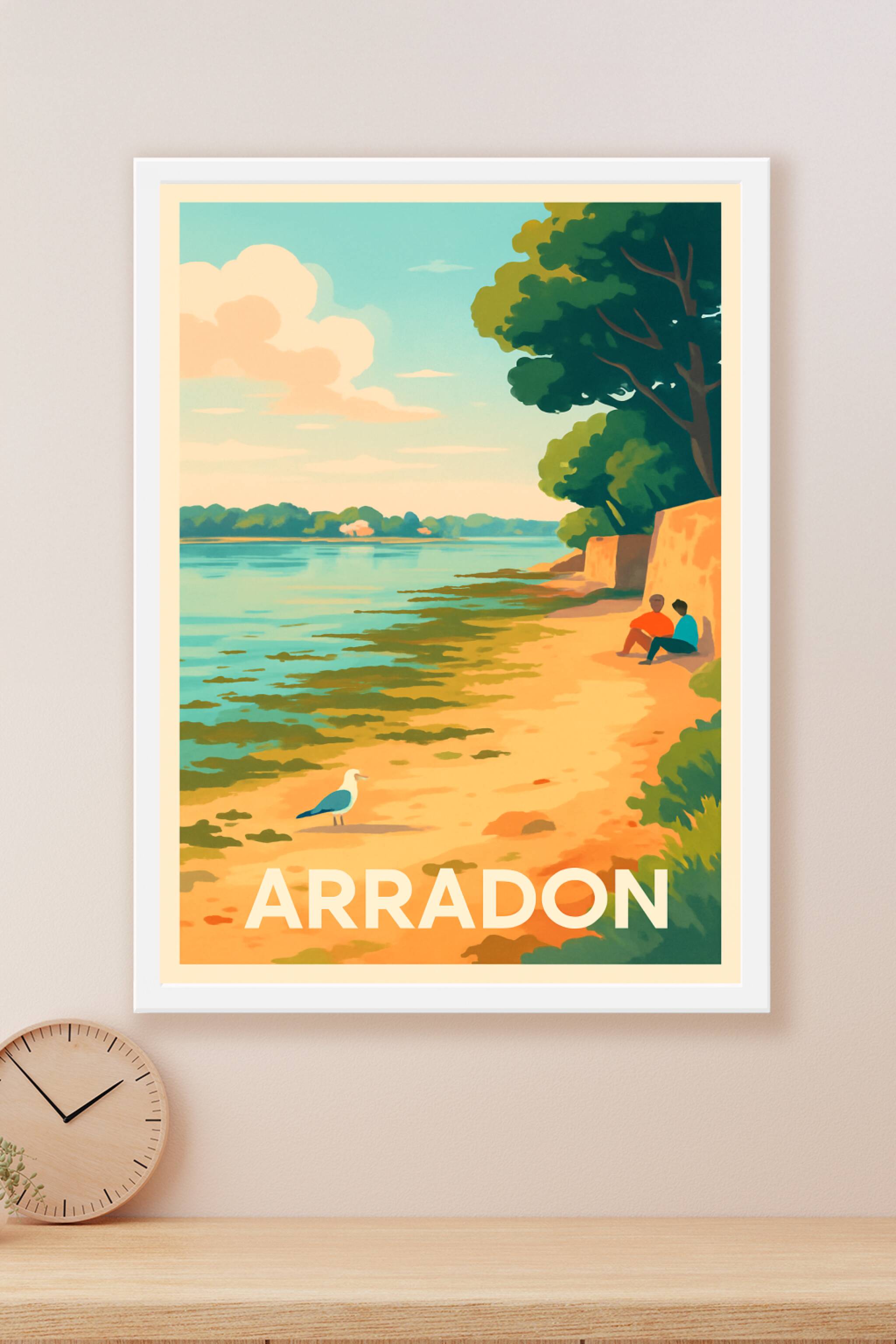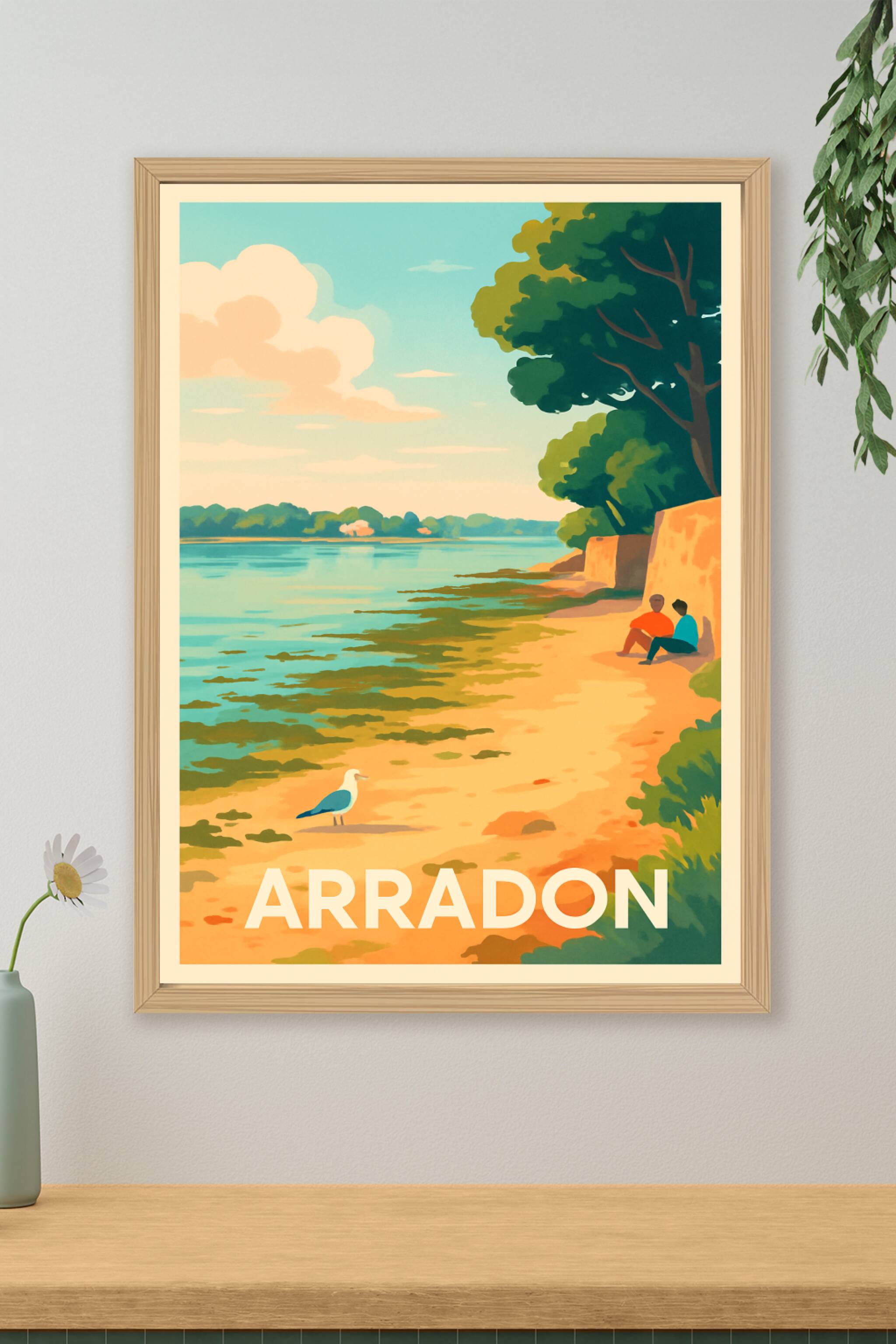 Découvrez l'atmosphère sereine et bucolique d'Arradon avec cette affiche qui capture la douceur d'une balade au bord de l'eau, entre sable doré, vé...