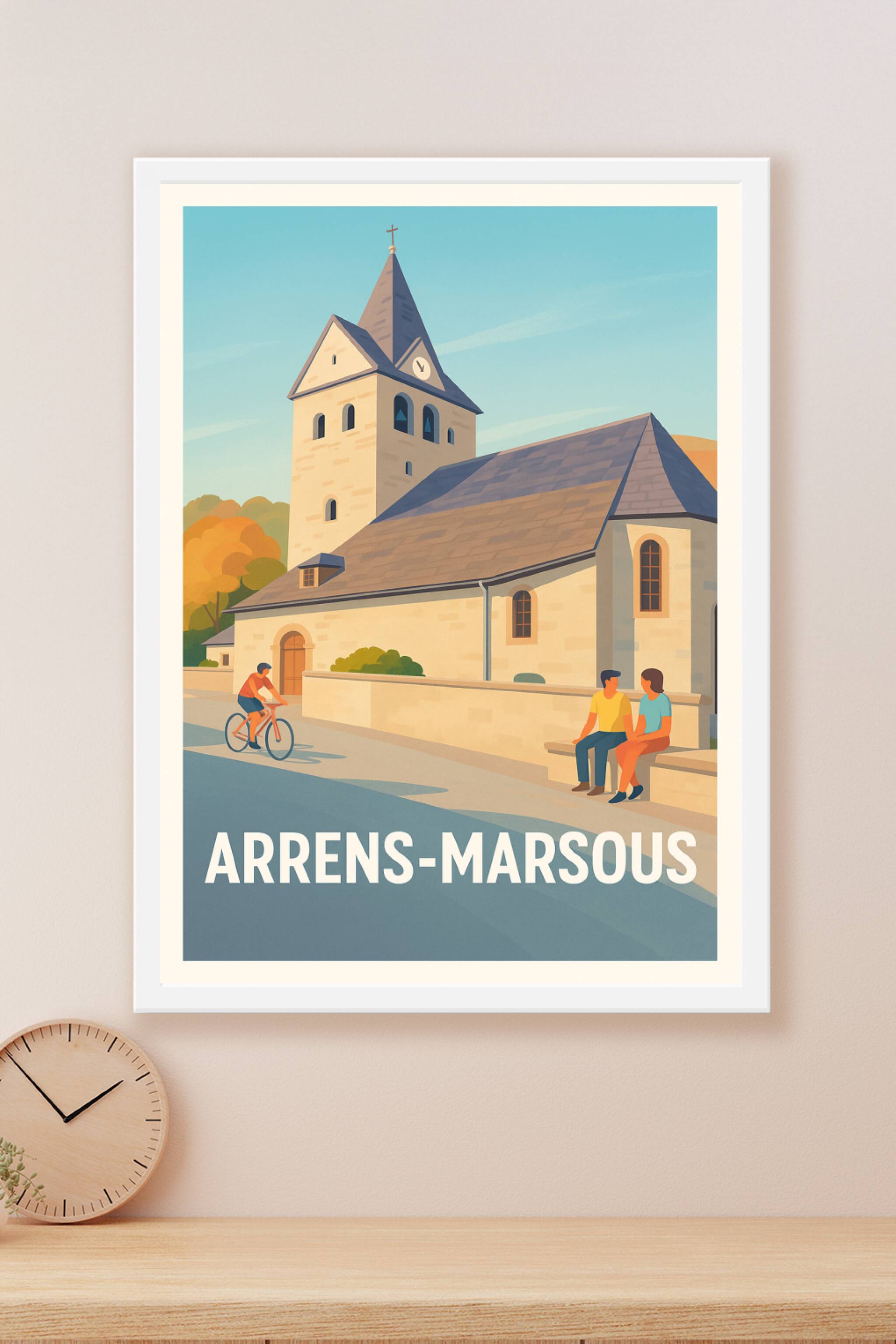 Découvrez l'élégance paisible d'Arrens-Marsous à travers cette affiche illustrée mettant en scène une église typique baignée de lumière chaude, ent...