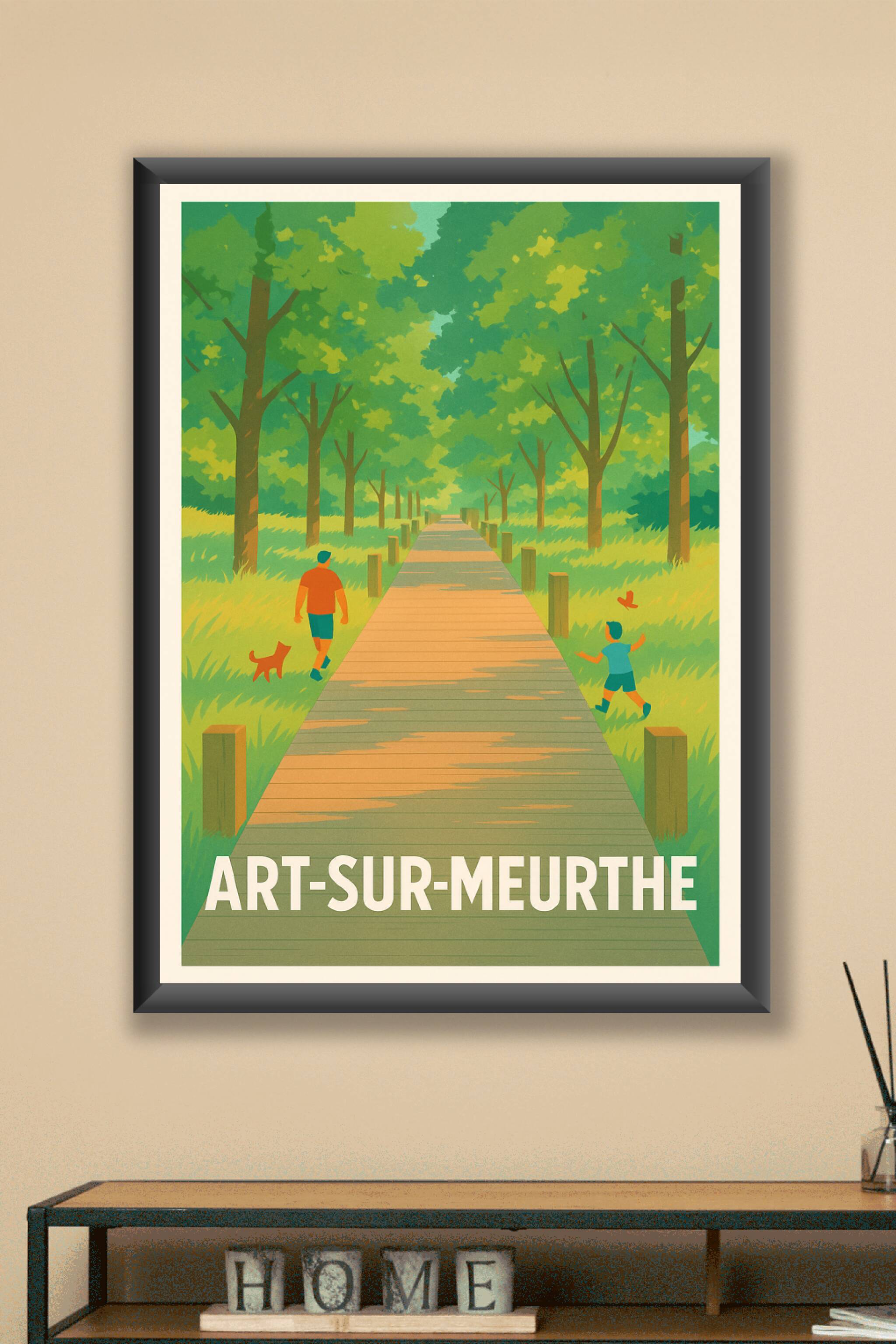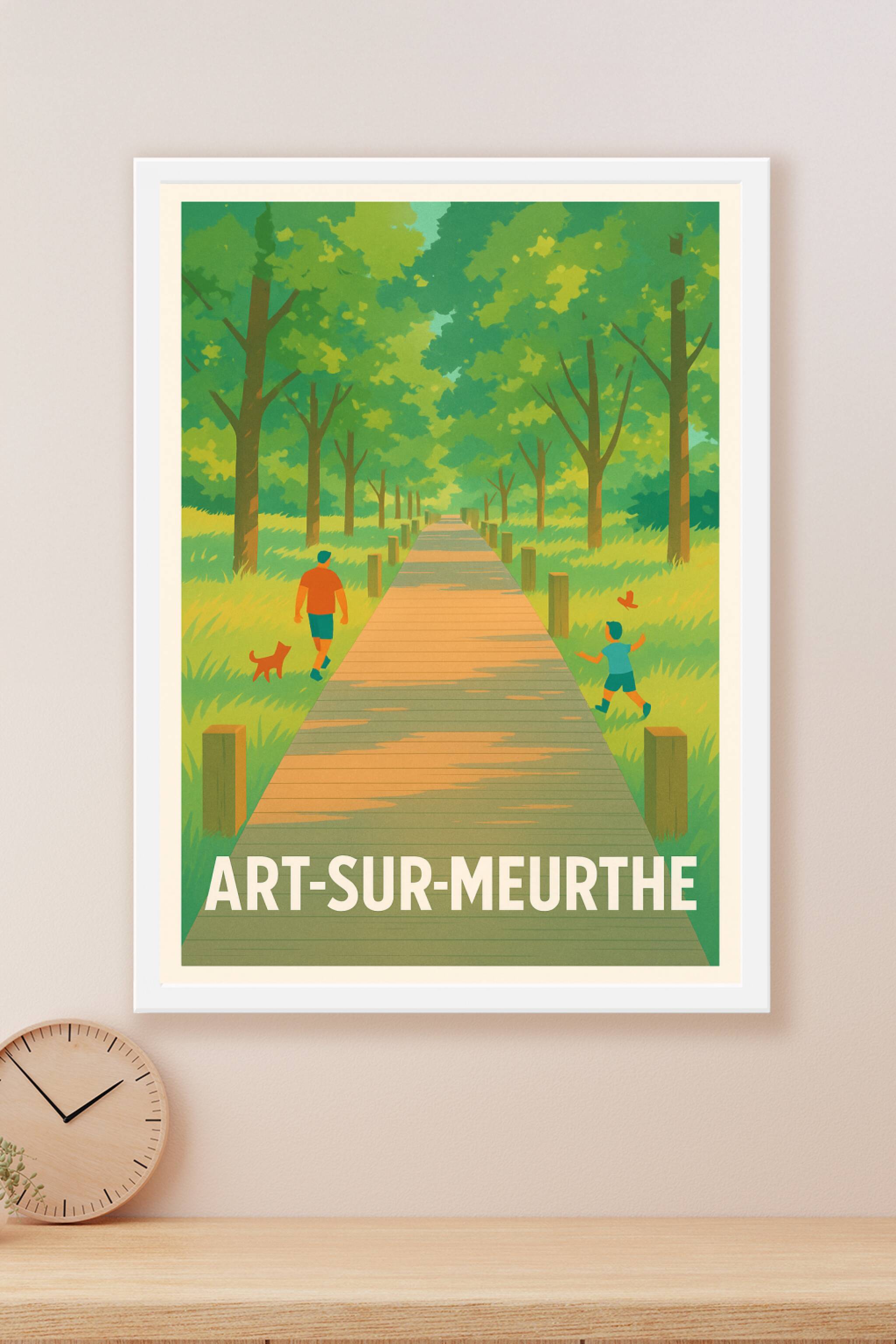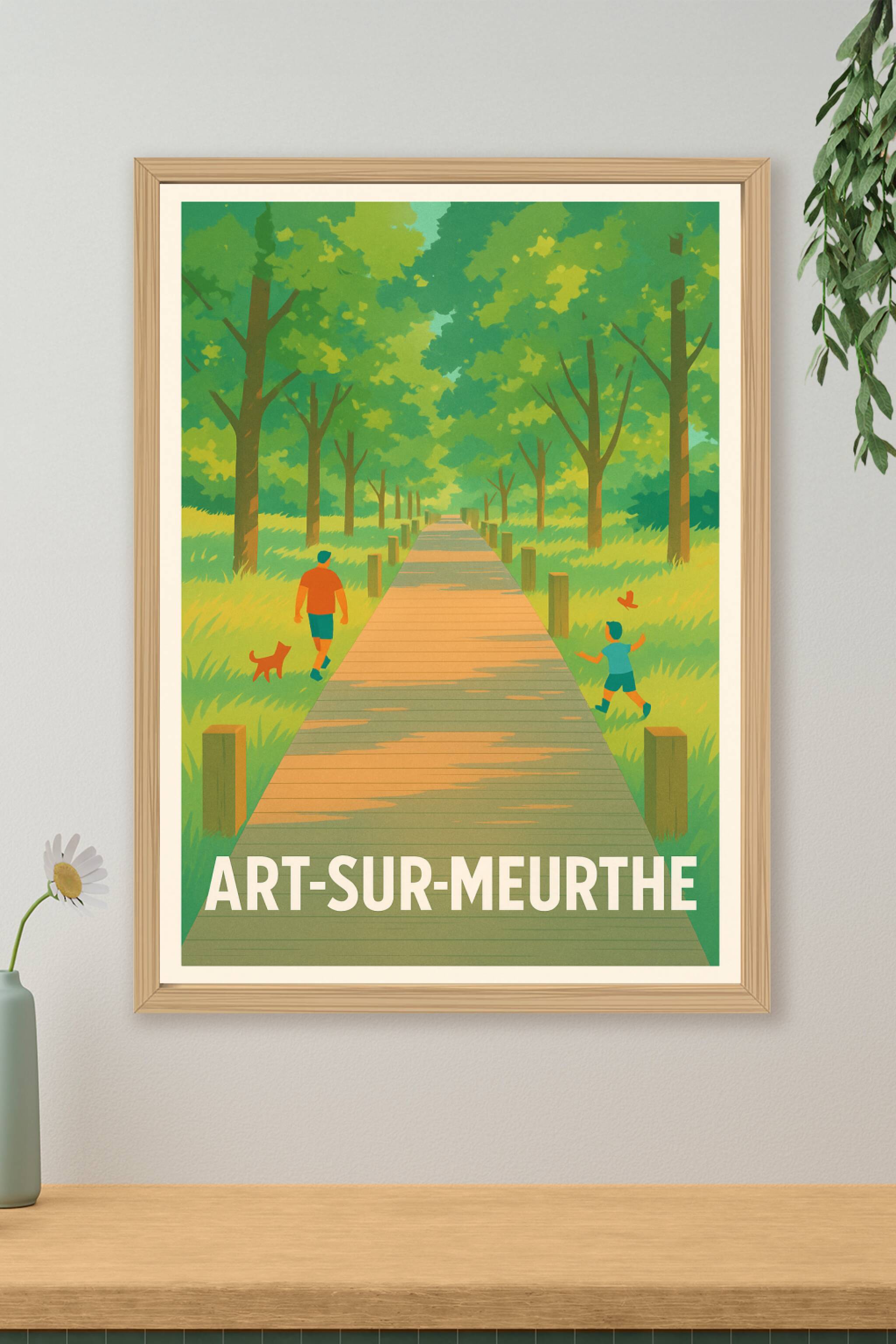 Évadez-vous dans la sérénité d'Art-sur-Meurthe avec cette affiche au style vintage illustrant une paisible promenade sous un voûte d'arbres verdoyants. Un père et son enfant accompagnés d'un petit chien rythment ce chemin ensoleillé, symbole de calme et d'harmonie naturelle.Ce poster est imprimé en tirage "Fine Art" sur papier 305g coton, garantissant une qualité d'impression exceptionnelle et une longévité optimale. Disponible du format A1 au format A4, avec ou sans cadre, cette affiche apportera une touche apaisante et authentique à votre décoration intérieure.Profitez de cette impression premium 100% fabriquée en France pour offrir un souvenir élégant ou embellir votre habitat avec un éclairage naturel et chaleureux.