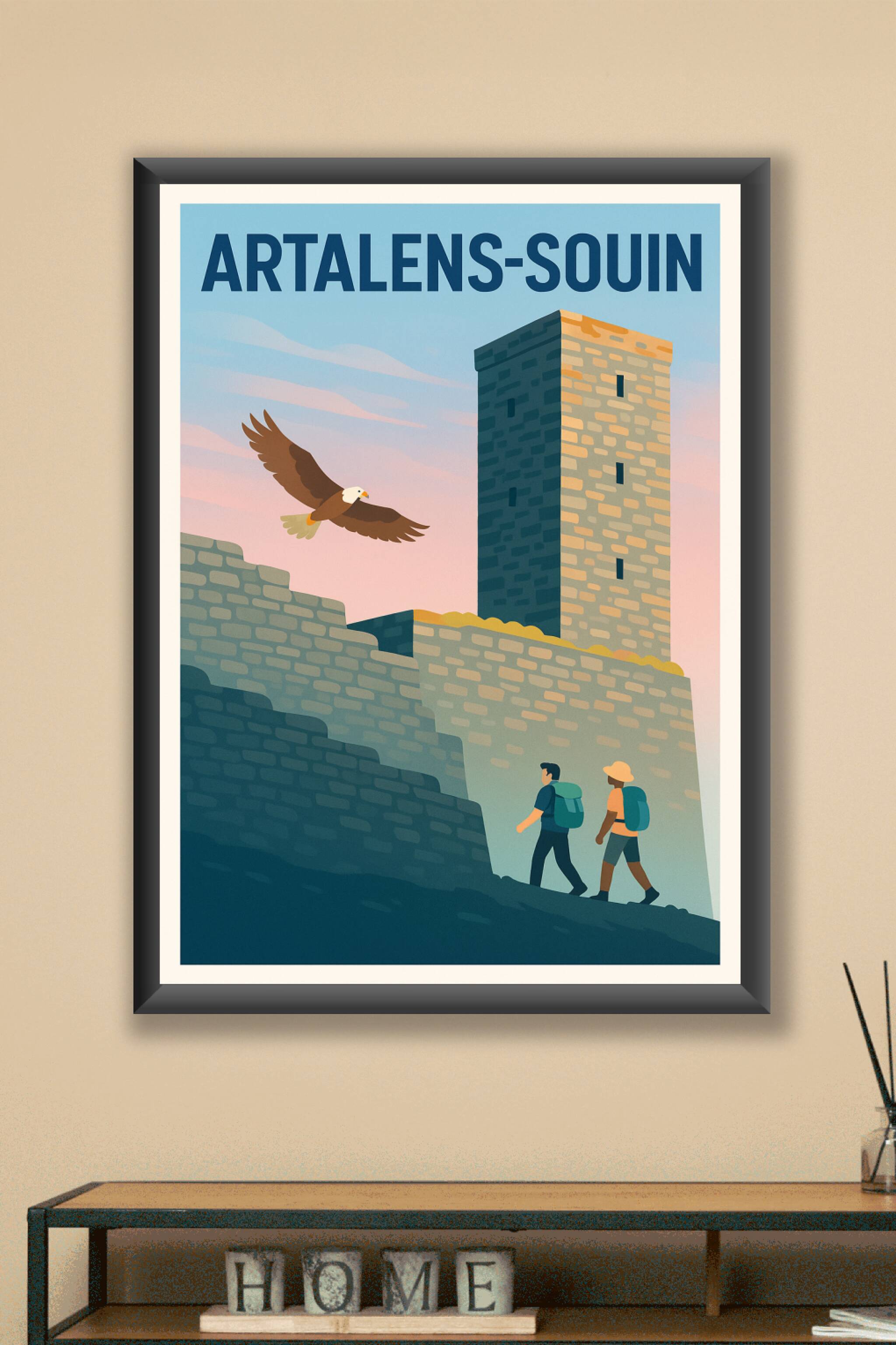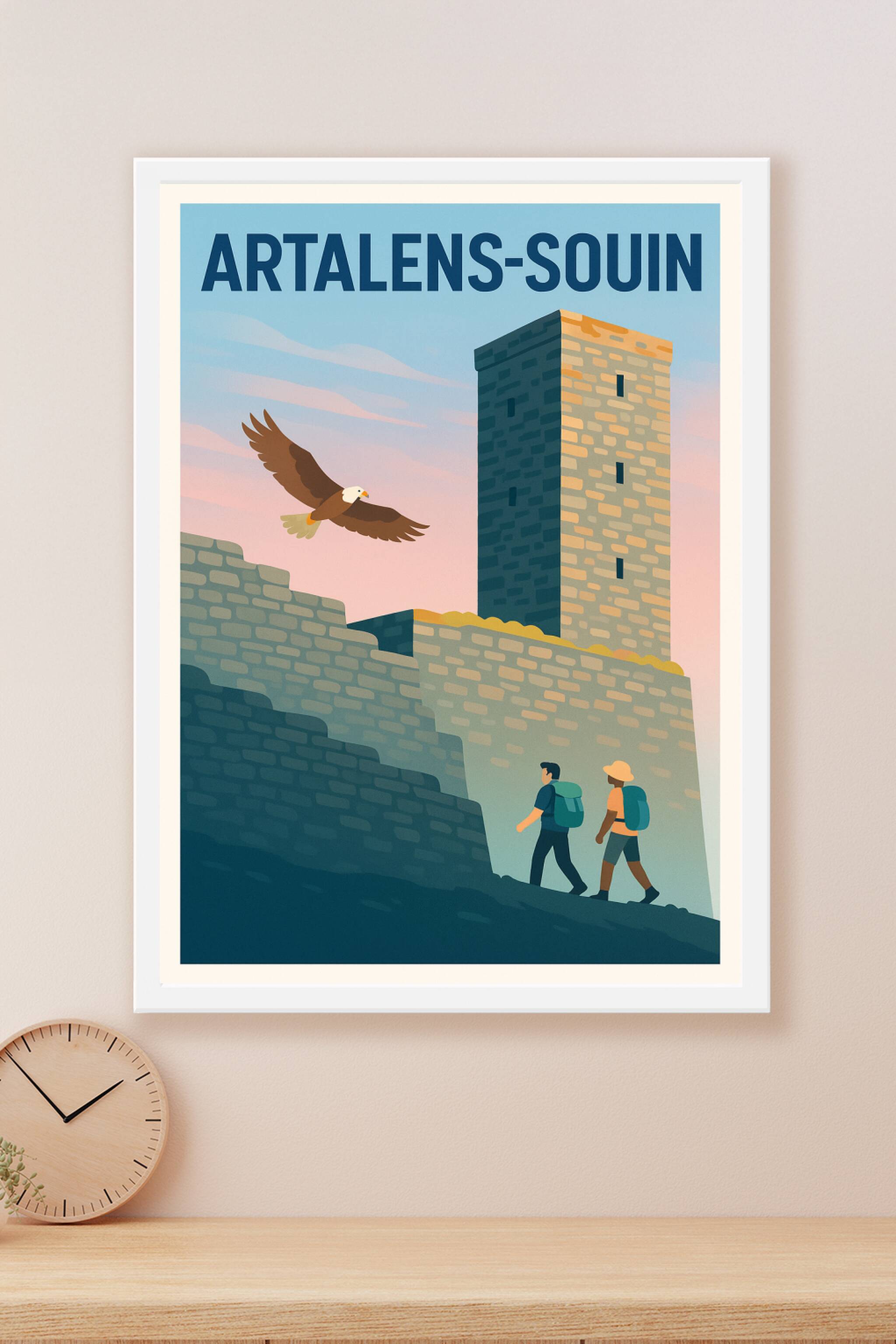 Découvrez la majesté d'Artalens-Souin avec cette affiche illustrée mettant en avant un ancien château fortifié sous un ciel pastel au crépuscule. Deux randonneurs progressent au pied des murailles de pierre, tandis qu'un aigle royal plane dans les airs, symbolisant la liberté et l'aventure.Ce poster de haute qualité est imprimé en tirage "Fine Art" sur un papier premium 305g coton, garantissant une finesse des détails et une richesse des couleurs exceptionnelles. Disponible en plusieurs formats, de A1 à A4, avec ou sans cadre, cette affiche s'adapte parfaitement à tous les intérieurs pour évoquer l'esprit des grands espaces et du patrimoine historique.Profitez d'une impression soignée et 100% fabriquée en France, idéale pour sublimer votre décoration ou offrir un cadeau unique aux amateurs de nature et d'histoire.