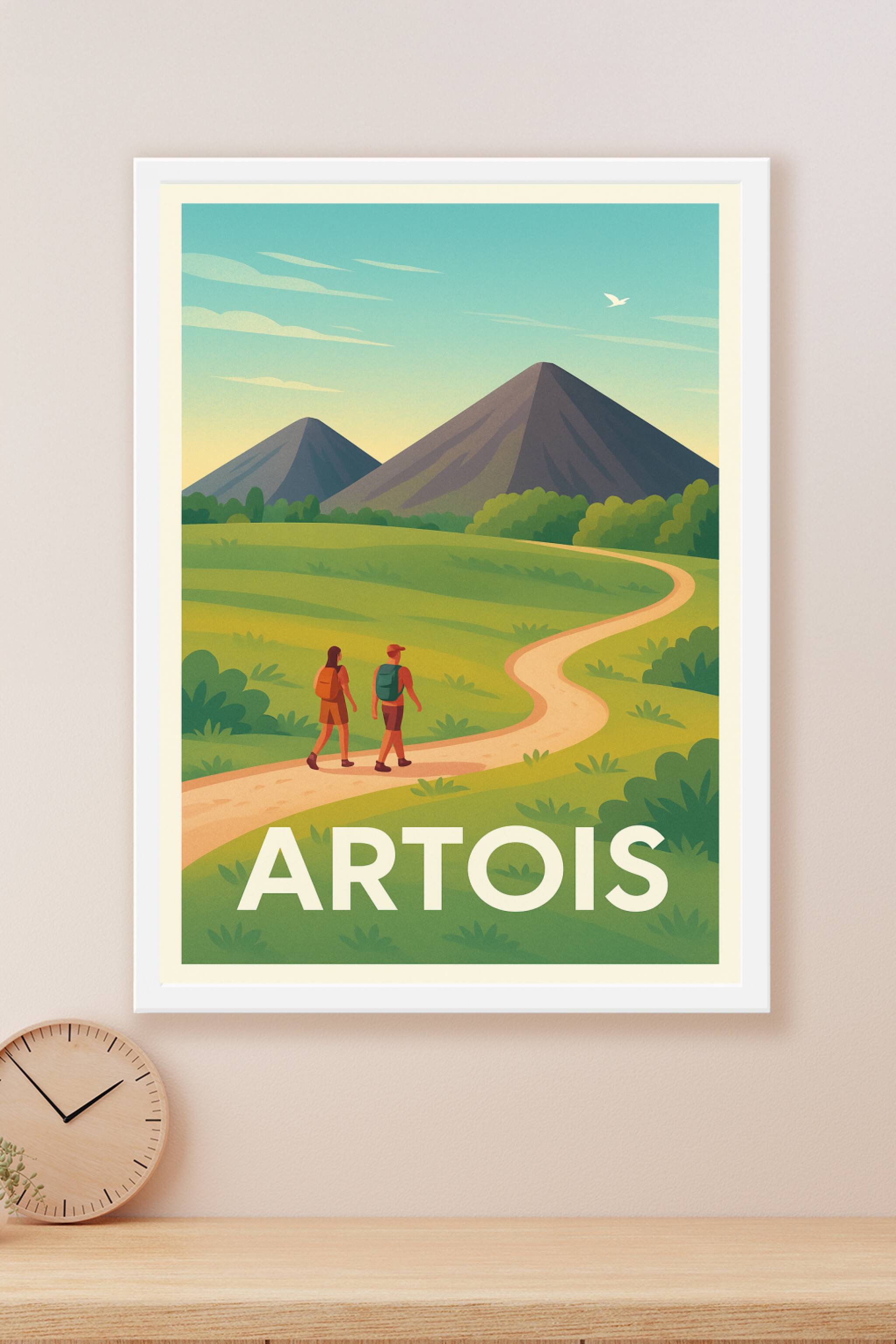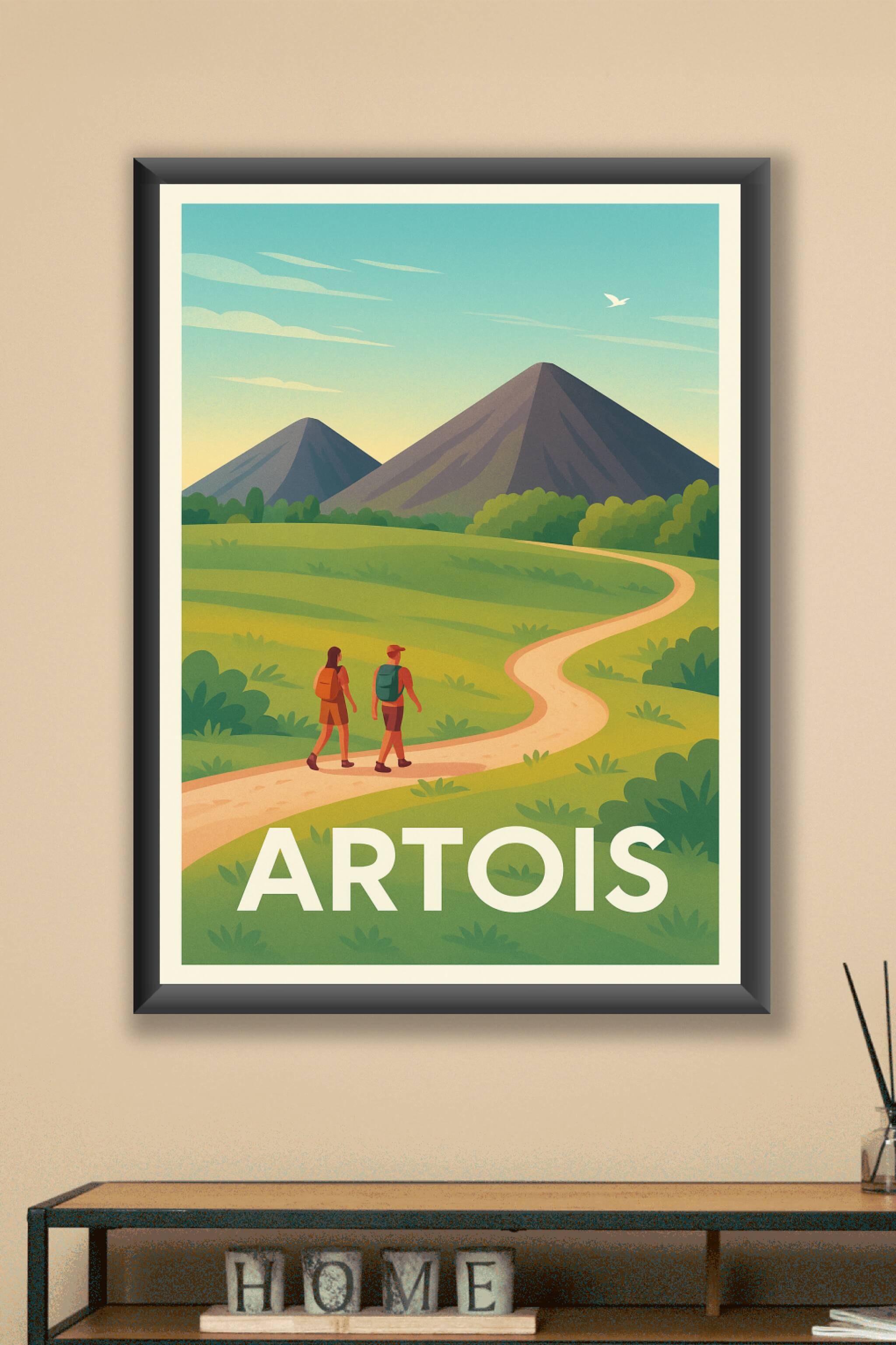 Découvrez la beauté naturelle de l'Artois avec cette affiche stylisée représentant une paisible randonnée au pied de majestueuses montagnes. Cette ...