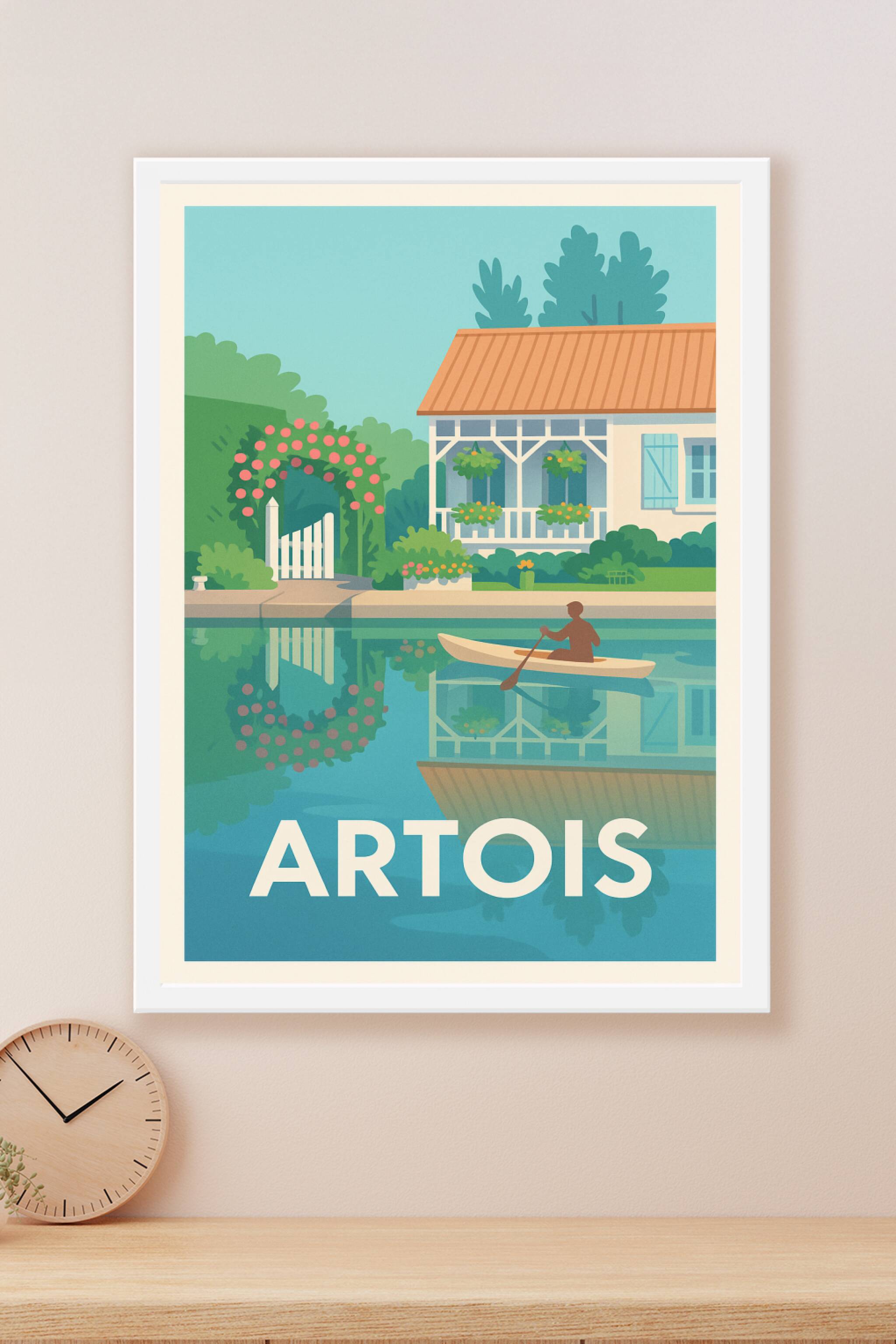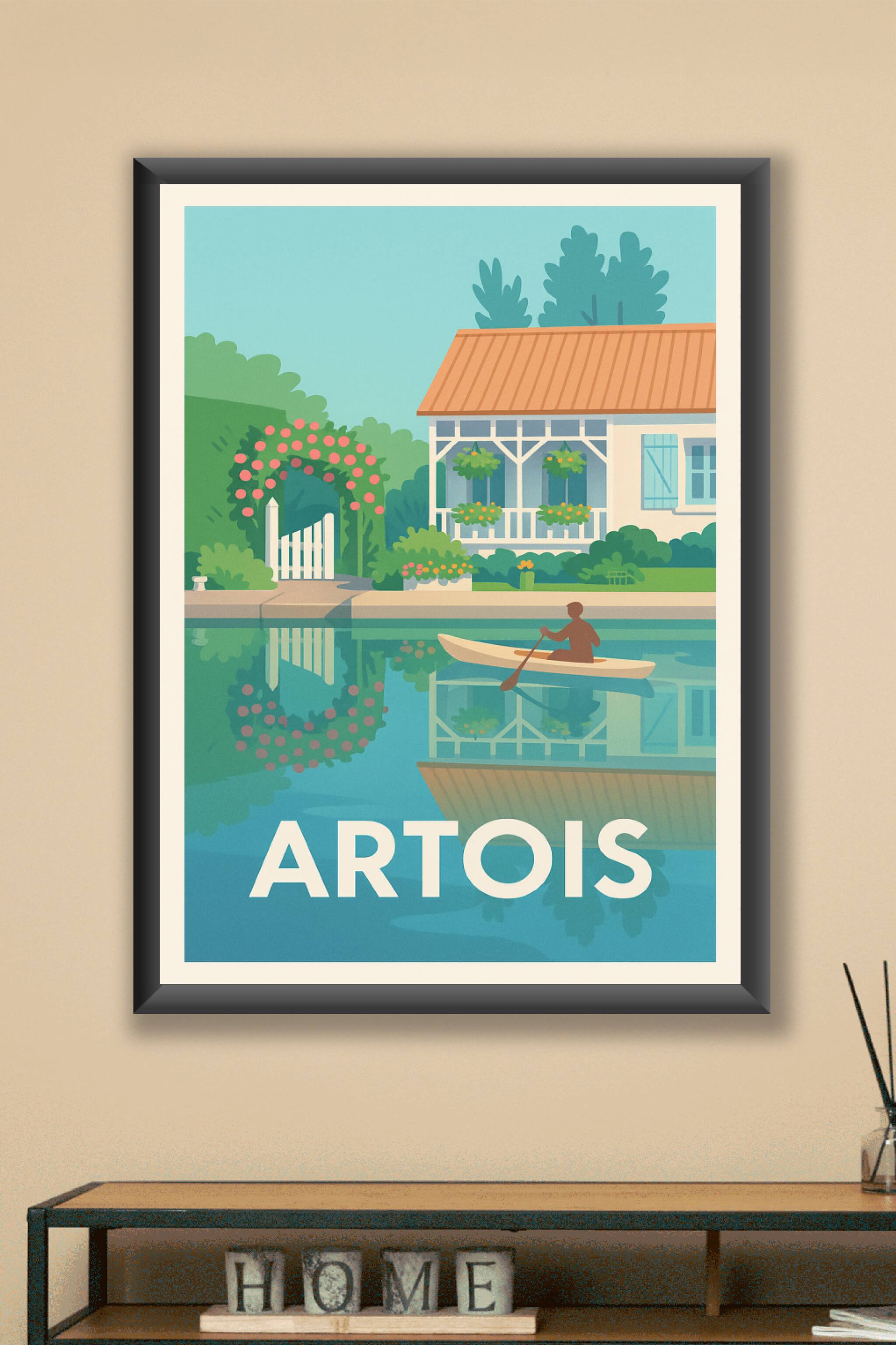 Découvrez la quiétude de la région d'Artois avec cette affiche illustrant une maison charmante au bord de l'eau, entourée de verdure luxuriante et ...
