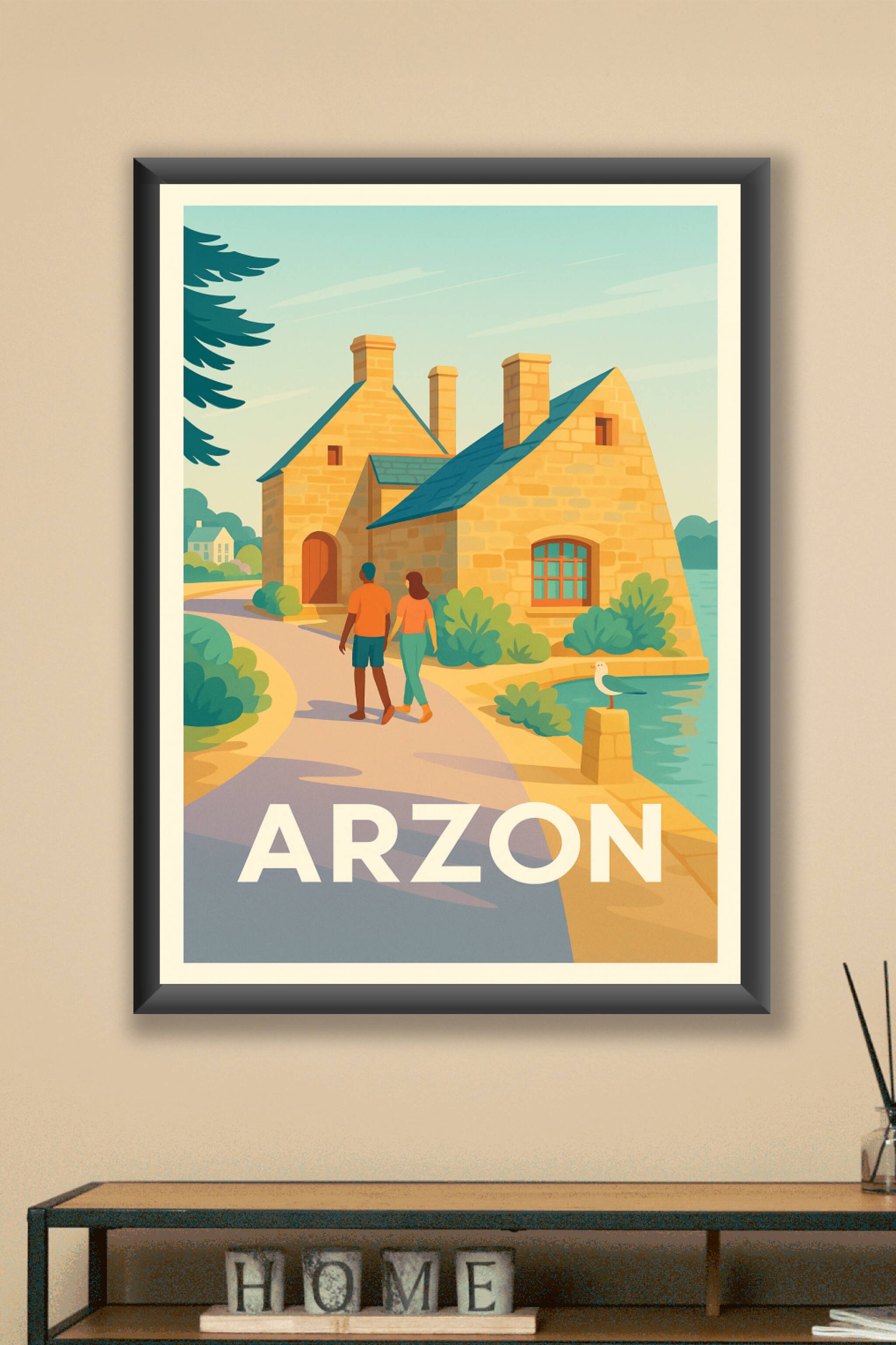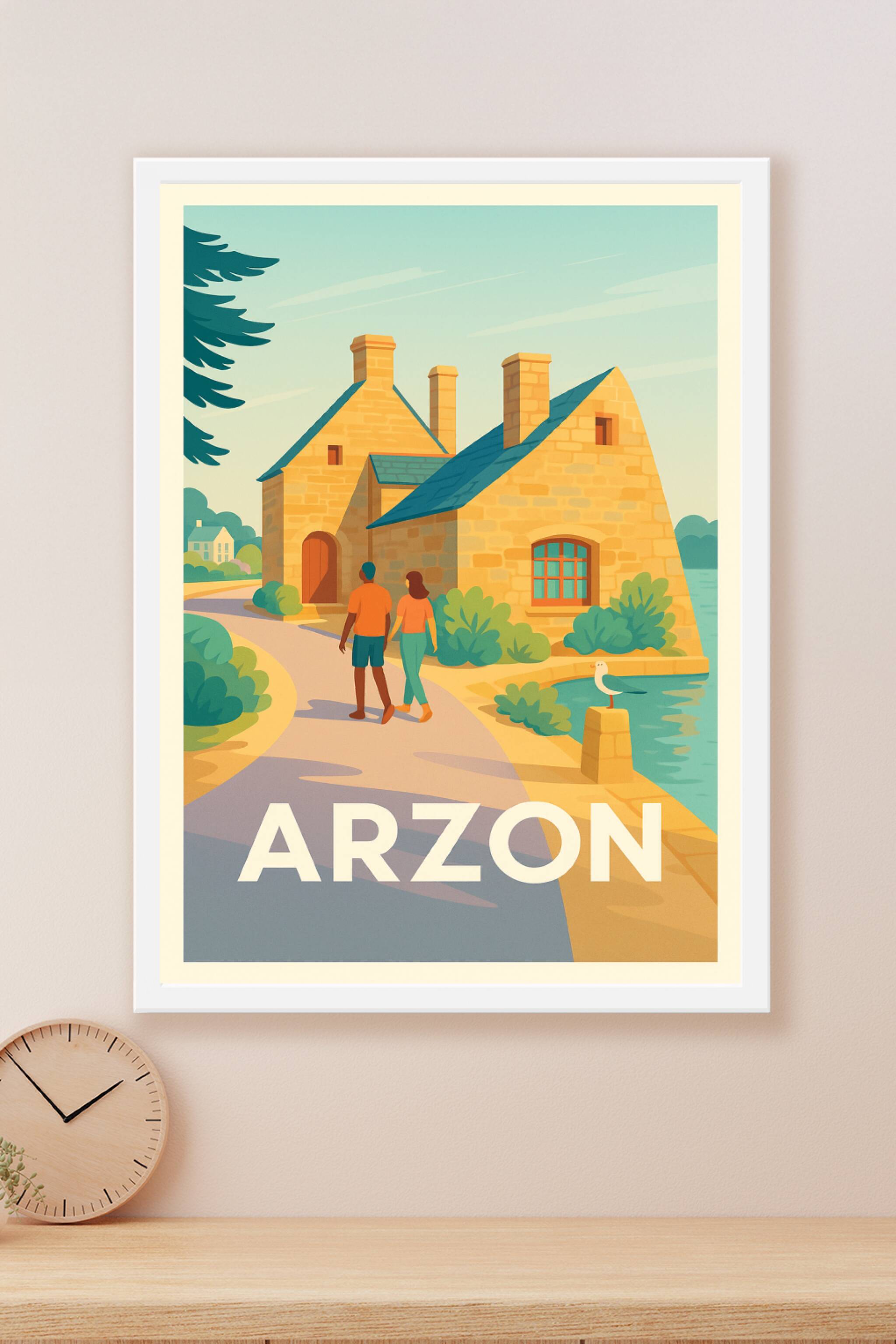 Découvrez la douce sérénité d'Arzon avec cette affiche illustrée, mettant en scène une balade romantique près des maisons en pierre typiques et de ...