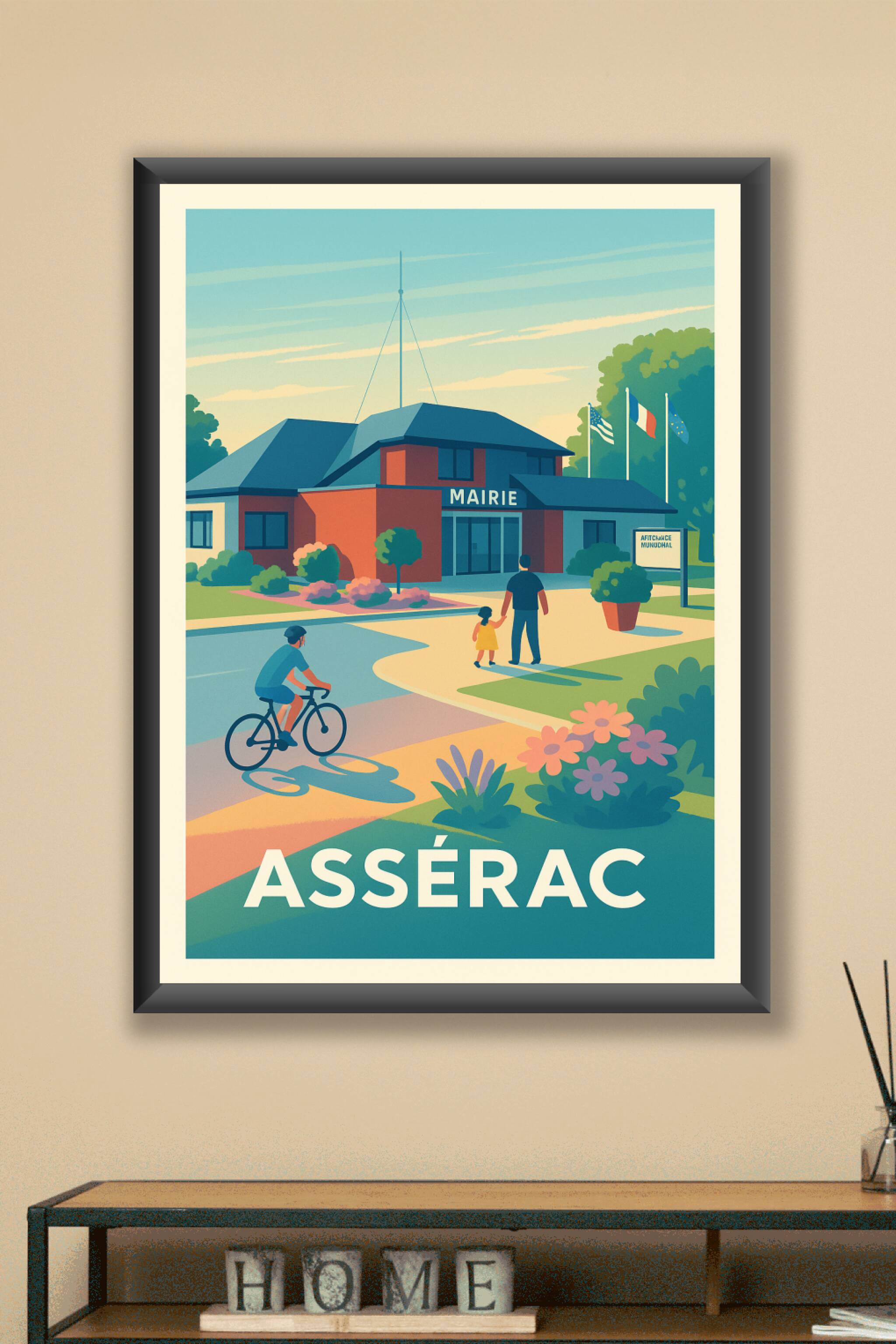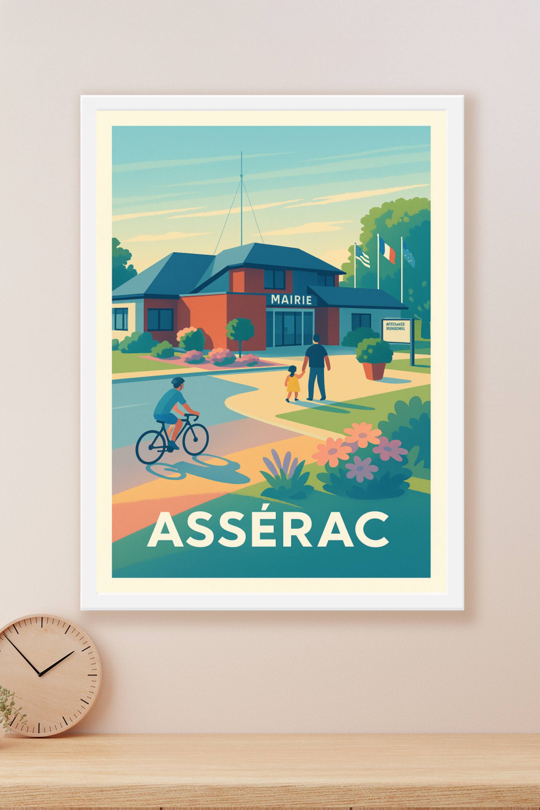 Découvrez le charme paisible d'Assérac avec cette affiche illustrée, mettant en scène la mairie dans une ambiance lumineuse et accueillante. Ce pos...
