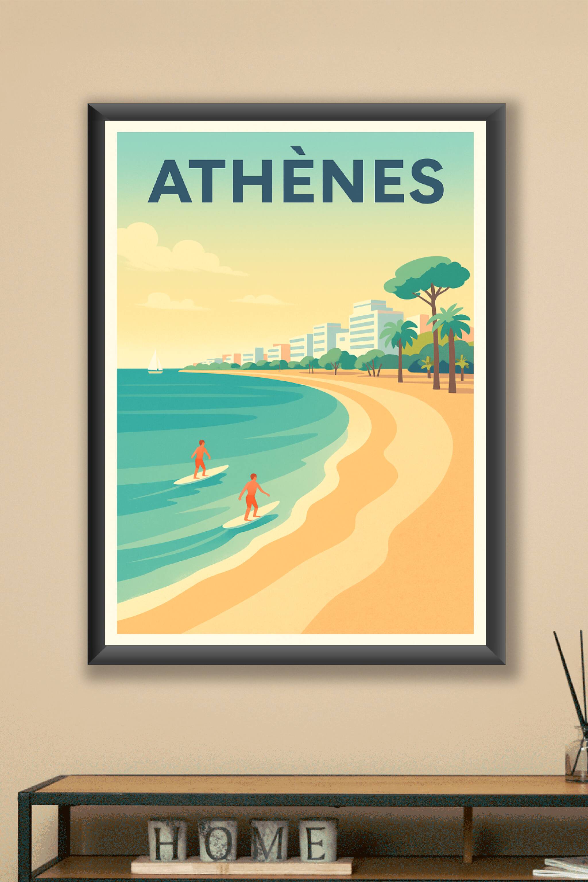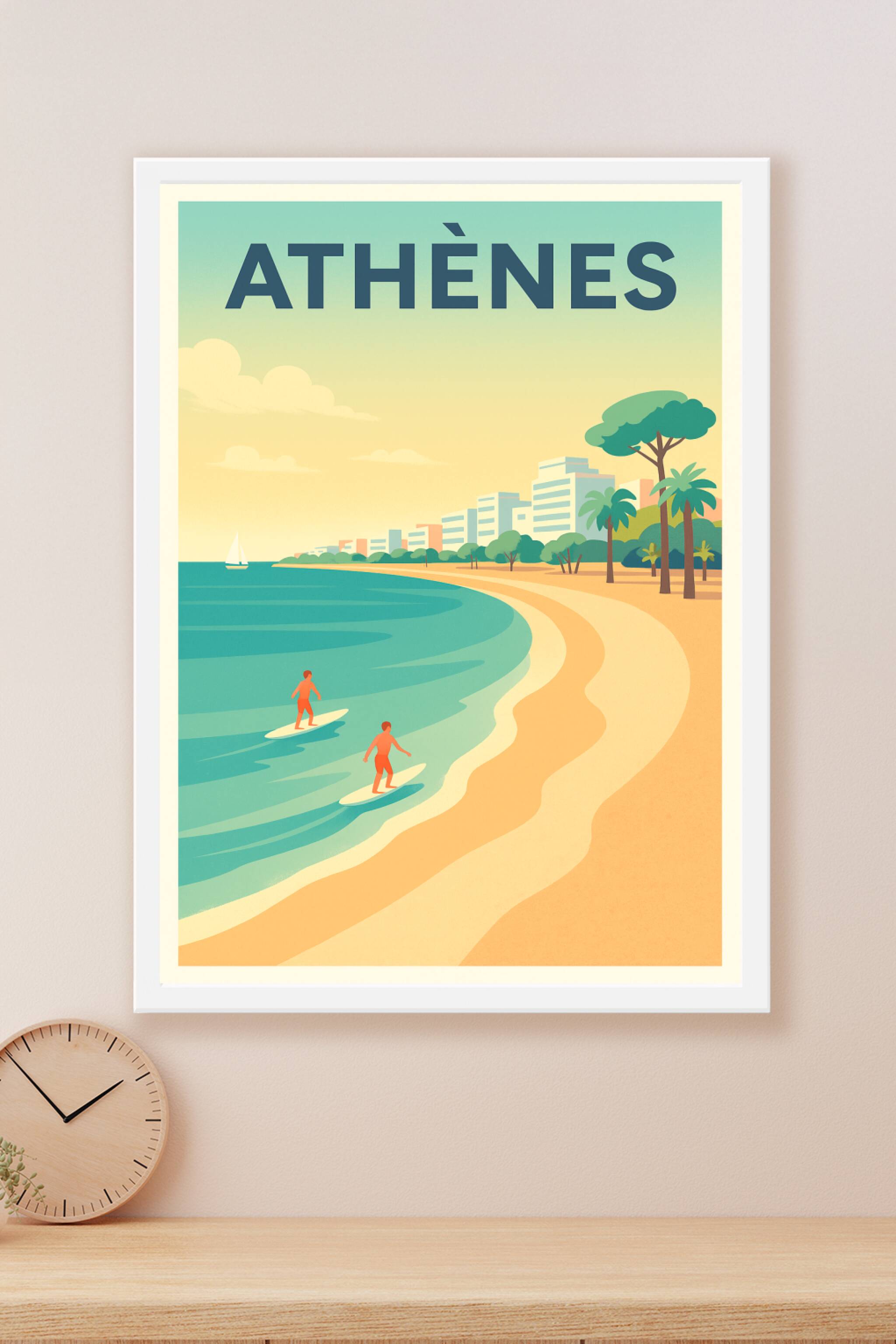 Découvrez l'esprit méditerranéen d'Athènes avec cette affiche illustrée qui capture la douceur d'une journée à la plage, entre surf et nature urbai...