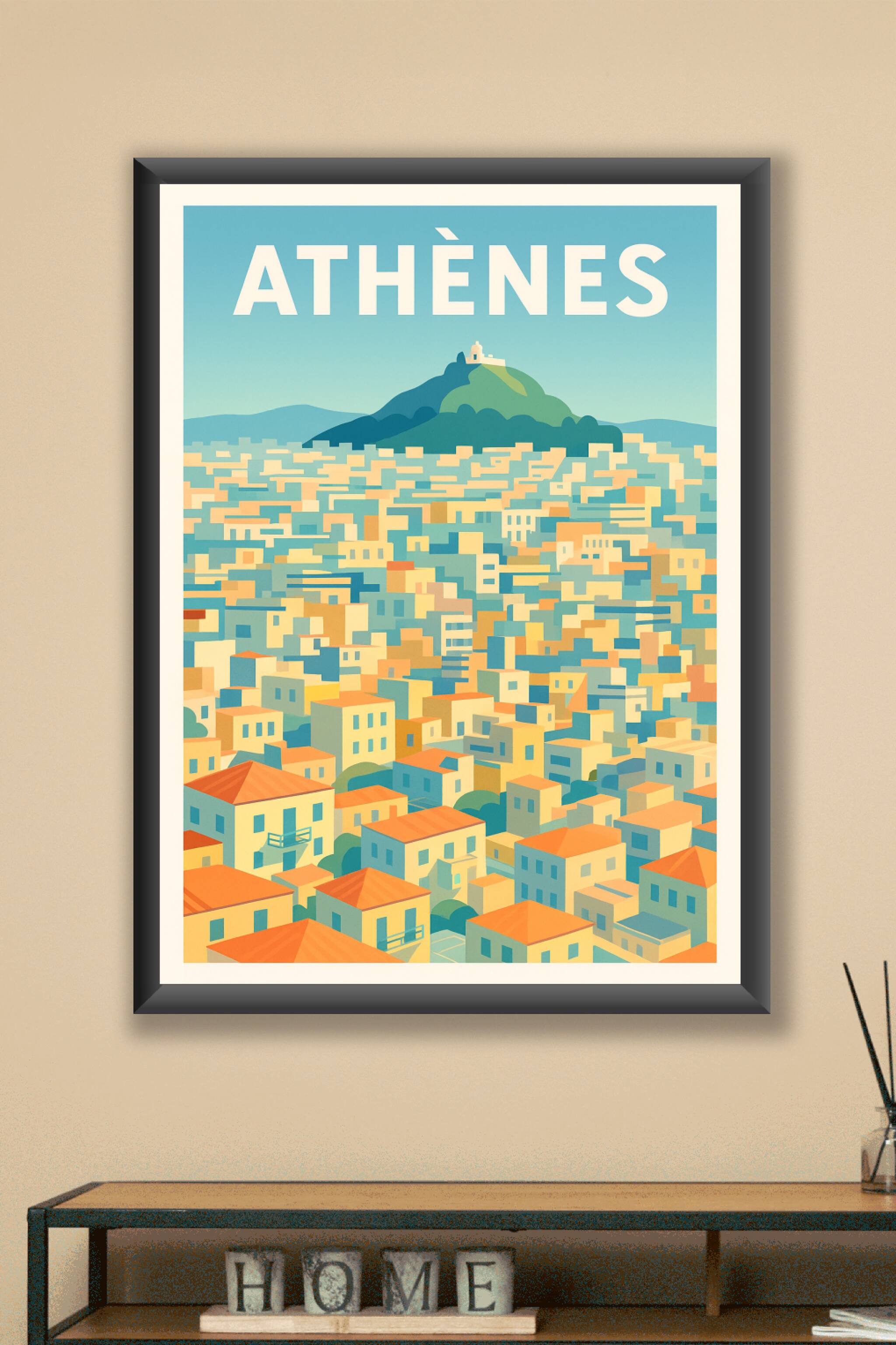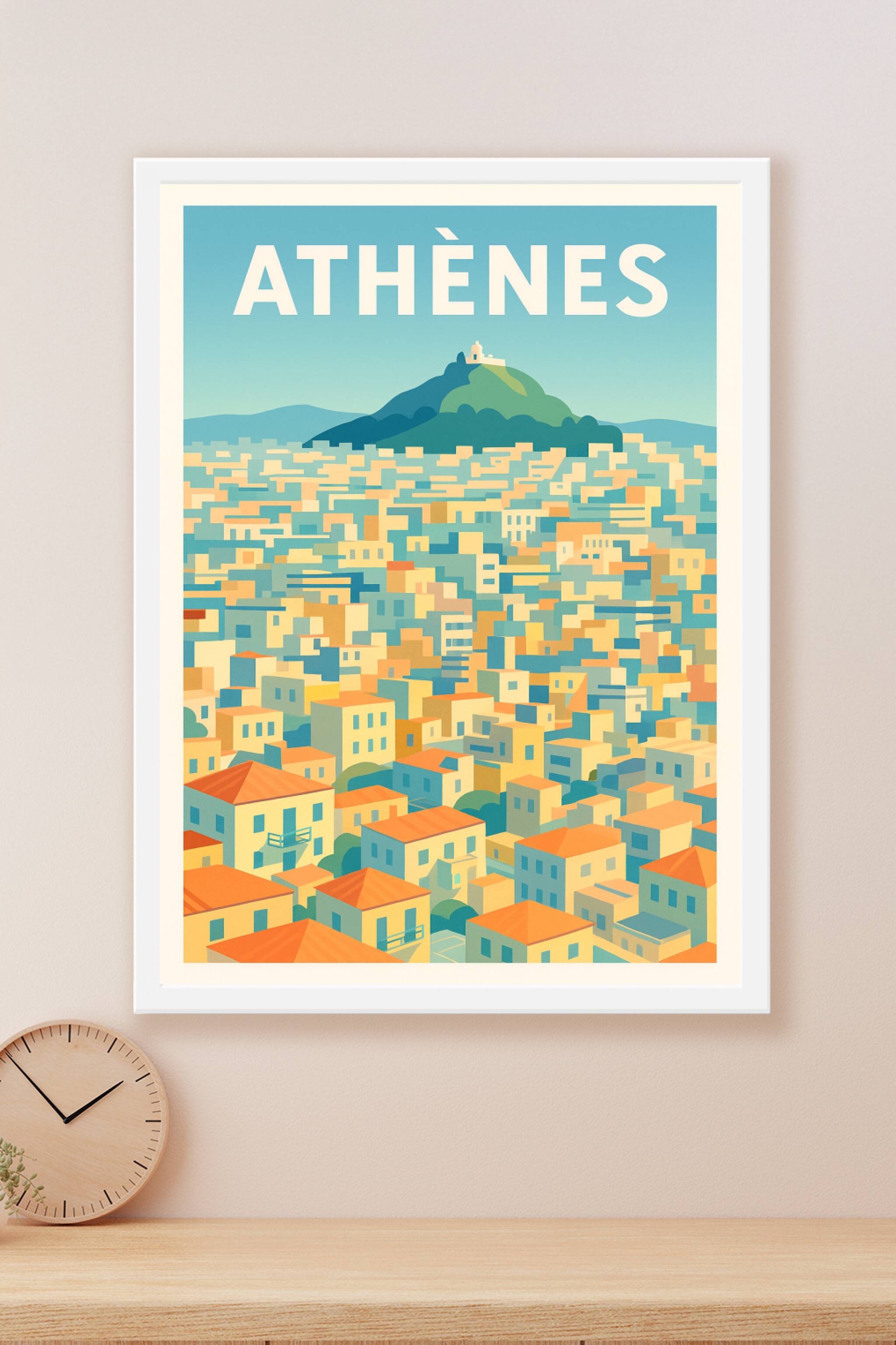 Découvrez cette affiche vibrante qui capture la douce lumière méditerranéenne d'Athènes et ses toits traditionnels ocre. Le poster révèle l'harmoni...